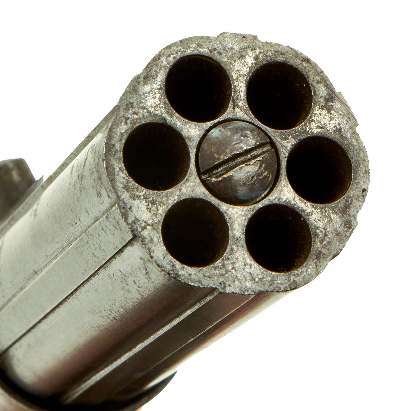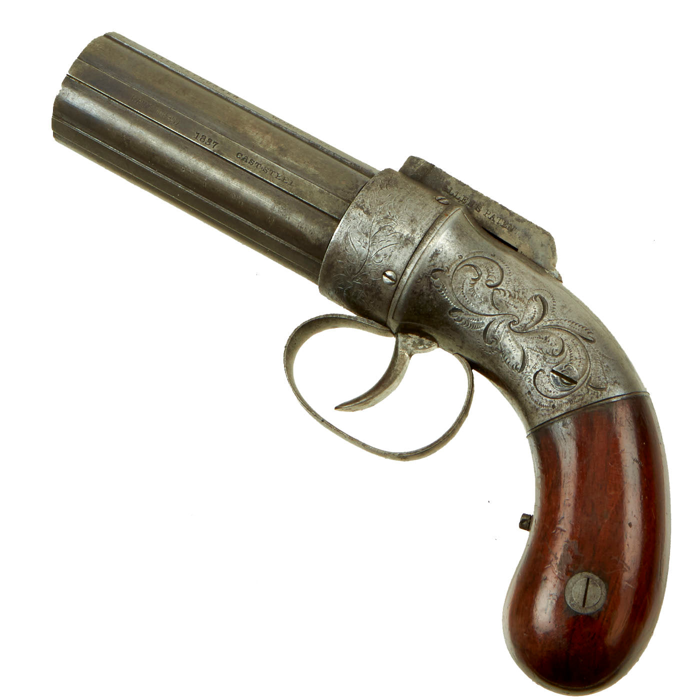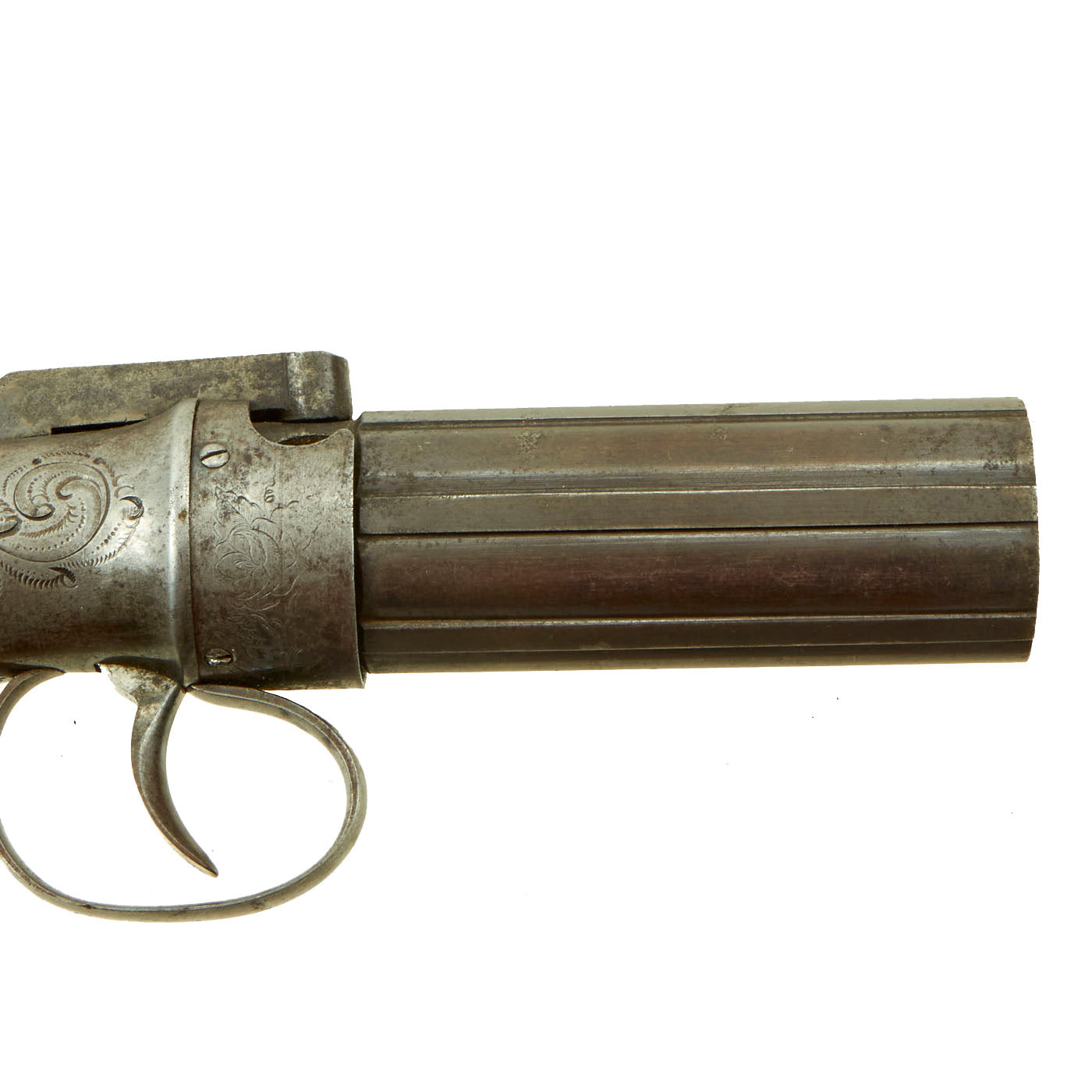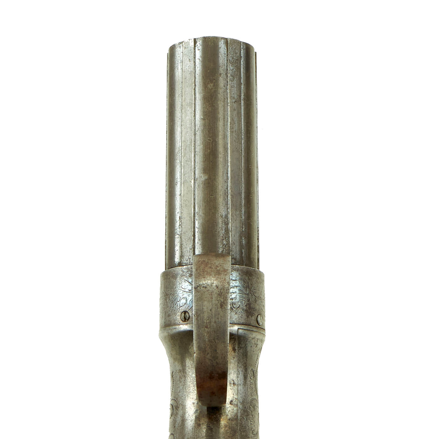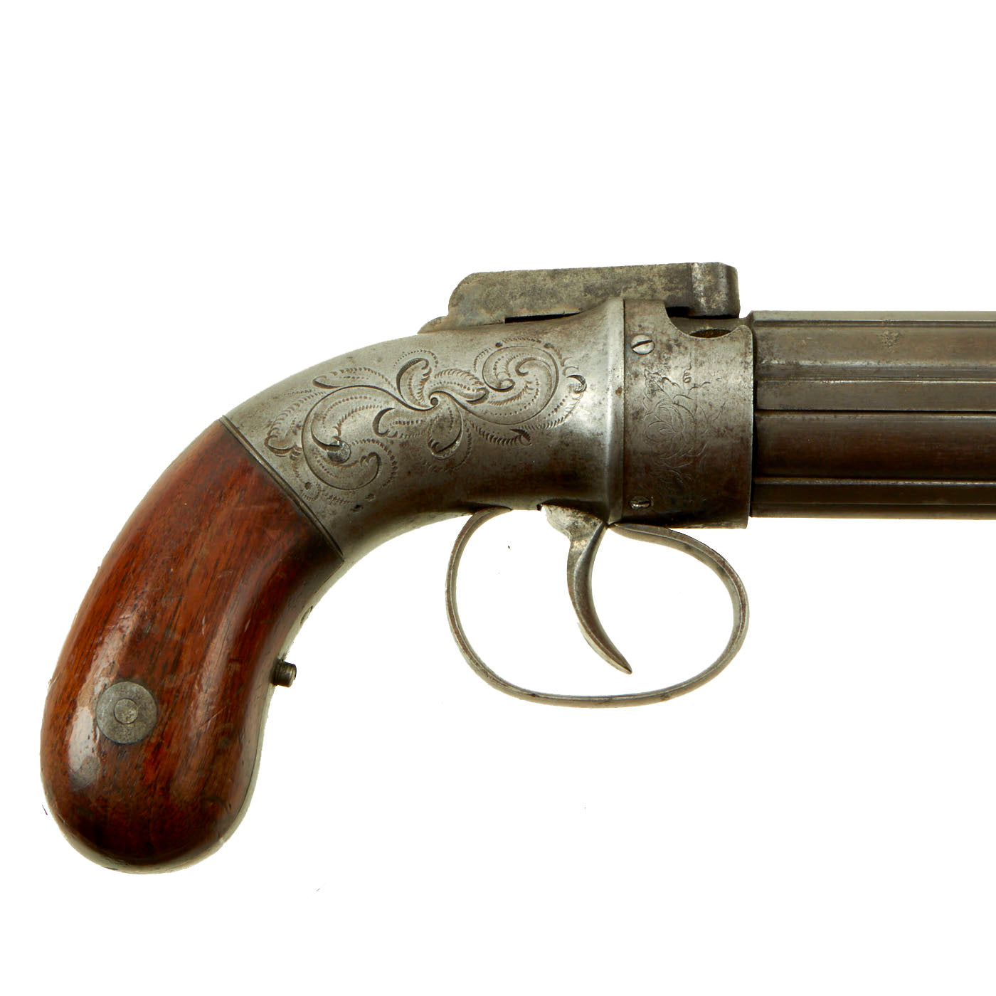 The Pepperbox is in very good used condition, with a lovely patina of age, fully operational but NOT sold for firing. The cylinder / barrel assembly is really in great shape, with the original blued finish faded only slightly to a grayish patina. The action still shows clear details on the engraving, something we almost never see, and the original bright finish is faded to a grayish stained color. There is a bit of powder burn around the cap nipples and on the tube hammer, as to be expected.