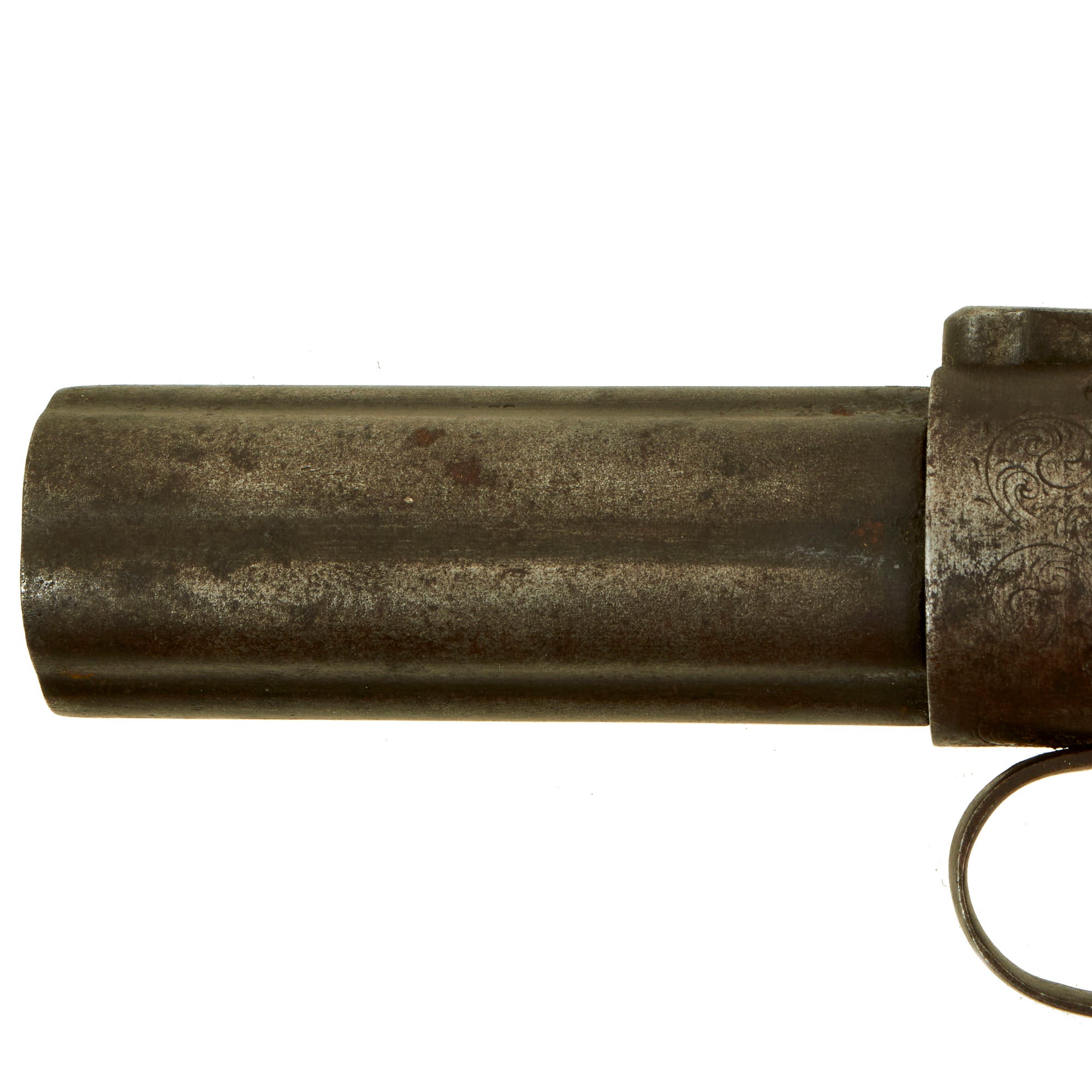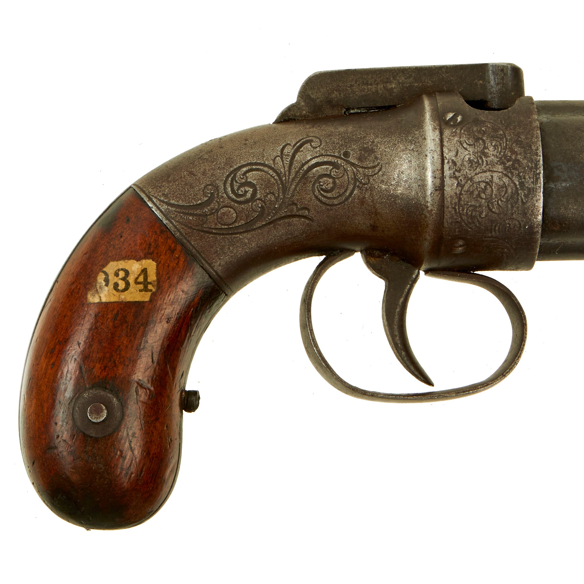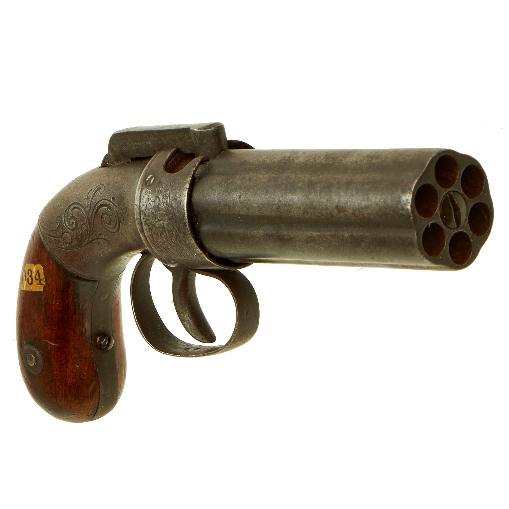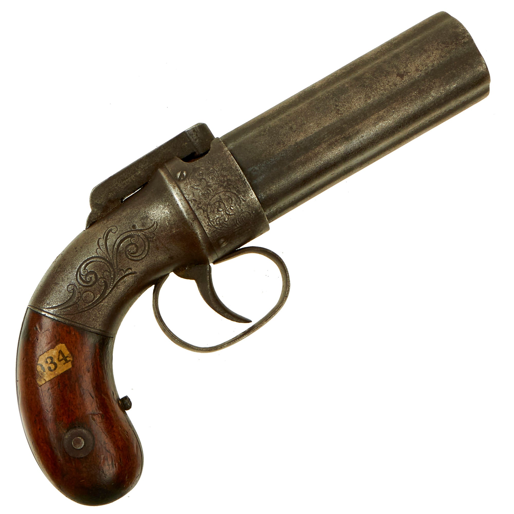 Original Item: Only One Available. Pepperbox revolvers were so named because of the similarity of the front view of the weapon was so reminiscent of a Pepper Pot of the time being a circle of round holes. This example was made by Ethan Allen of Massachusetts (1808-1871). Allen developed his Gun business by taking his brother-in-law Charles Thurber as his partner, originally setting up shop in Norwich, CT, which as a major gun making center at the time. They were one of the earliest makers of pistols in the city, and sources usually cite 1842 as when they began production, though some use 1835 as the start date.