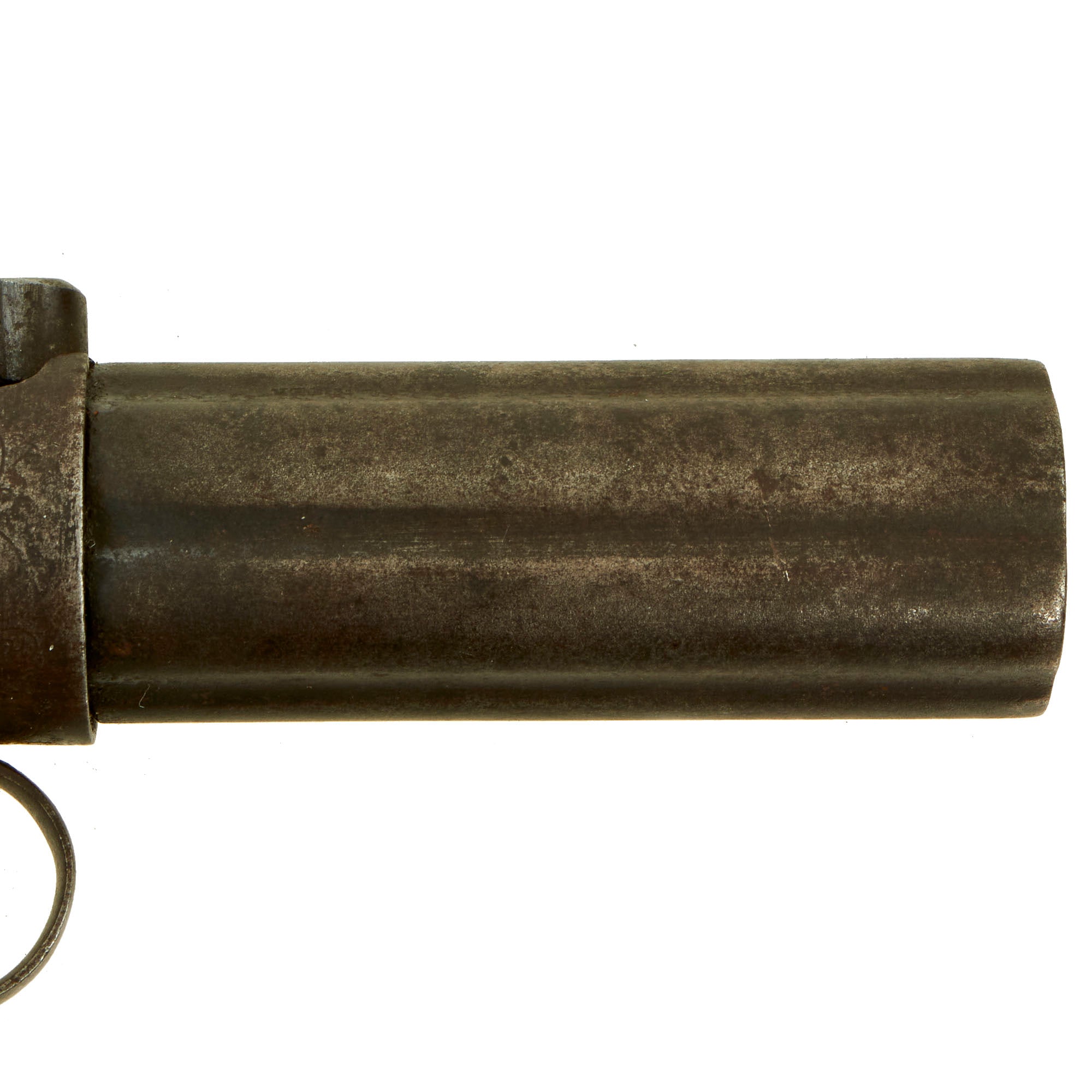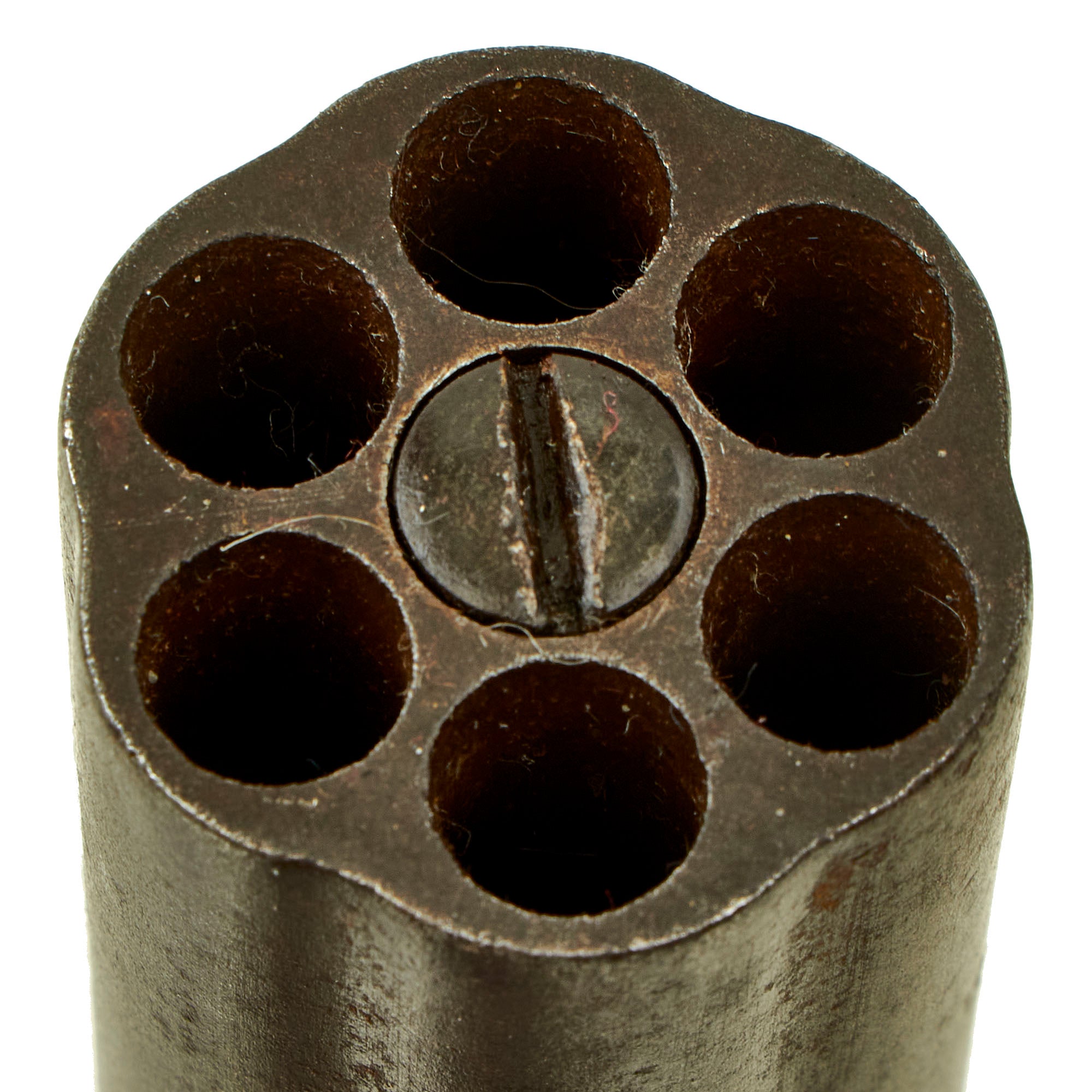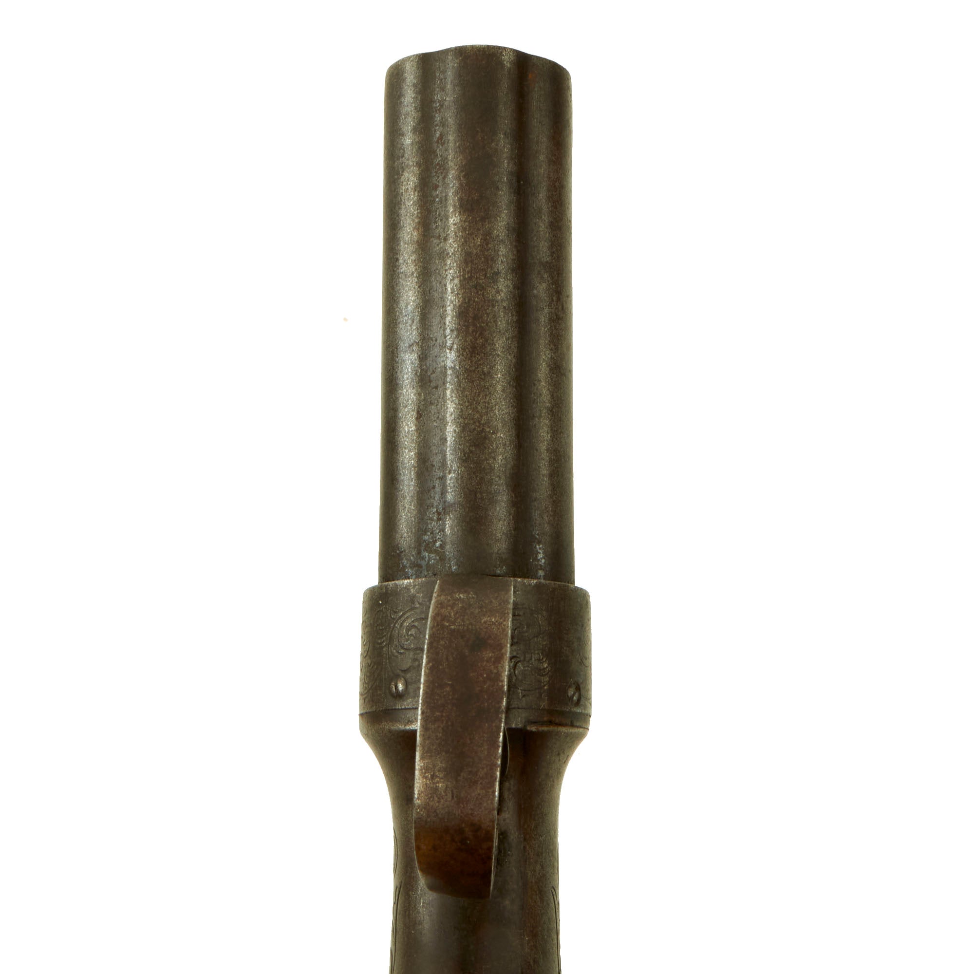 The Pepperbox is in very good used condition, with a lovely patina of age, fully operational but NOT sold for firing. The tube hammer is in good shape, and functions well. There is overall oxidation and powder burn on the frame and barrel, which has made the markings somewhat faint. It does not look to have been majorly cleaned or refinished, and the action AND recoil shield both still show clear foliate engraving, something we almost never see! There is definitely powder burn around the cap nipples and on the tube hammer, as to be expected. The walnut grips have a lovely color, and show some great period wear. They still retain most of the original "piano varnish" finish used at the time. There looks to be an old collection tag on the right grip scale.