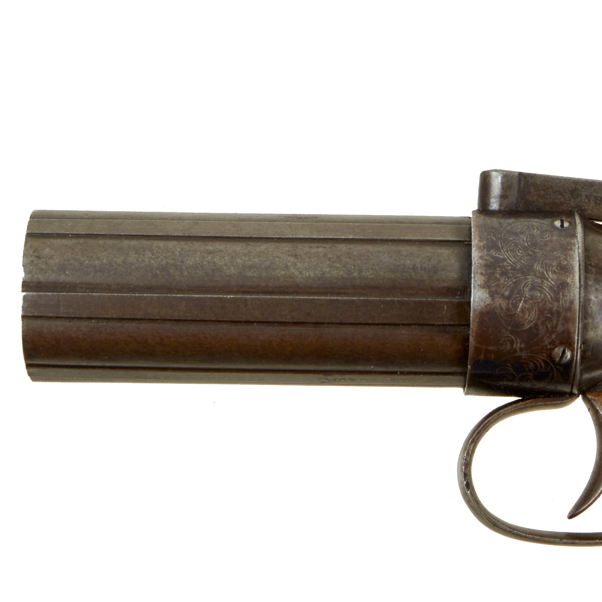 Original Item: Only One Available. Pepperbox revolvers were so named because of the similarity of the front view of the weapon was so reminiscent of a Pepper Pot of the time being a circle of round holes. This example was made by Ethan Allen of Massachusetts (1808-1871). Allen developed his Gun business by taking his brother-in-law Charles Thurber as his partner, originally setting up shop in Norwich, CT, which as a major gun making center at the time. They were one of the earliest makers of pistols in the city, and sources usually cite 1842 as when they began production, though some use 1835 as the start date. Ethan Allen, no relation to the Revolutionary Ethan Allen, had applied for various patents, most notably early on for a "TUBE HAMMER" ignition system in 1837, which was renewed in 1845.