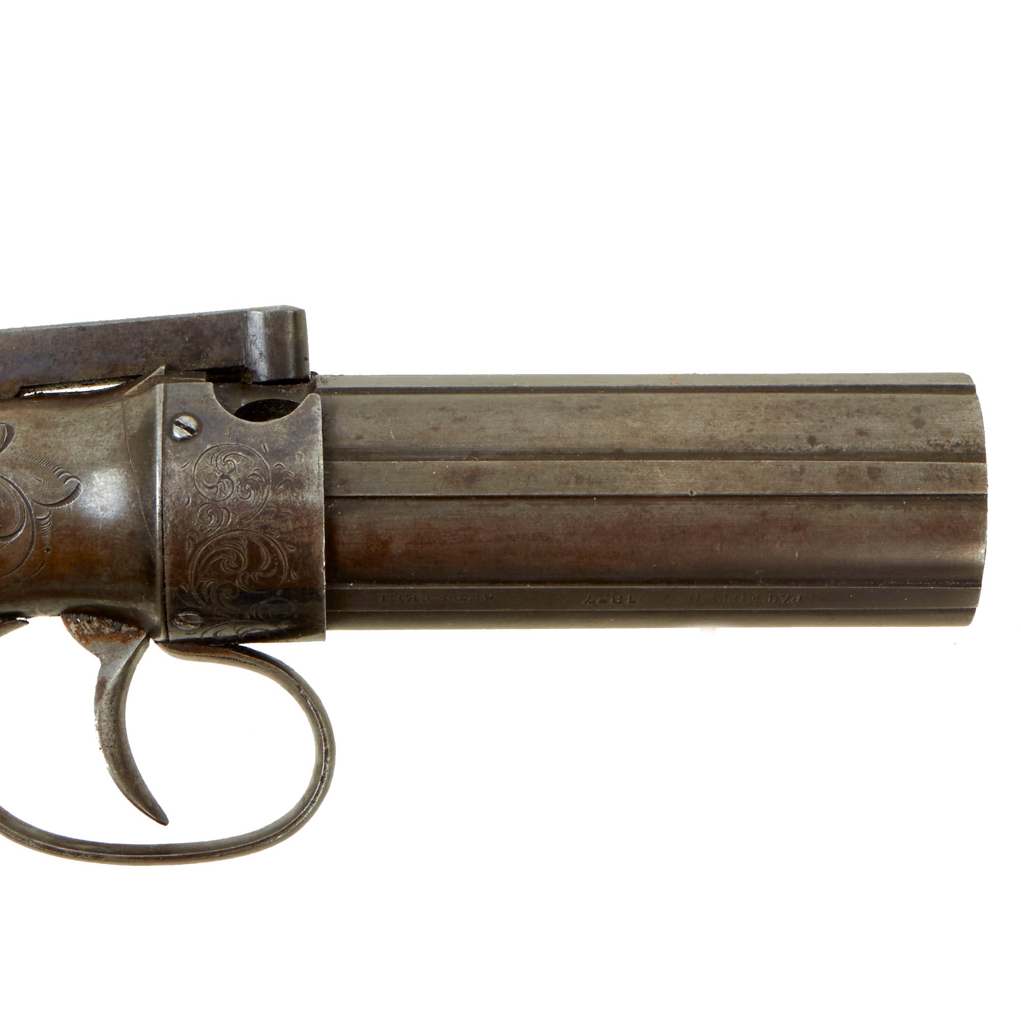 The Pepperbox is in very good used condition, with a lovely patina of age, mostly operational but NOT sold for firing. The action functions correctly, with a good cylinder lockup and a crisp dry fire. The tube hammer is in good shape, and functions well. The cylinder / barrel assembly is really in very nice shape, with the original blued finish faded to a lovely polished gray steel patina, and even a little bit of original bluing. The action still shows clear details on the engraving, something we almost never see, and there is even much still present on the recoil shield, which actually still retains the bluing on the lower side! There is some light powder burn around the cap nipples and on the tube hammer, as to be expected.