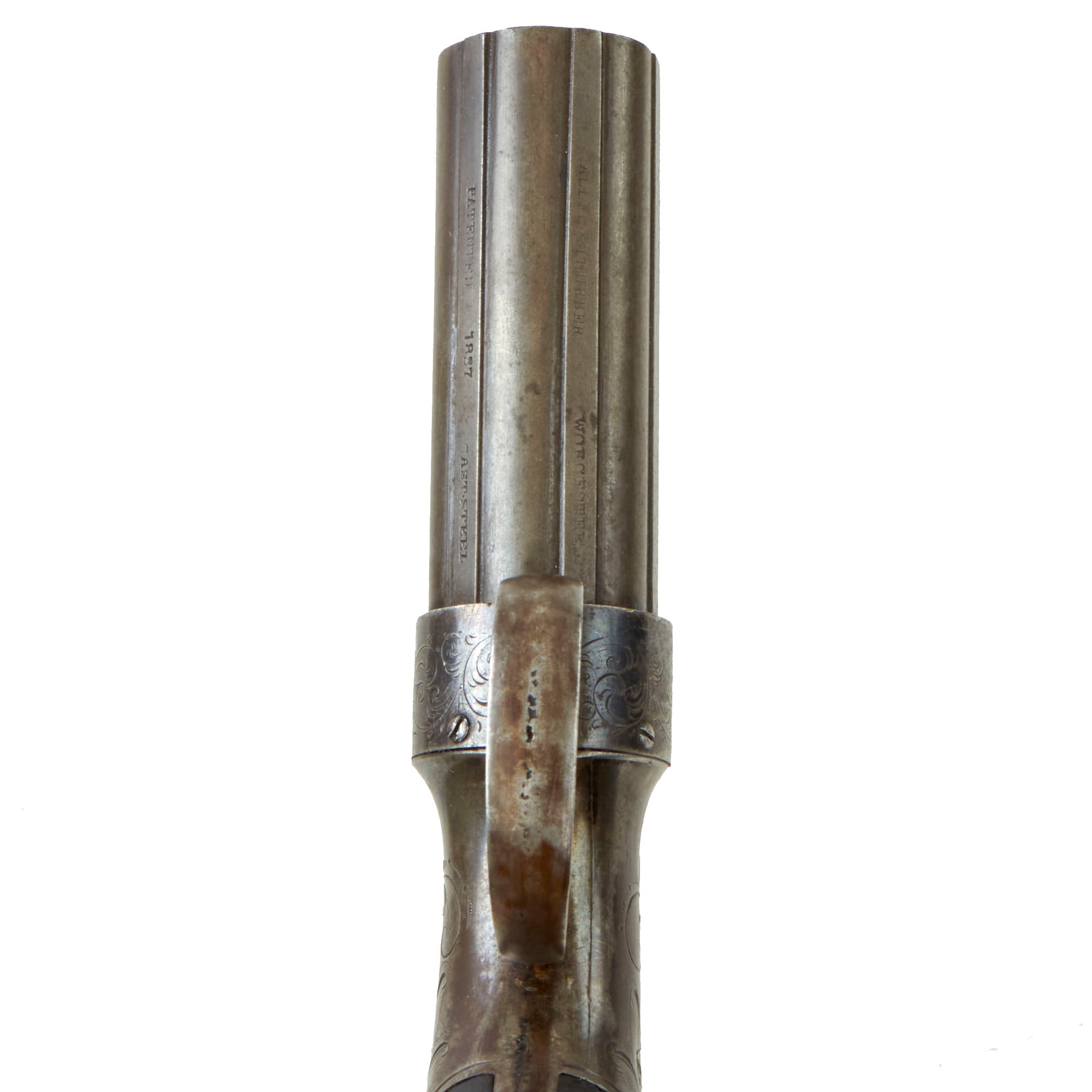 The walnut grips have a lovely color, and show some great period wear. The original factory "piano varnish" is completely worn away, and the left grip shows some water and rust staining from use. This is really a very nice example of an "Allen Pepperbox" revolver, with lovely markings.