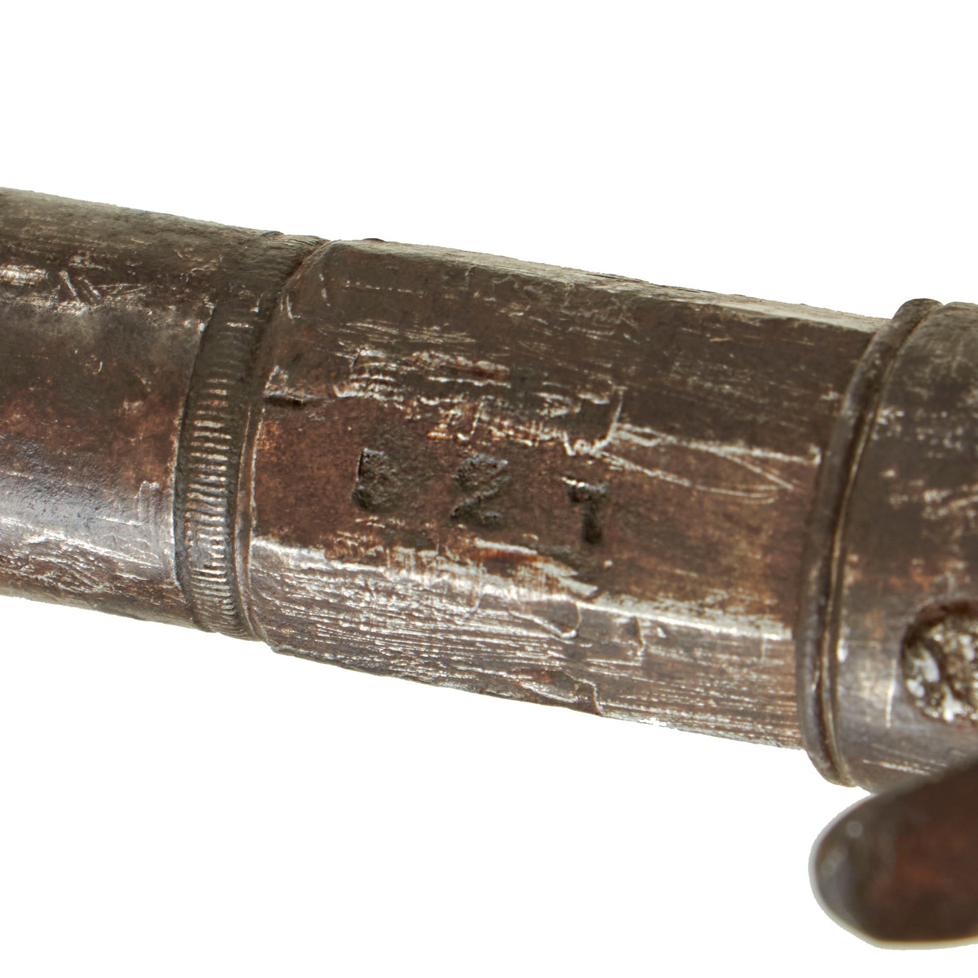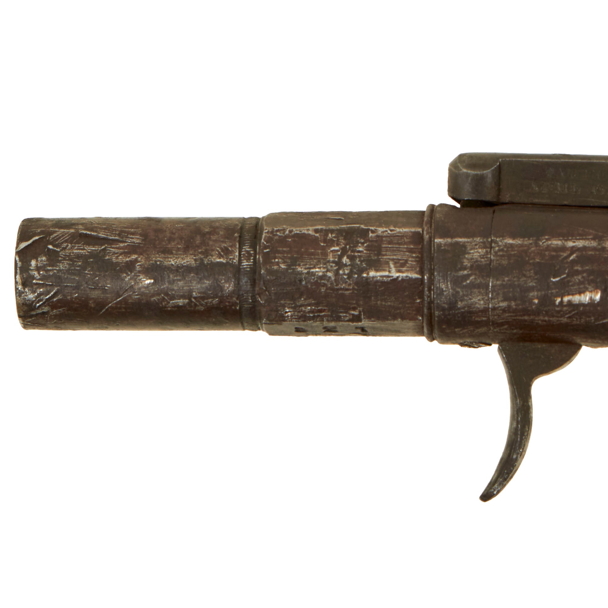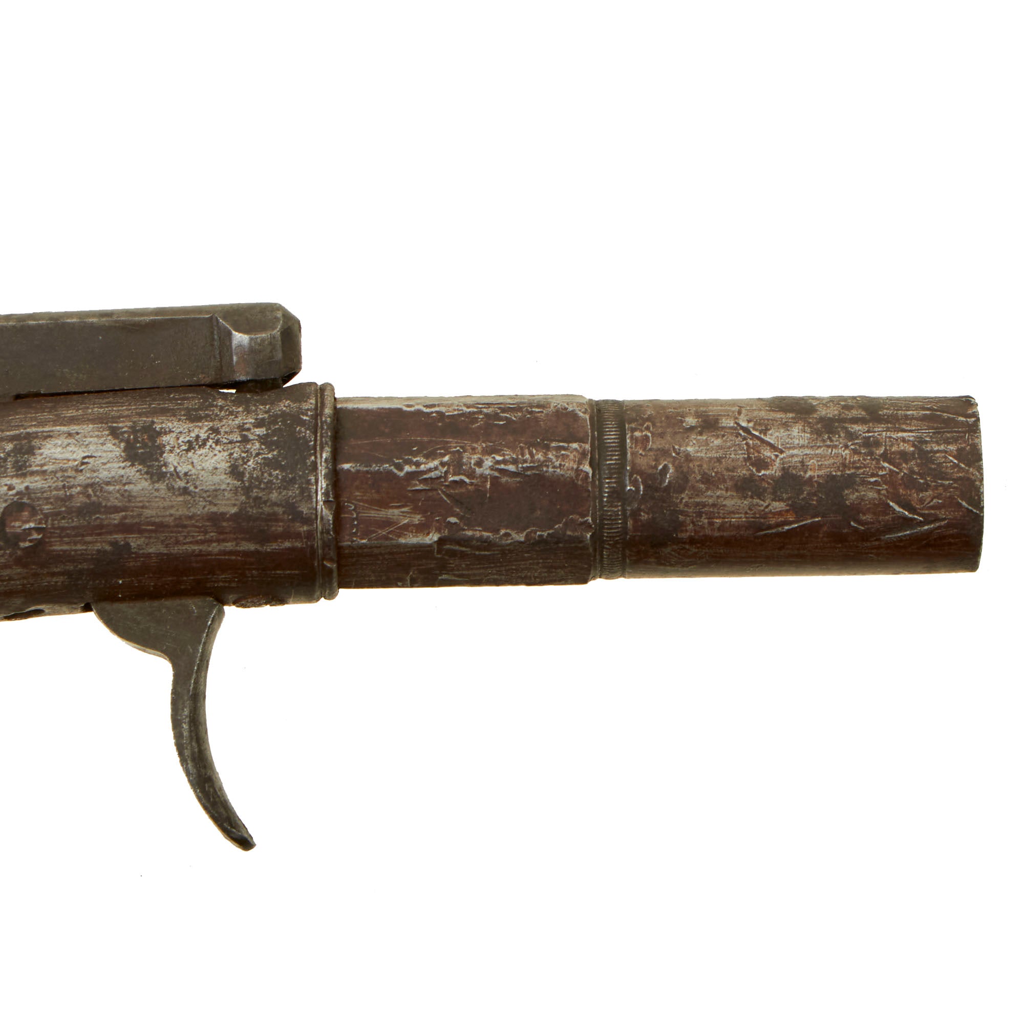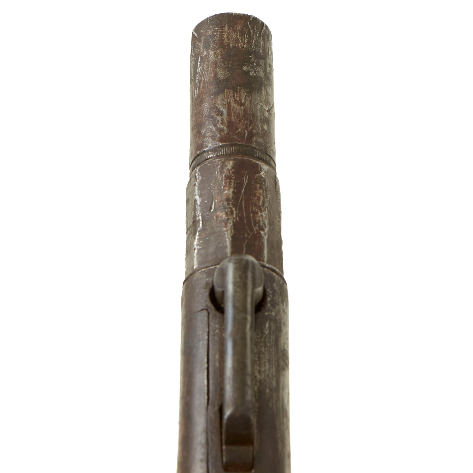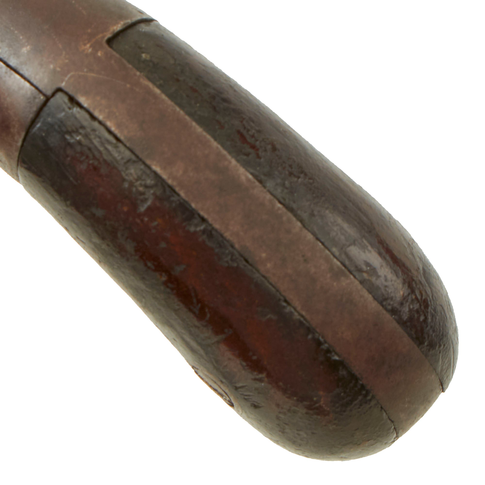 The pistol features lovely bag-style walnut grip plates, which are quite attractive, still retaining much of the original varnish. There are no chunks missing, though the right side grip scale has a crack running down from the screw fitting to the bottom. The pistol does not have a trigger guard, however examining the frame shows that it did have one at one point, but it is was removed for some reason. The condition is very good considering the age, and it shows a very nice lightly oxidized patina patina over the frame and action. It functions correctly, and the bore is in good shape, though it has surface oxidation. There is also marring to the barrel from attempts to free the seized barrel in the past.