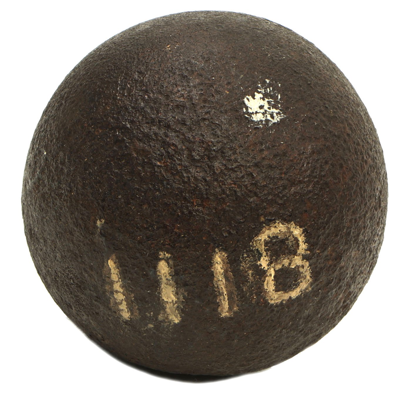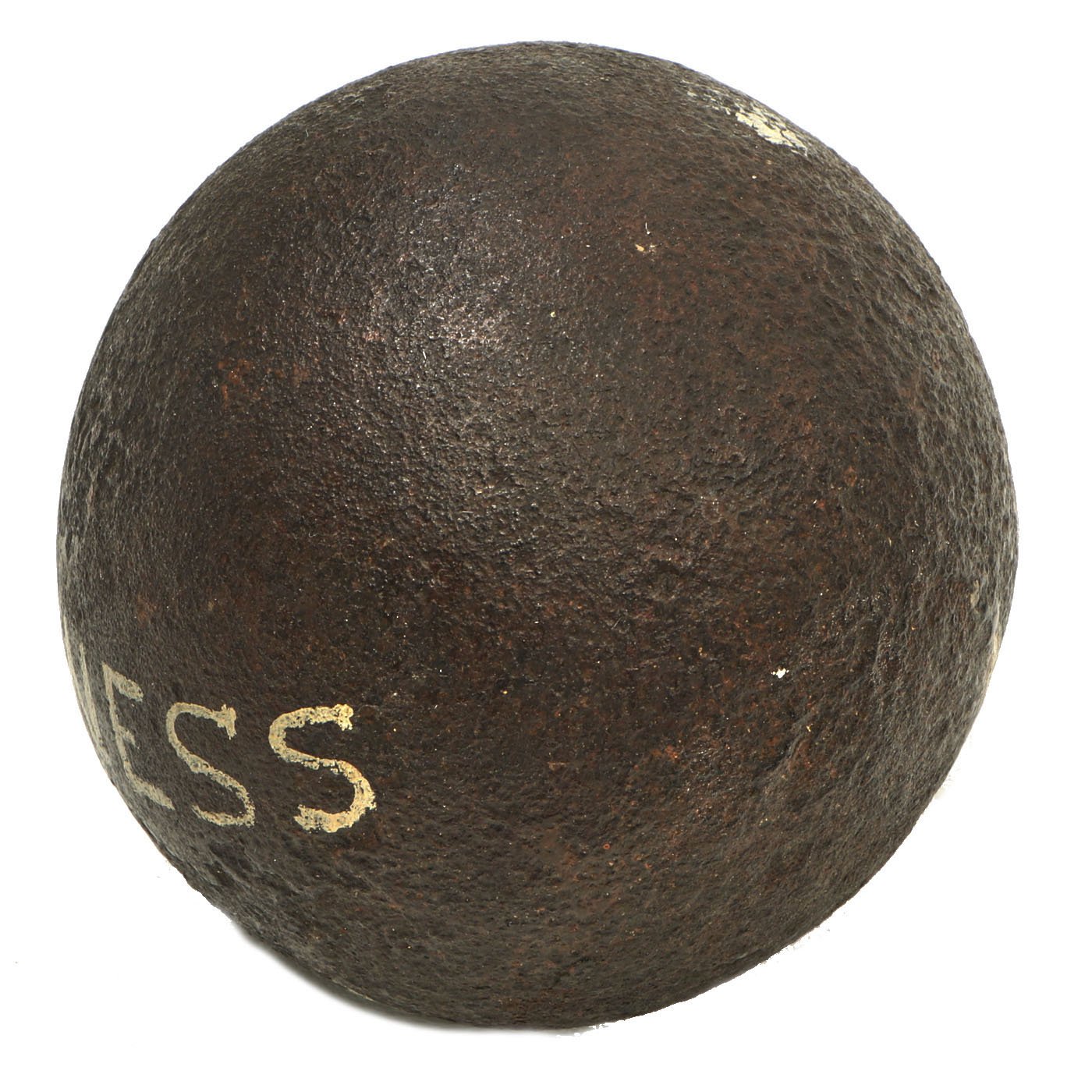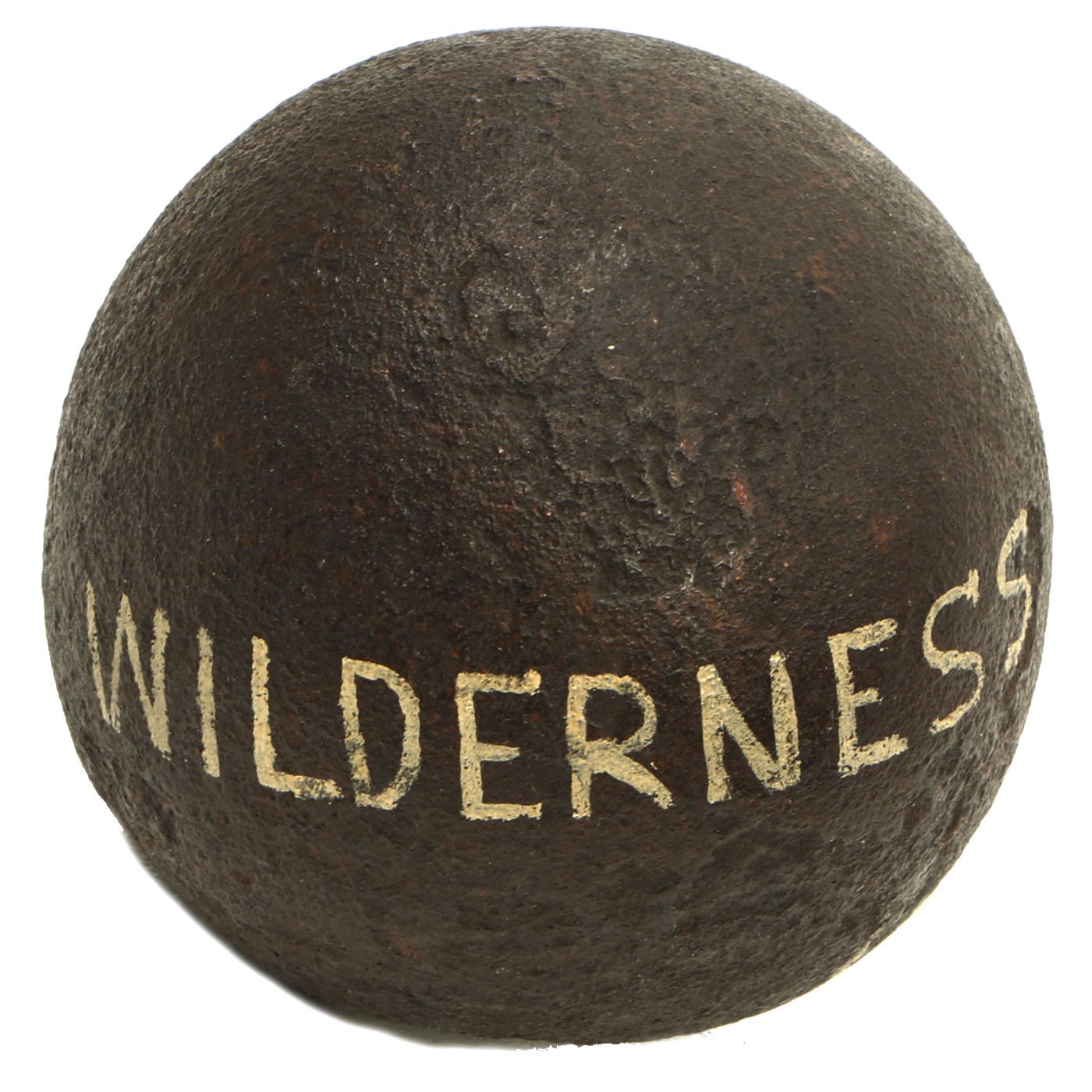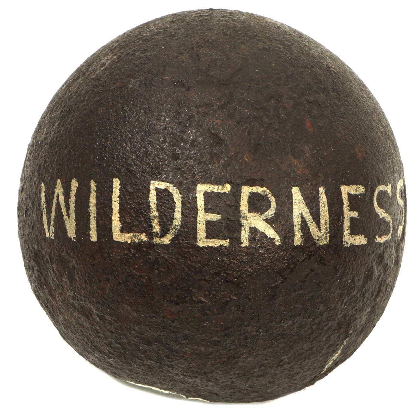 Original Item: One-of-a-kind. Fantastic iron cannonball that is nicely marked WILDERNESS in white paint. It measures approximately 3.75" in diameter indicating that this is an eight pounder in British cannon ball scale. On reverse side of ball in white paint is the number 1118 which was a museum inventory number. The CIVIL WAR MUSEUM of Philadelphia was originally known as the Military Order of the Loyal Legion of the United States (MOLLLUS) and this item was deaccessed when it closed. The MOLLUS number is also found on the bottom of the ball and reads 8.6.1.24. Also included is the original auction catalog listing this item.