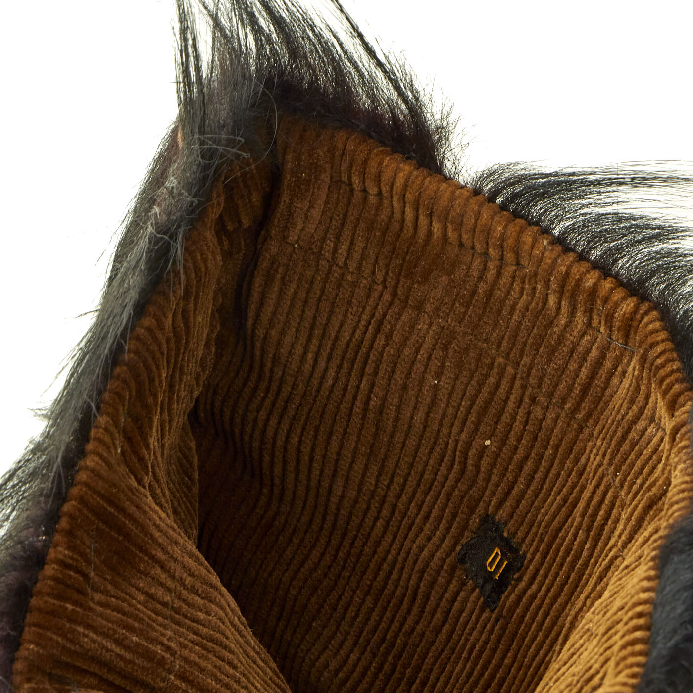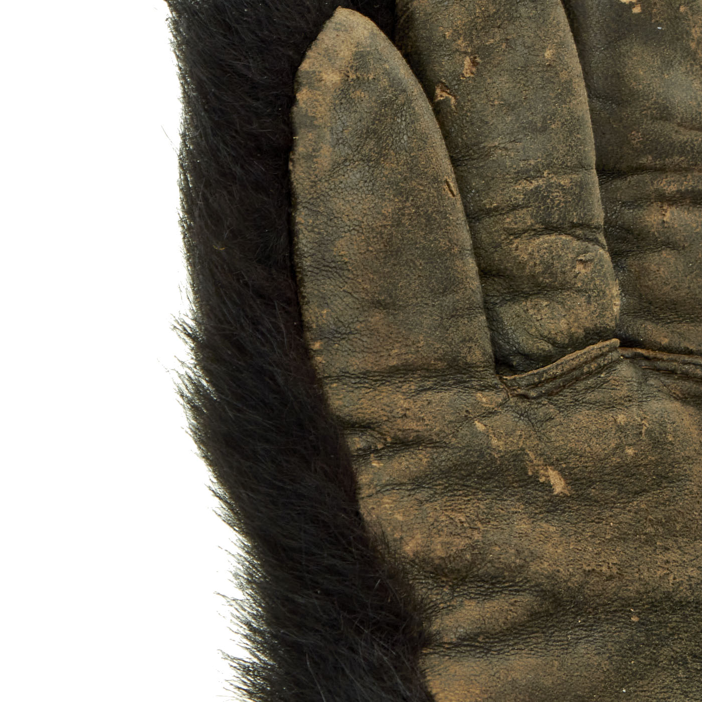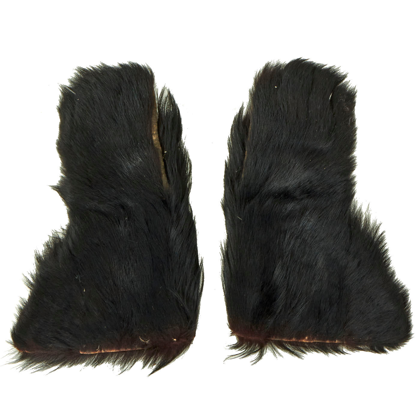 This lovely pair of gauntlets were most certainly made from Black Bear and possibly Russian Ussuri Black Bear in origin. The gloves are in excellent condition and still retain a lovely corduroy wool lining. There is minor wear present on the fur and lining, but the actual hand portion of the leather shows moderate wear and evident of field use. There are no labels or anything present save for a small tag with the size 10 on the interior.