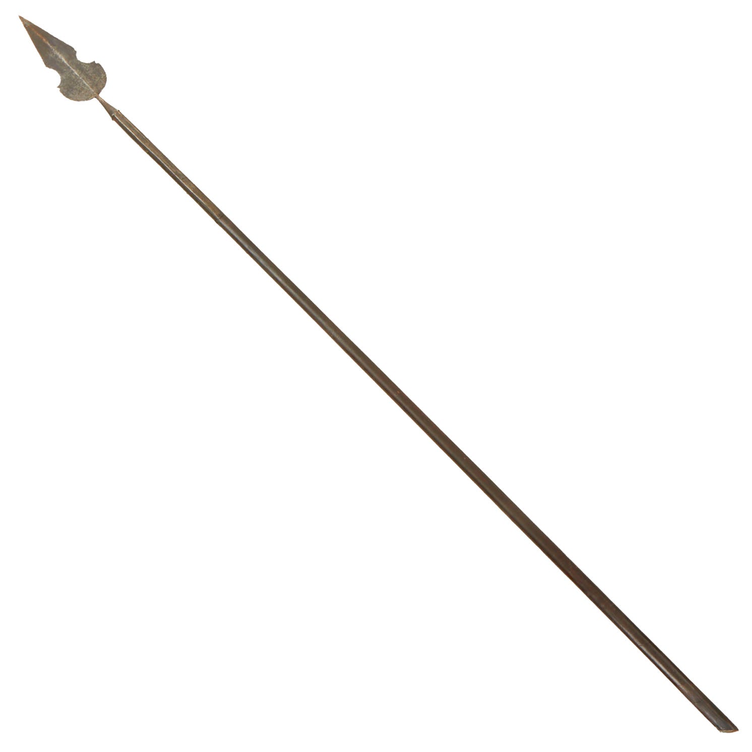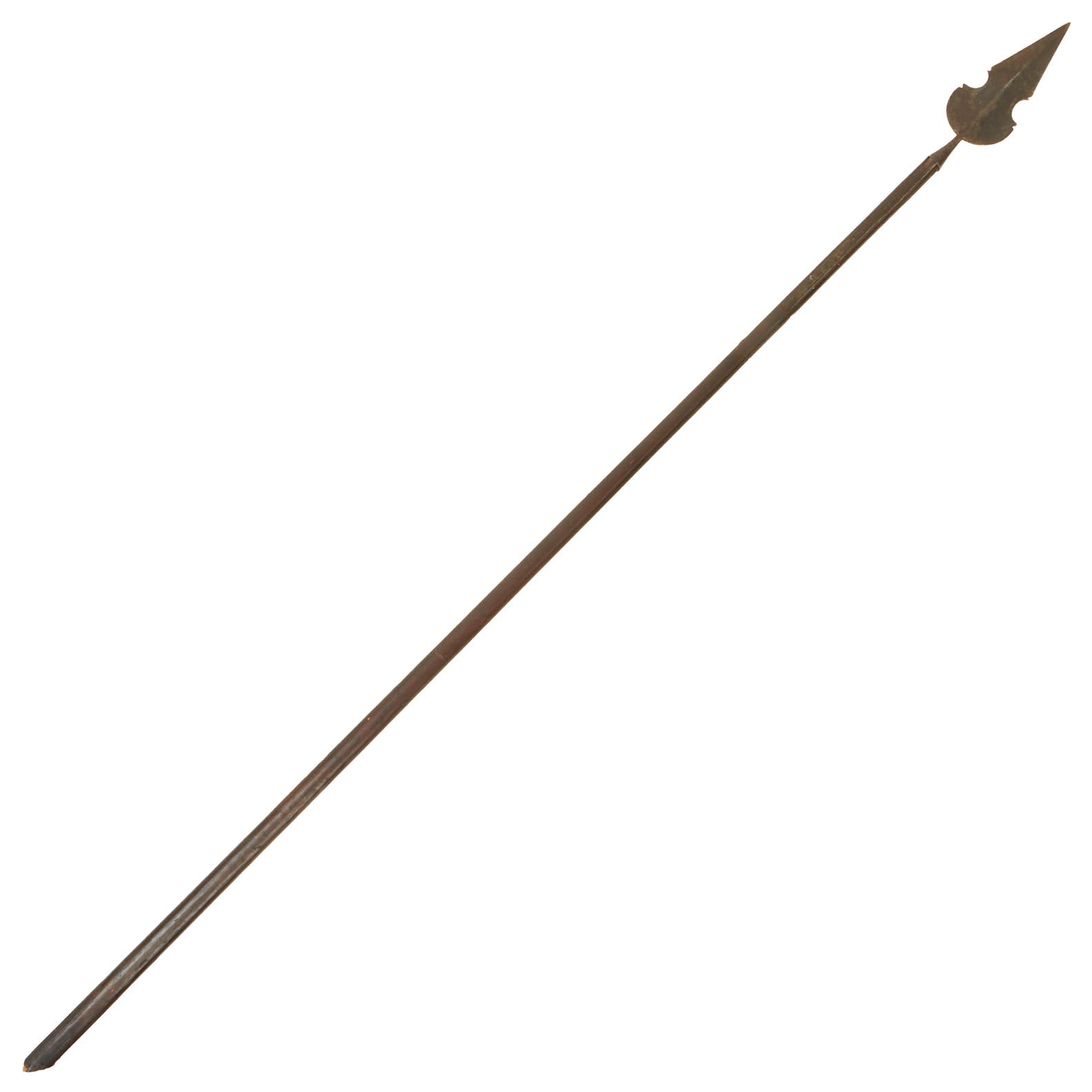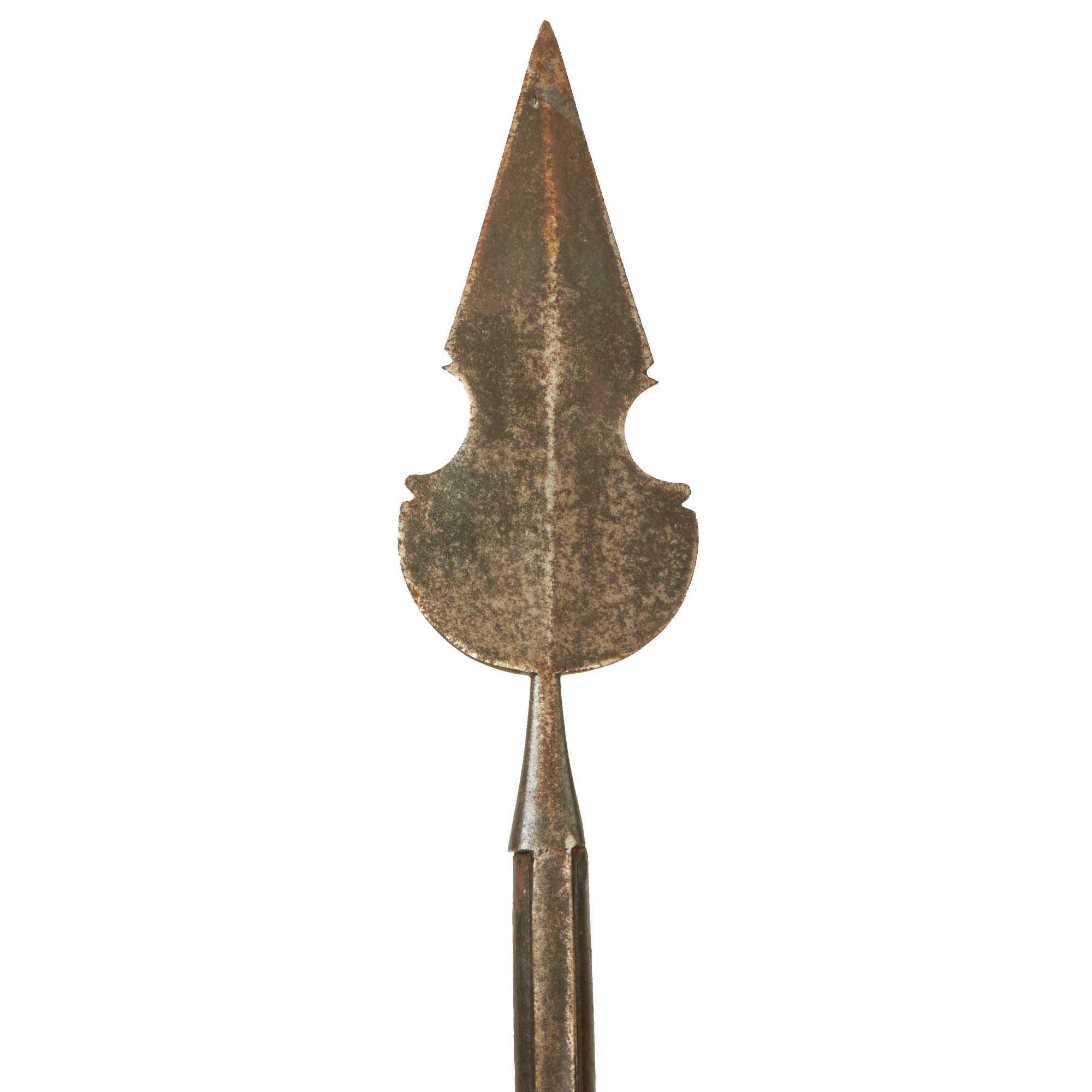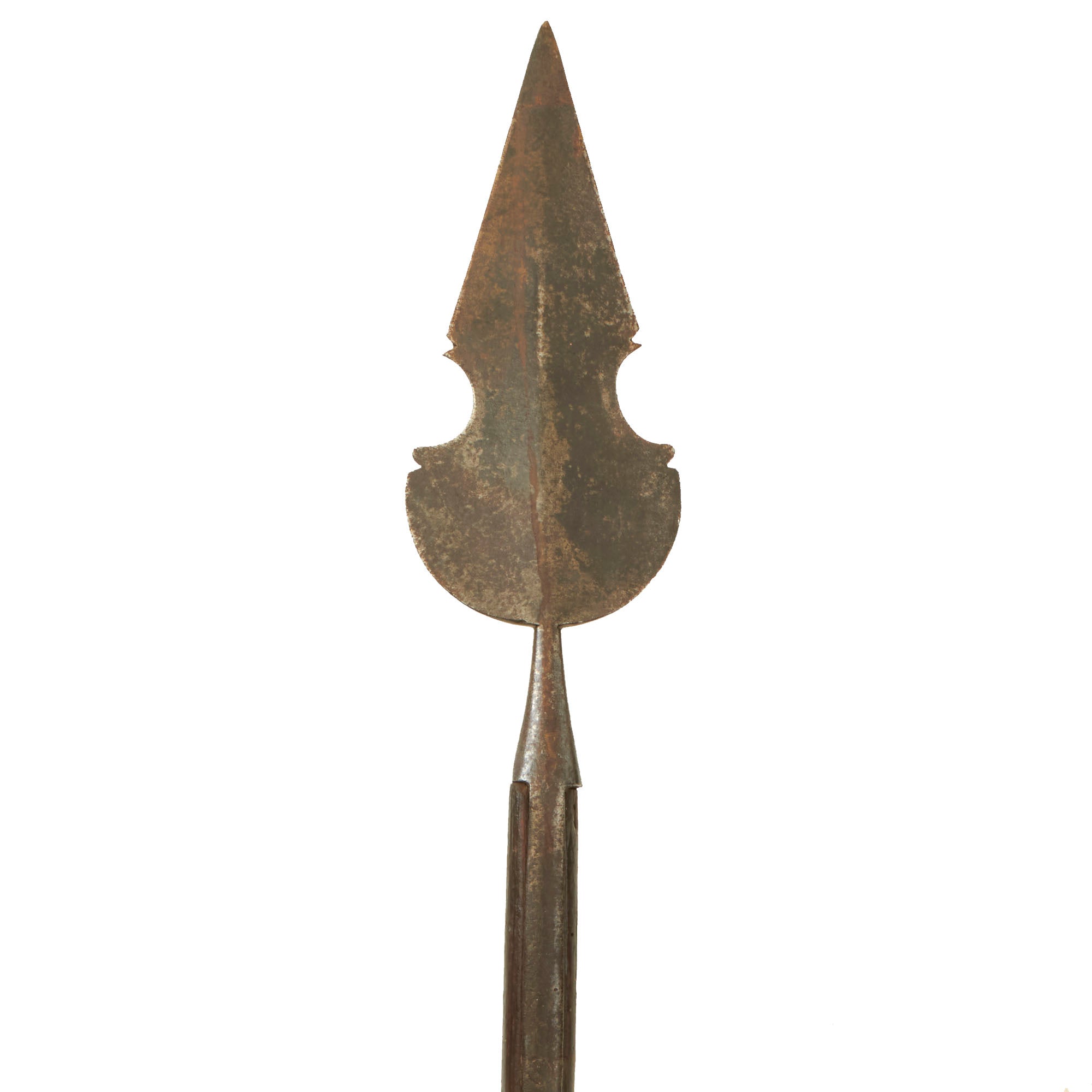 This example is all original, with the spearhead still mounted on the original pole / haft, which has been cut down to 56" inches, giving it a still impressive overall length of just over 66 inches. The spearhead itself measures 8 inches long, and is quite substantial in weight, so this was not a display piece. It is one solid piece, continuous with the langets, so it cannot be removed.