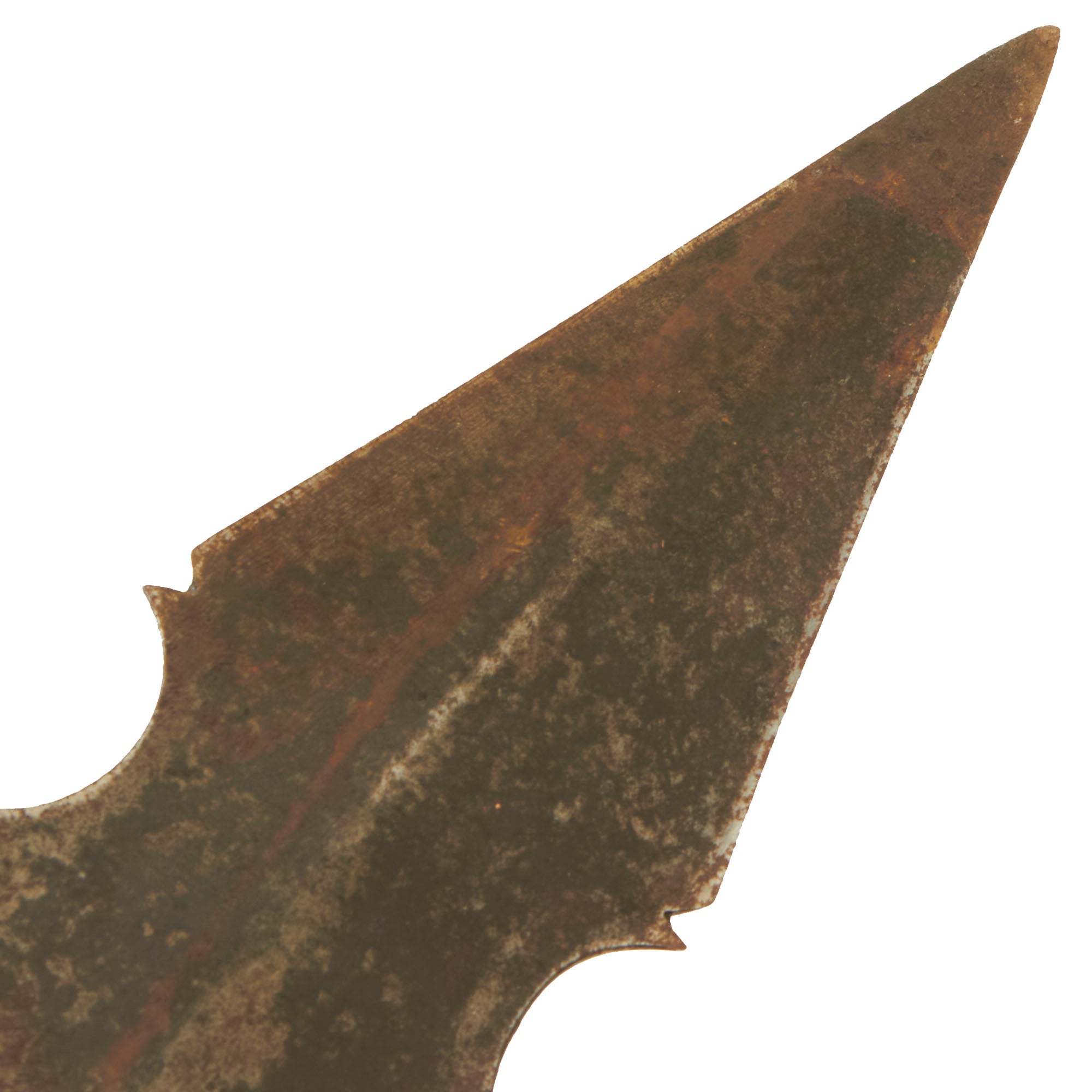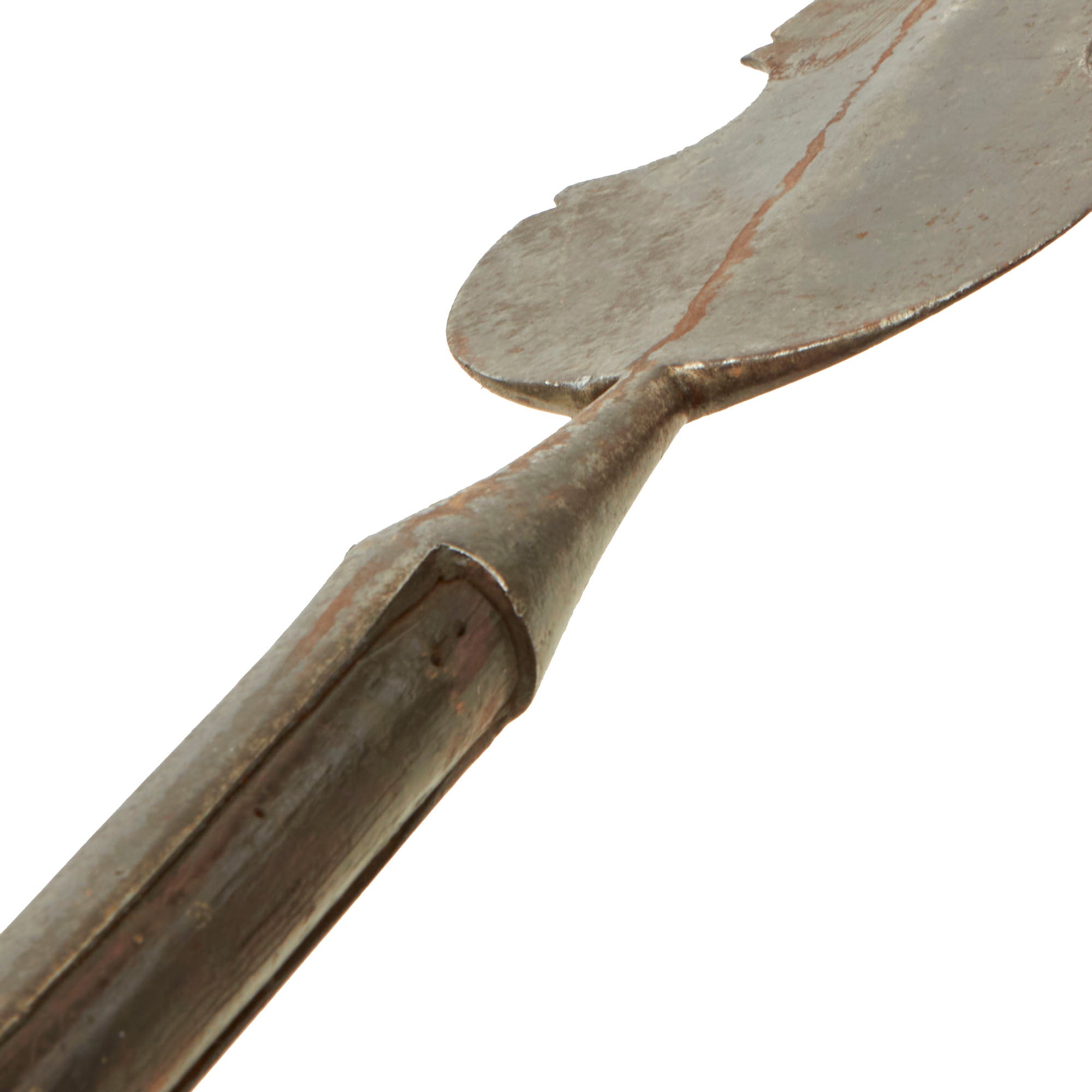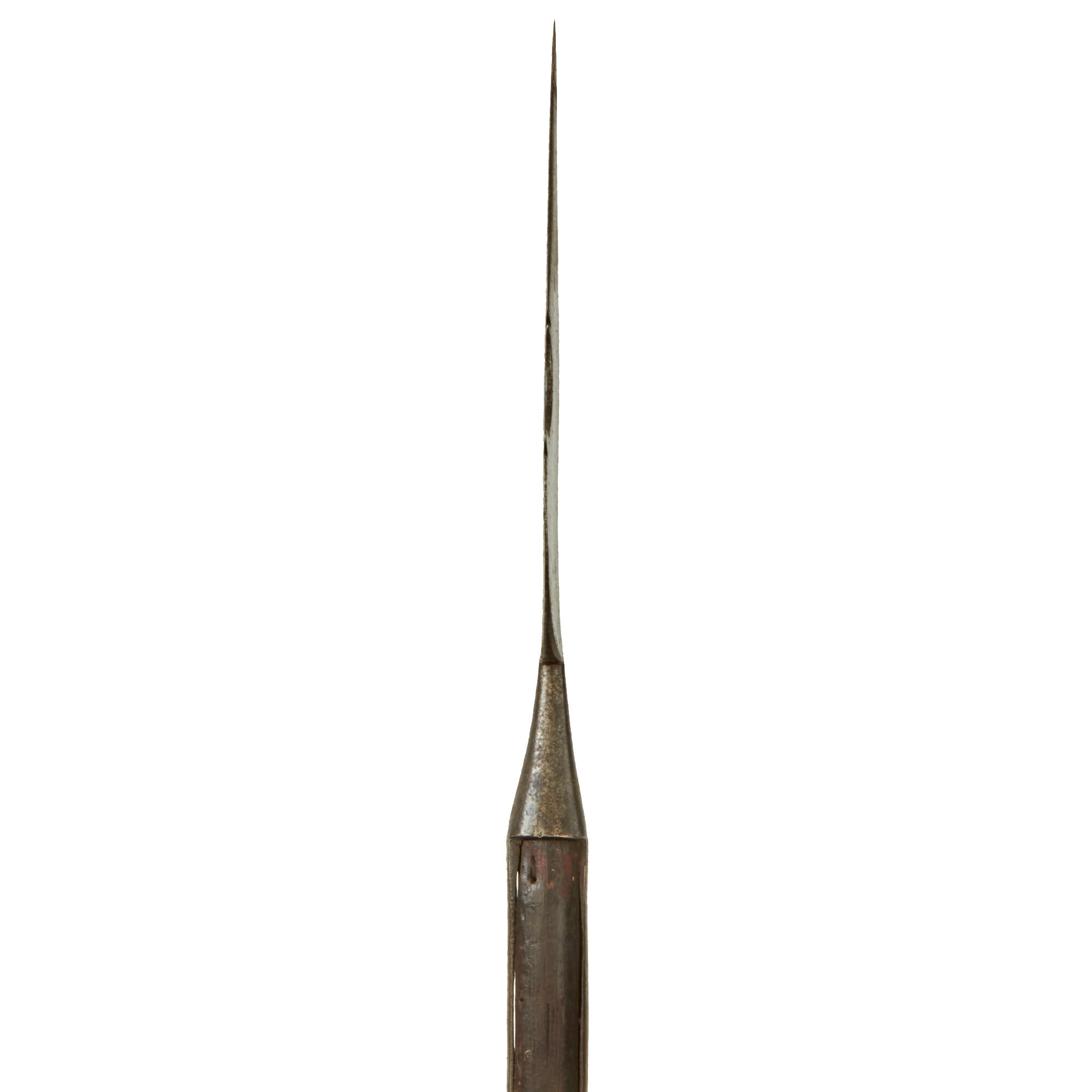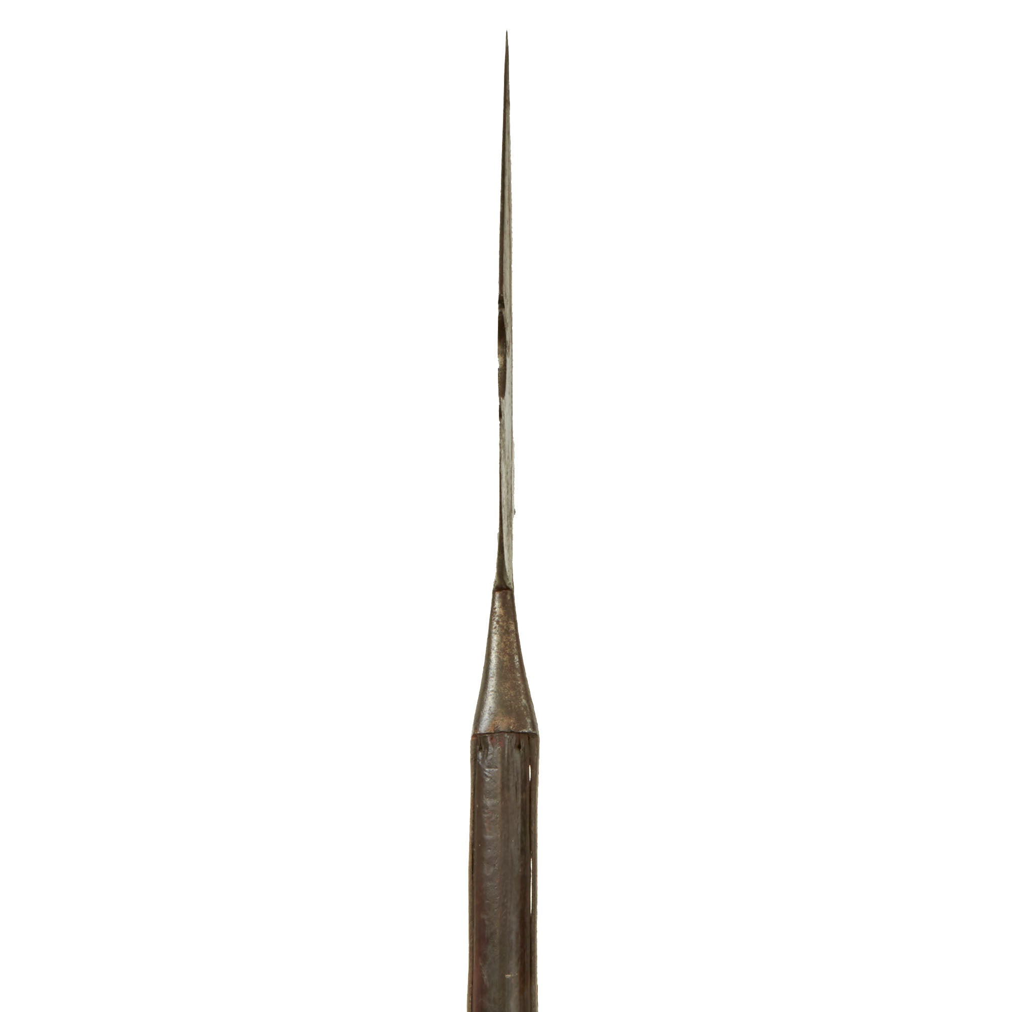 This example is all original, with the spearhead still mounted on the original pole / haft, which has been cut down to 56" inches, giving it a still impressive overall length of just over 66 inches. The spearhead itself measures 8 inches long, and is quite substantial in weight, so this was not a display piece. It is one solid piece, continuous with the langets, so it cannot be removed.