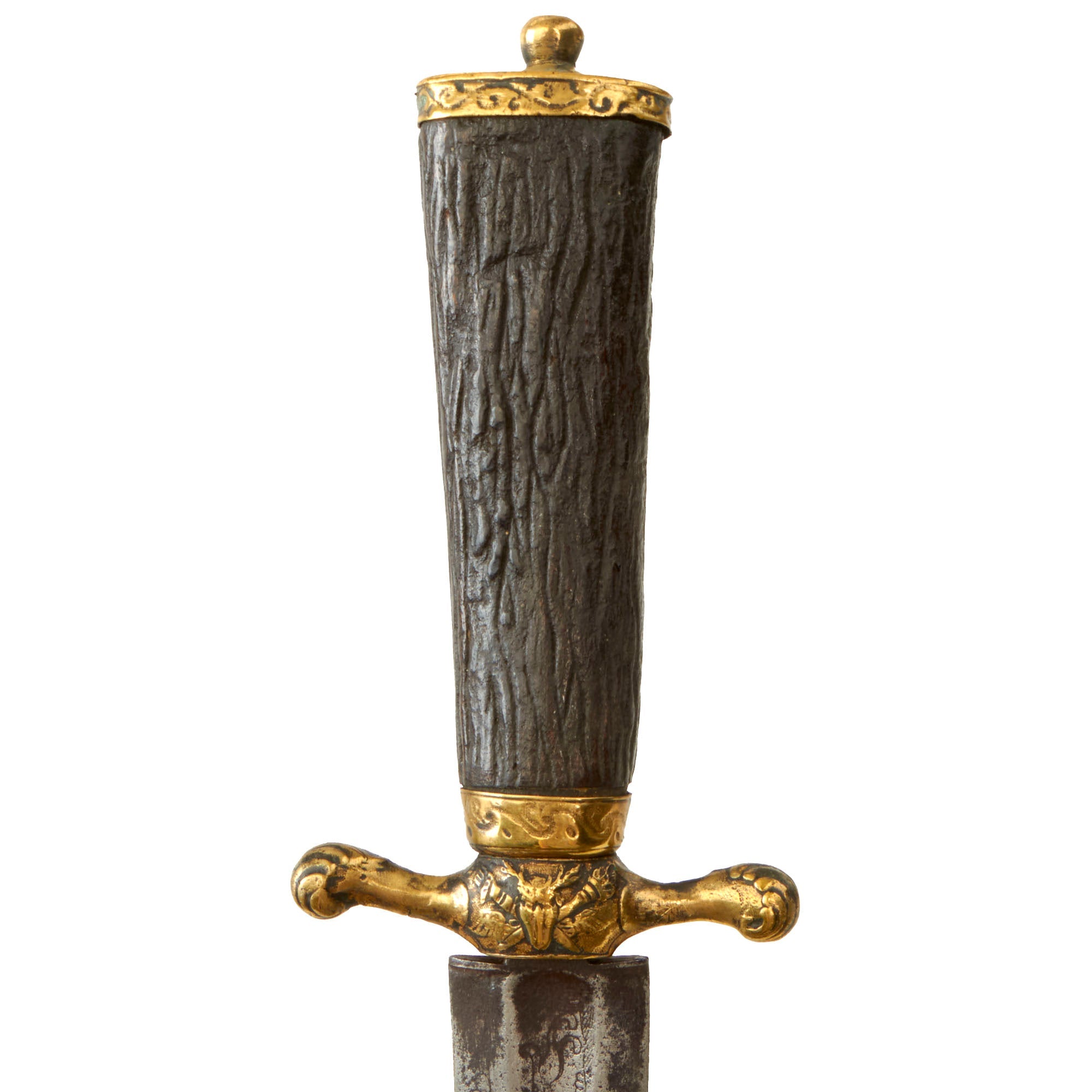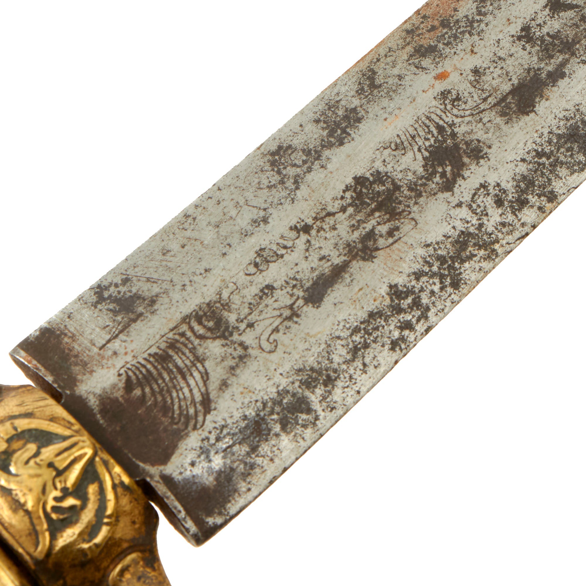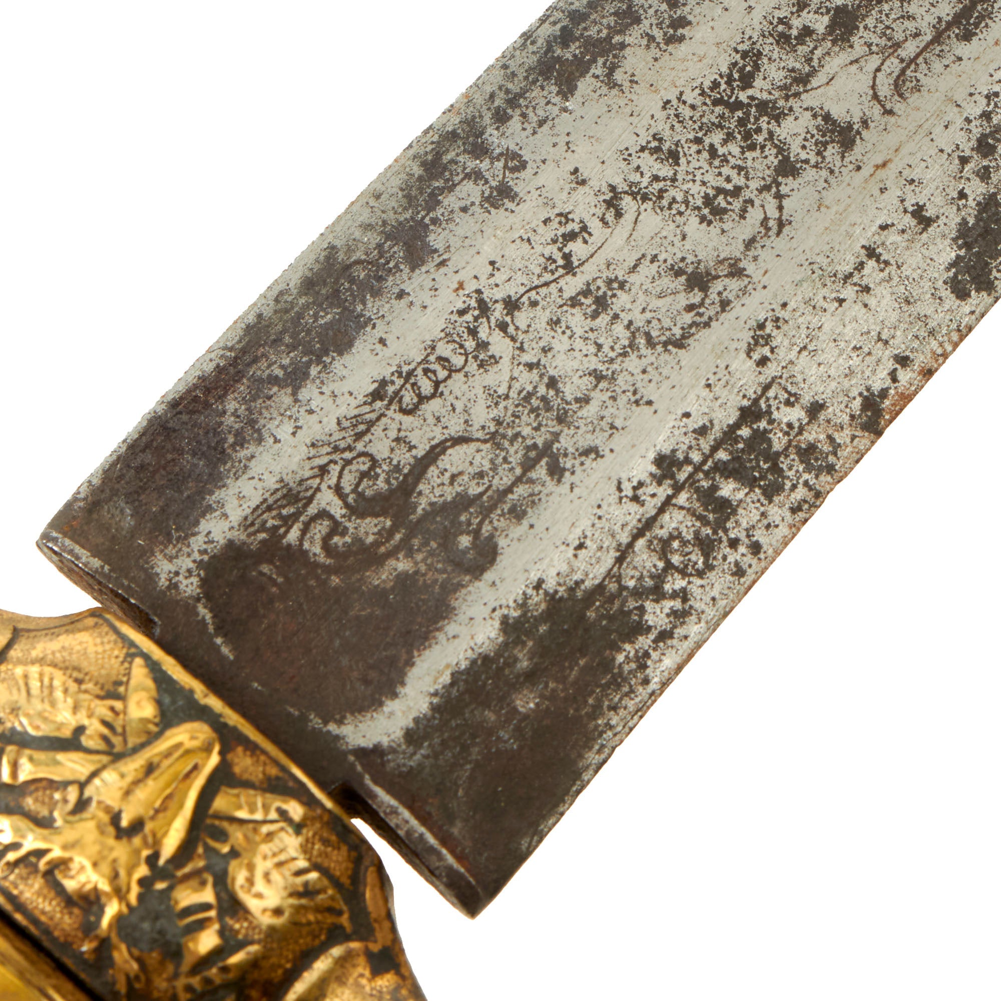 Original Item. Only One Available. This is a fantastic likely American-made hunting cuttoe sword from the Revolutionary War era. The sword features a stag handle and custom-cut brass hilt with some beautiful artwork on the crossguard and on the pommel. The blade is engraved on both sides with depictions of animals running through fields. The name “cuttoe” is an anglicization of the French term couteaux de chasse, meaning “hunting knife.”
