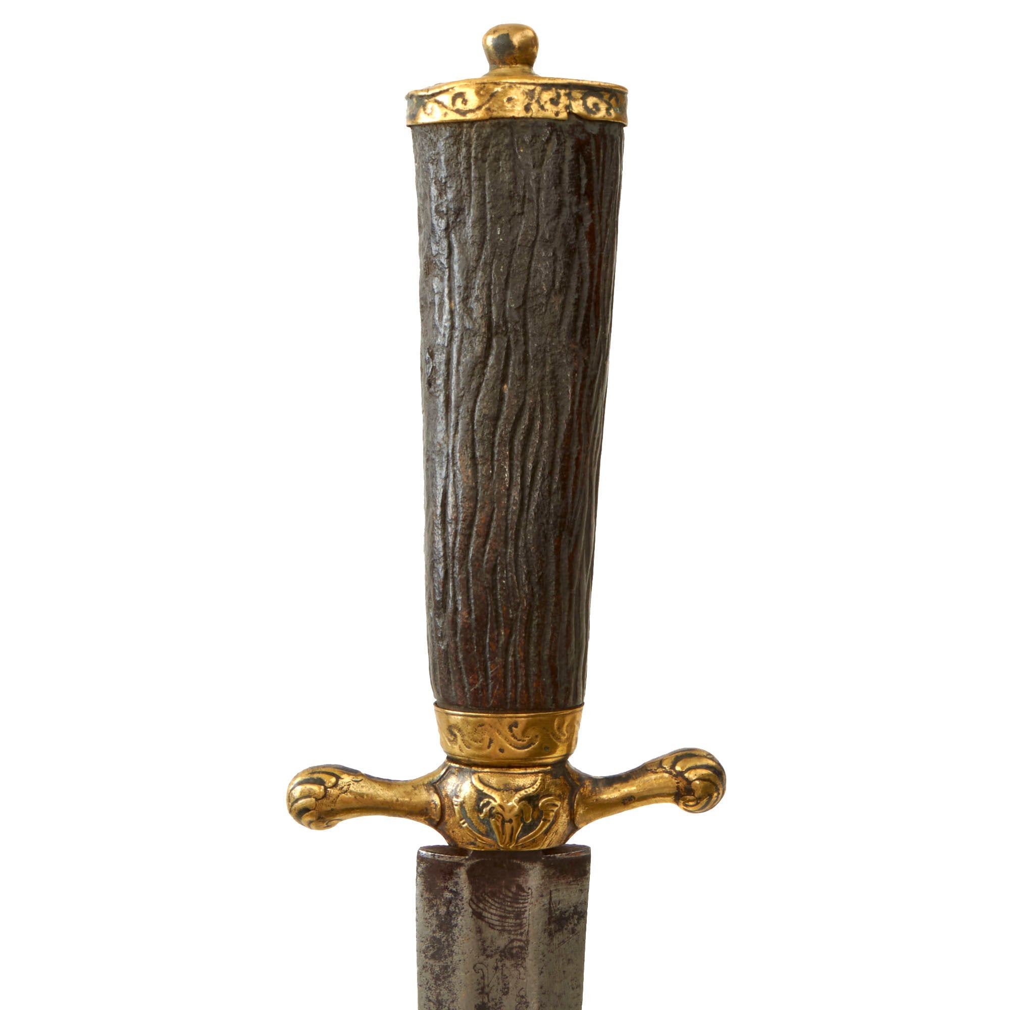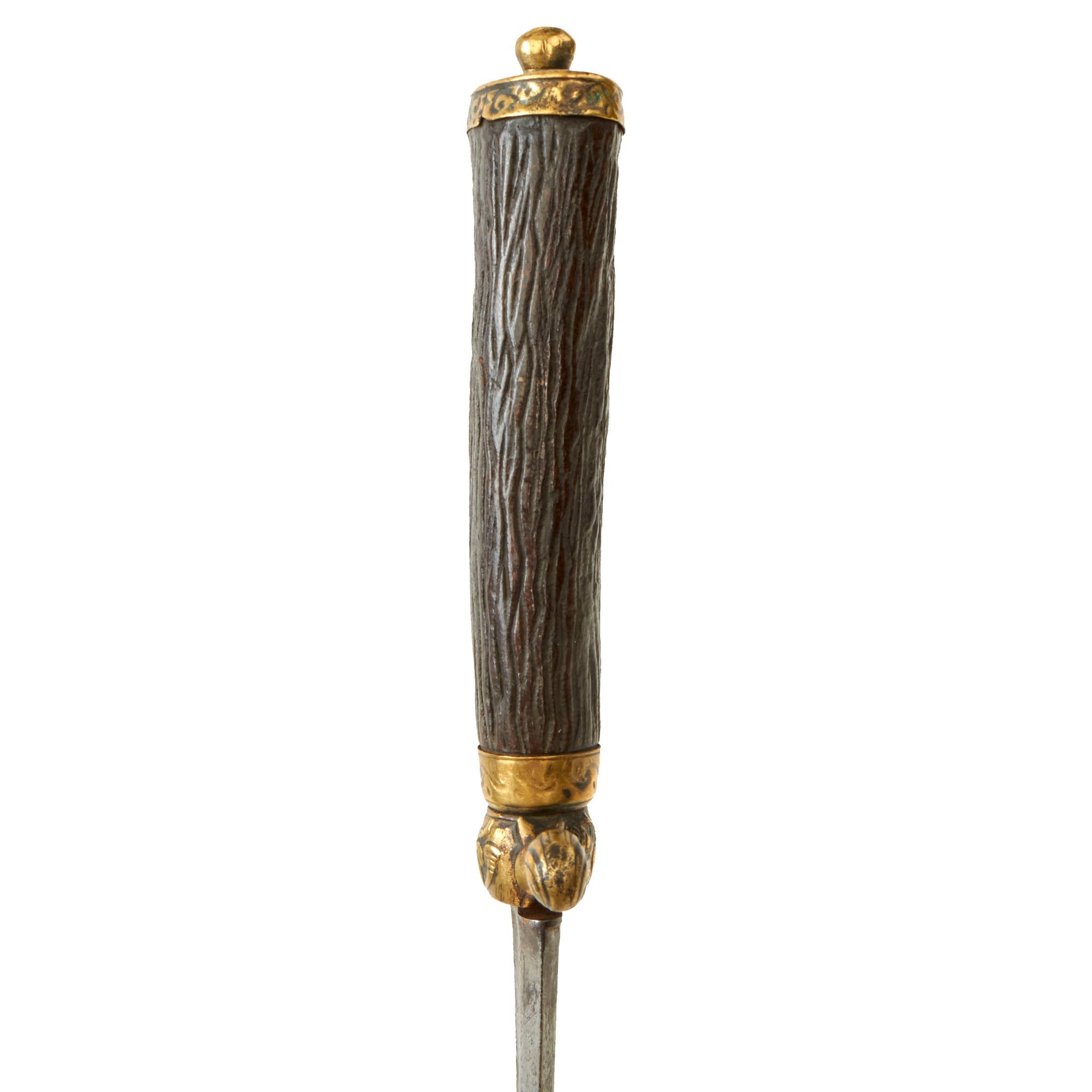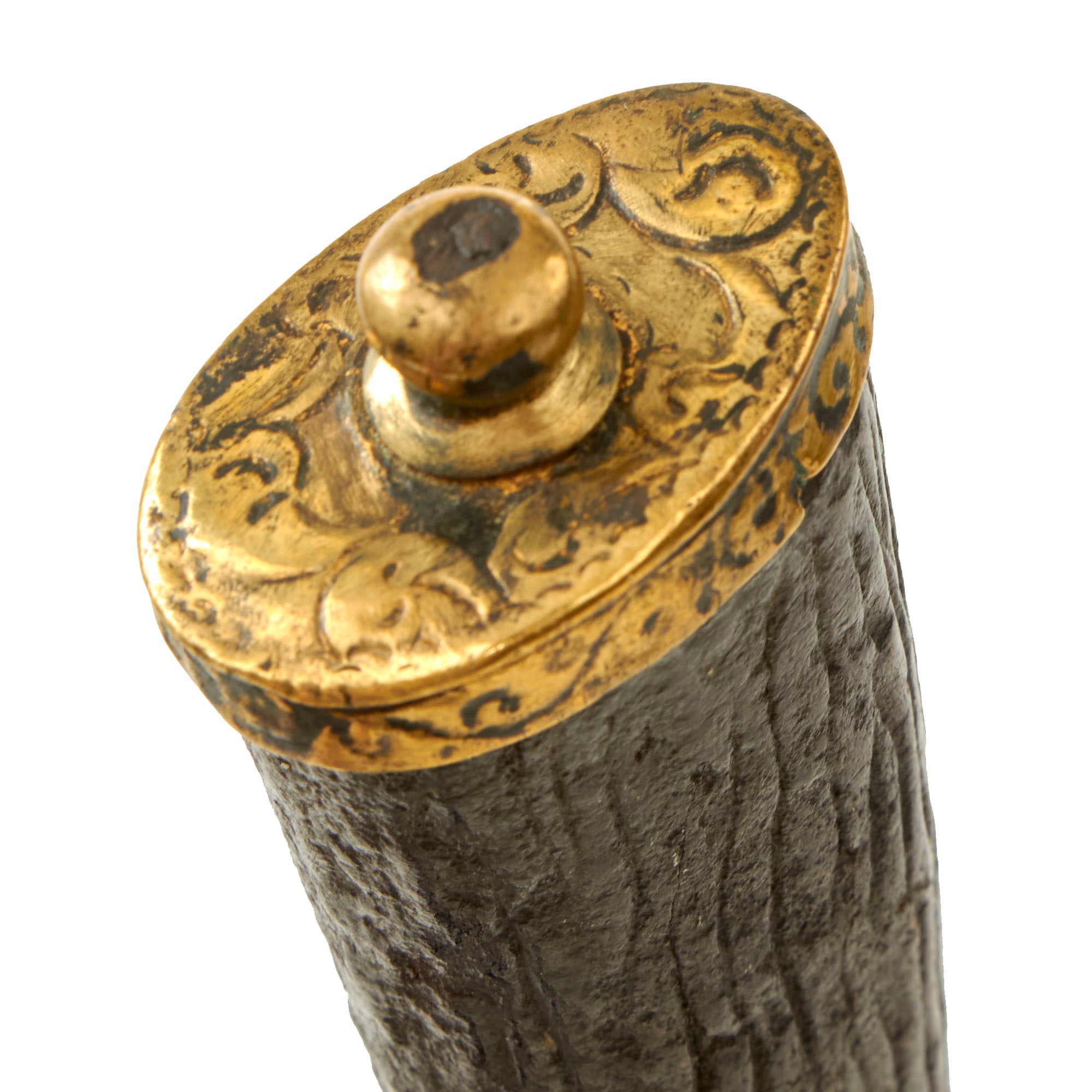 Original Item. Only One Available. This is a fantastic likely American-made hunting cuttoe sword from the Revolutionary War era. The sword features a stag handle and custom-cut brass hilt with some beautiful artwork on the crossguard and on the pommel. The blade is engraved on both sides with depictions of animals running through fields. The name “cuttoe” is an anglicization of the French term couteaux de chasse, meaning “hunting knife.”