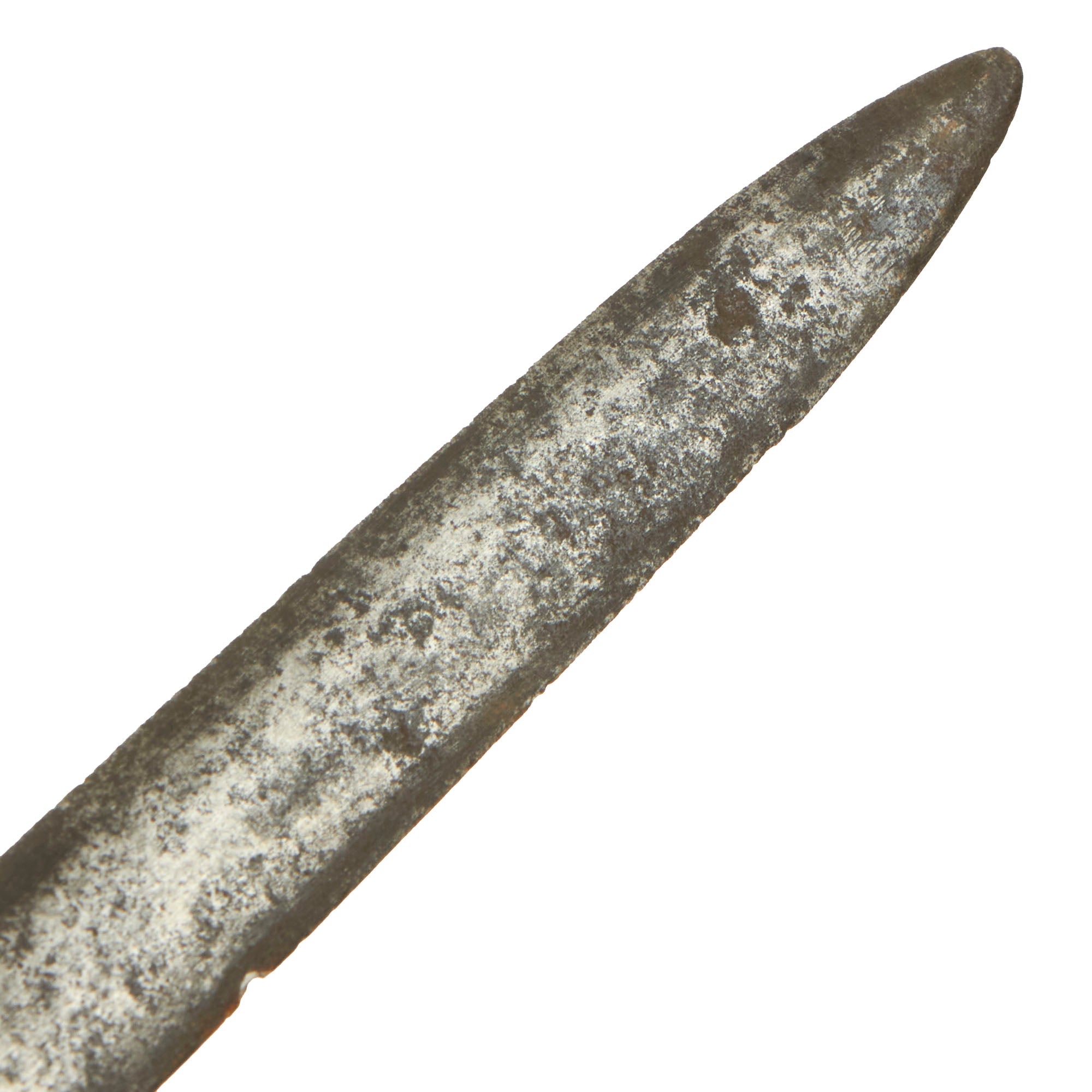 The sword has a 21⅝” blade and is 27¼” overall. There are a few small chips in the blade near the top,, but the blade is in great shape overall for its age. There are areas of light oxidation across the blade.