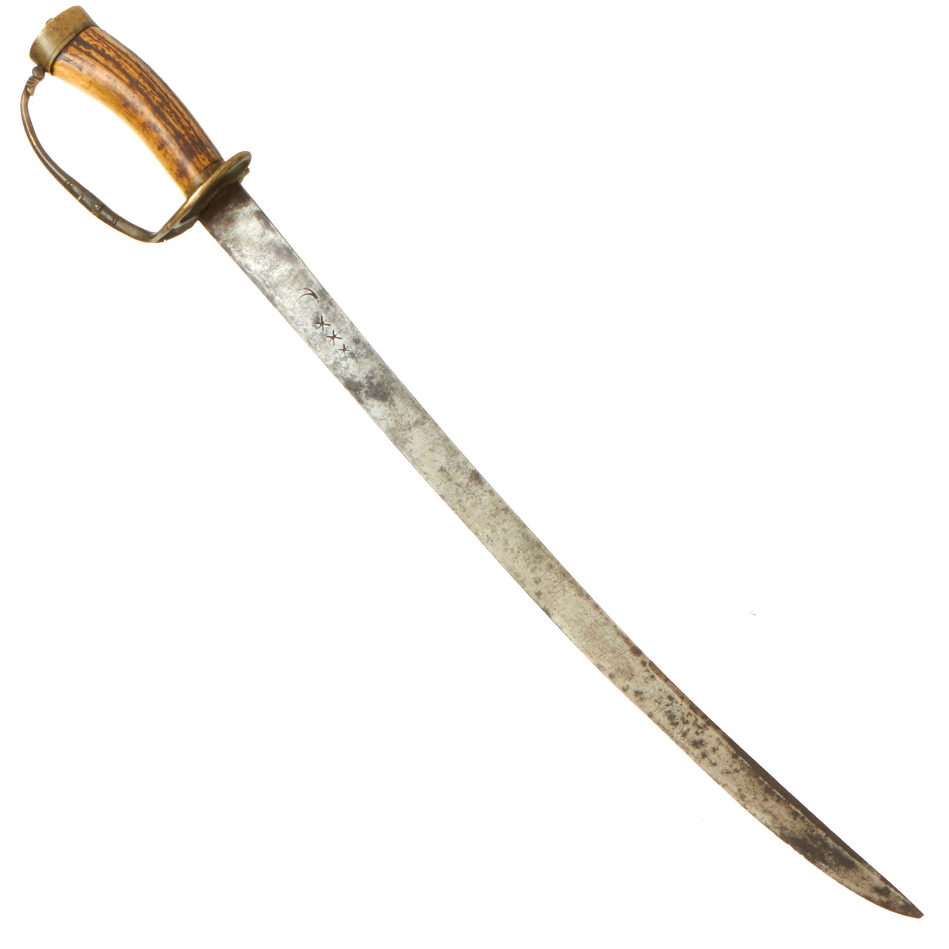 Original Item. Only One Available. This is a fantastic American-made hunting sword from the Revolutionary War era. The sword features a stag handle and custom-cut brass hilt with some beautiful artwork under the crossguard and on the pommel. The blade is engraved on both sides with three stars and a crescent moon.