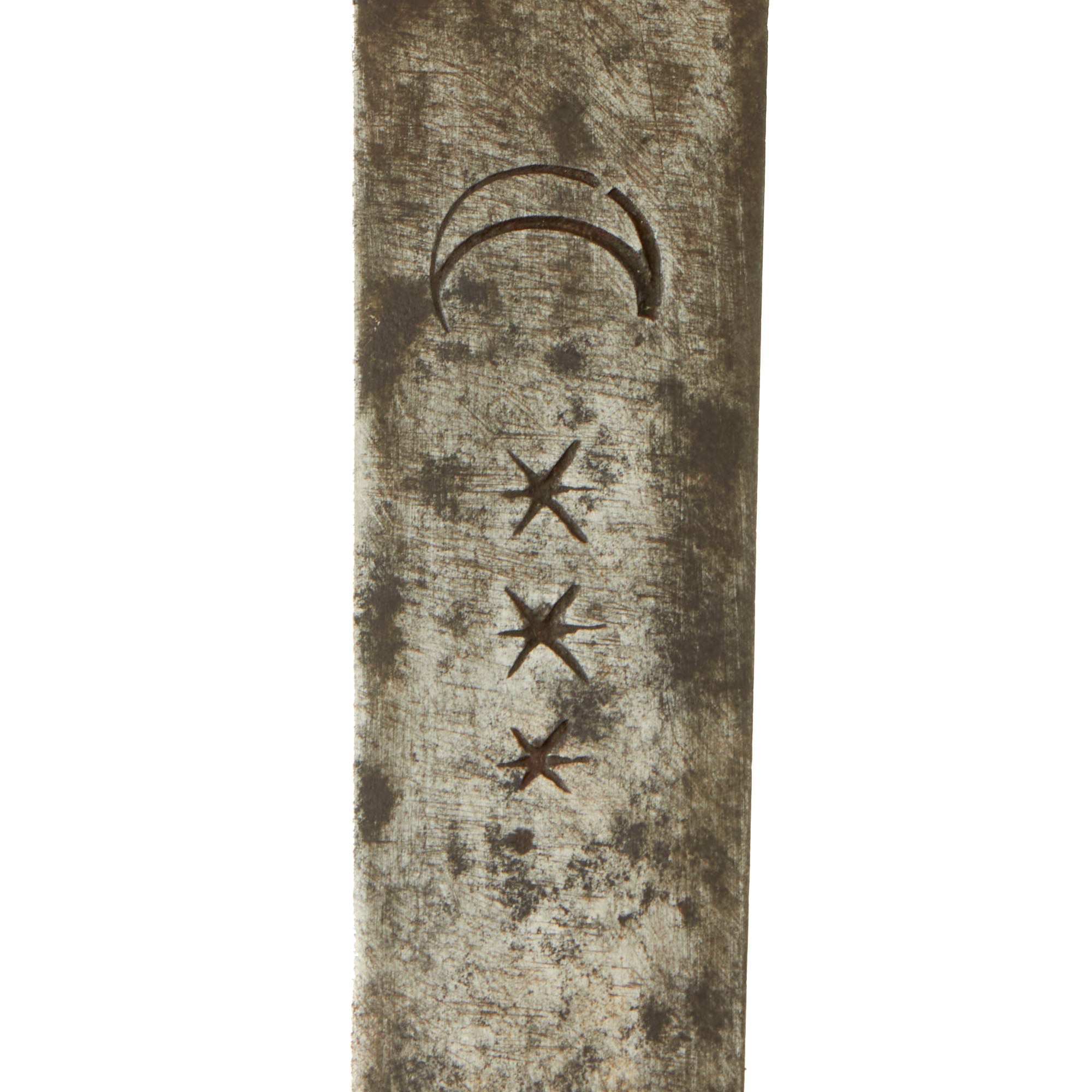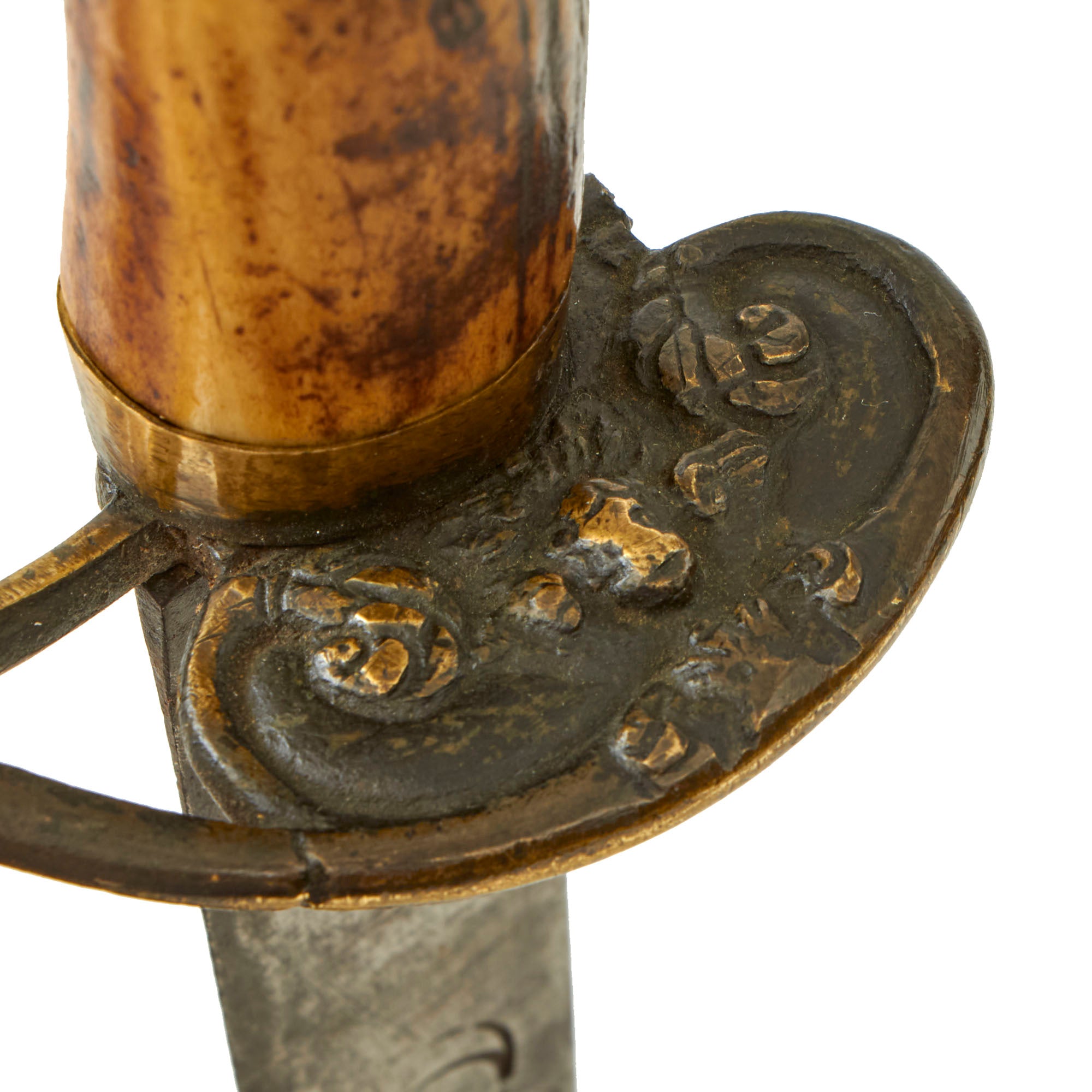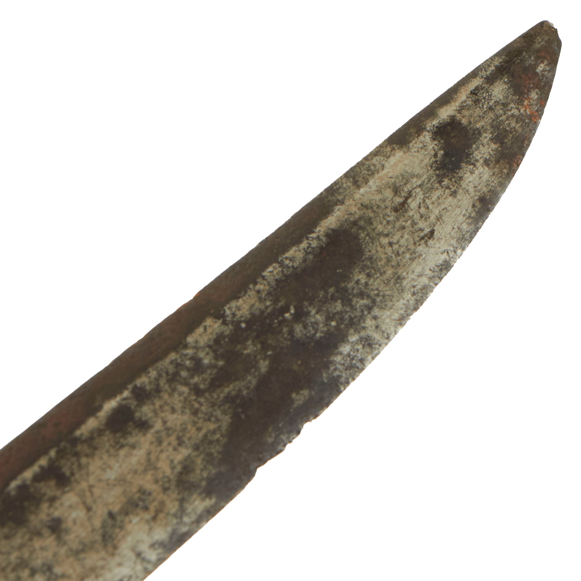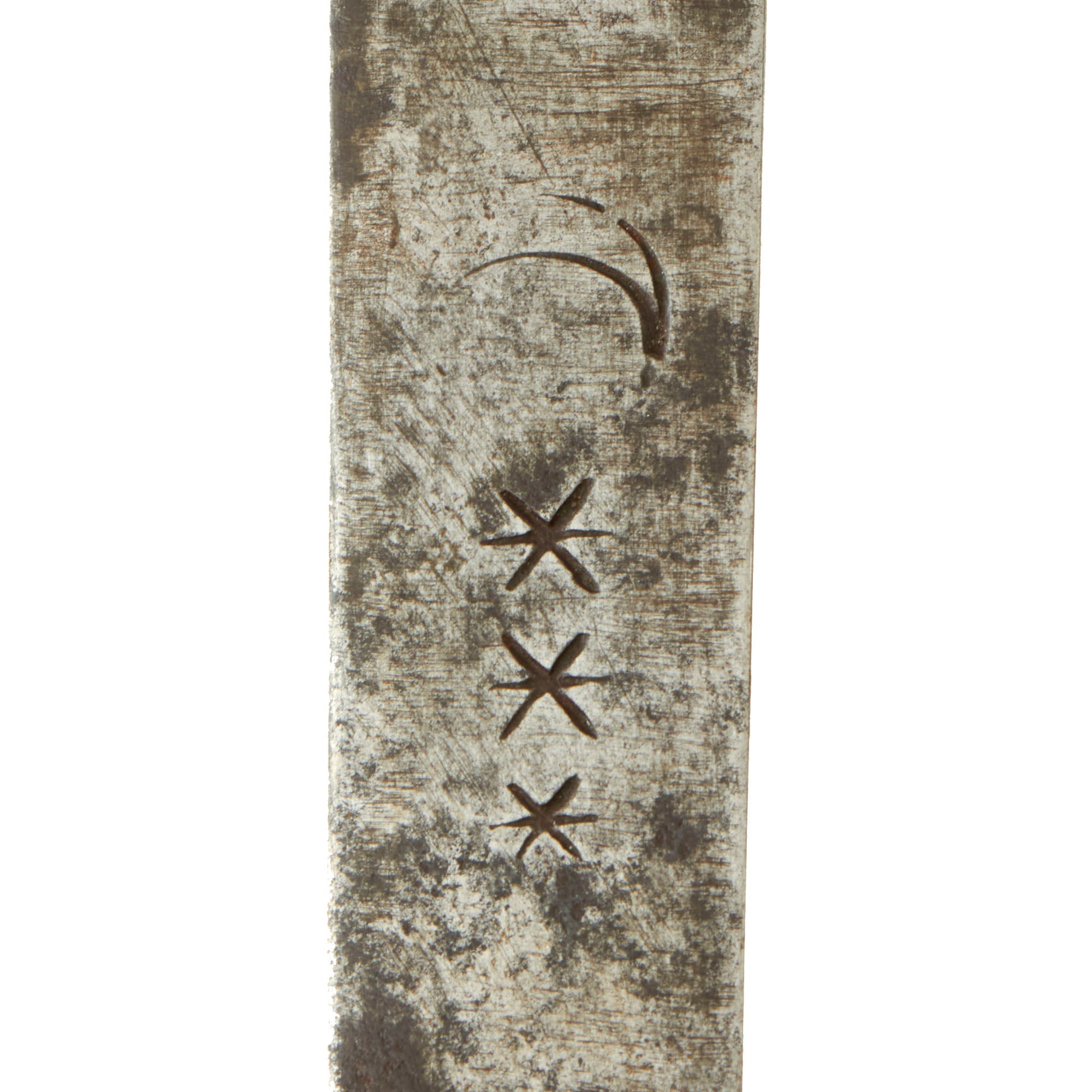 The sword has a 21” blade and is 25⅞” overall. The very tip of the blade is bent or broken off, and there are a few small chips in the blade near the top, and on the false edge, but the blade is in great shape overall for its age. There are areas of light oxidation near the ricasso and around the false edge.