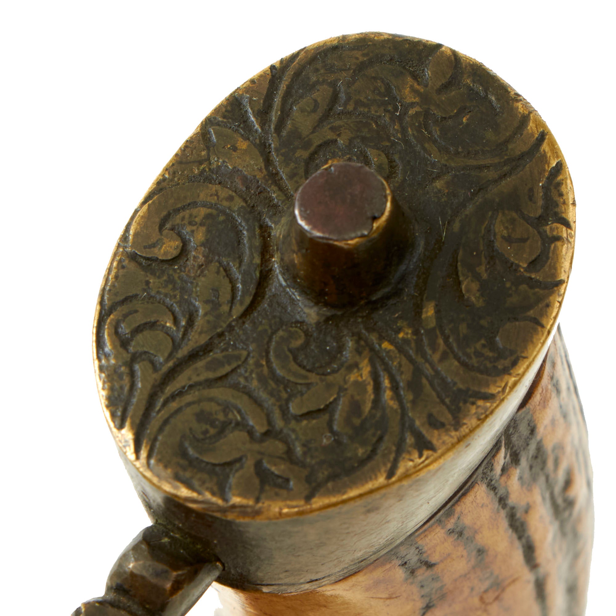 The stag grip is in fantastic condition with no cracks or serious damage. It has a fantastic patina. The hilt itself is very worn and there is a crack/break in the handguard about one inch from the blade, which doesn’t appear to cause any serious issues. The blade is not very tight on the hilt and the grip does shift a bit when moved, but this isn’t very serious either. The handguard has an etching of an animal’s face in the middle, and the crossguard has a great etching of an animal, likely a ram or sheep. The bottom of the pommel has some beautiful vinery etched on, all hand-done during the period.