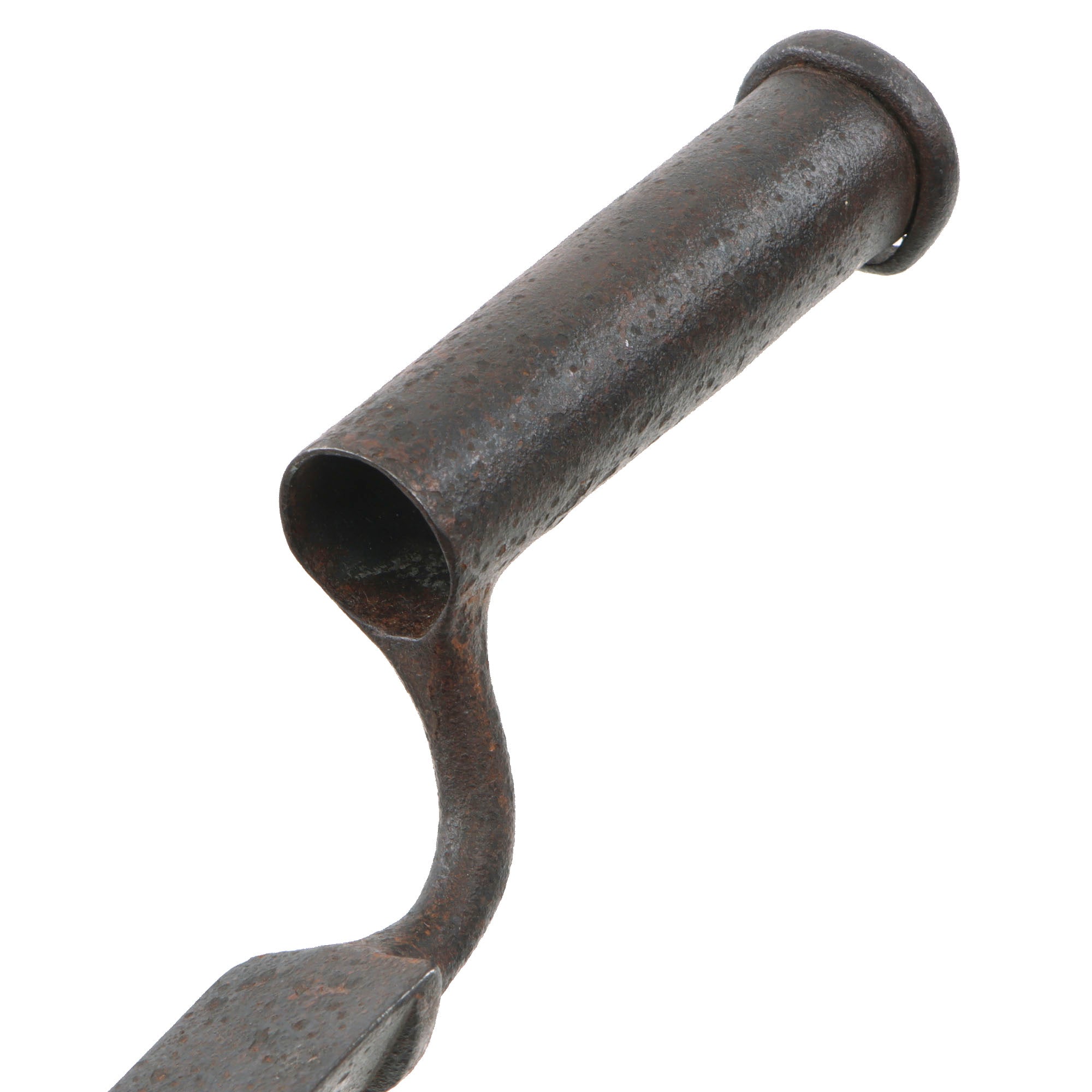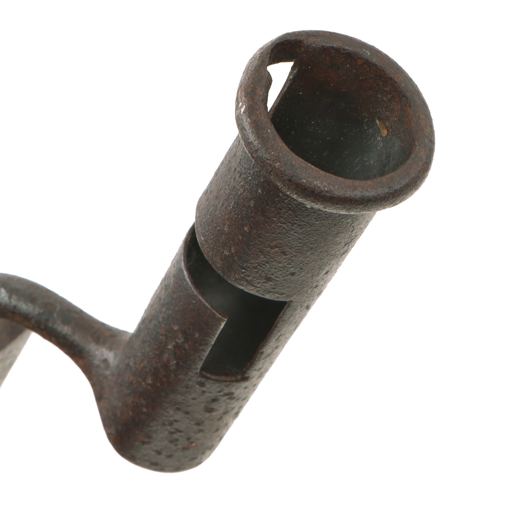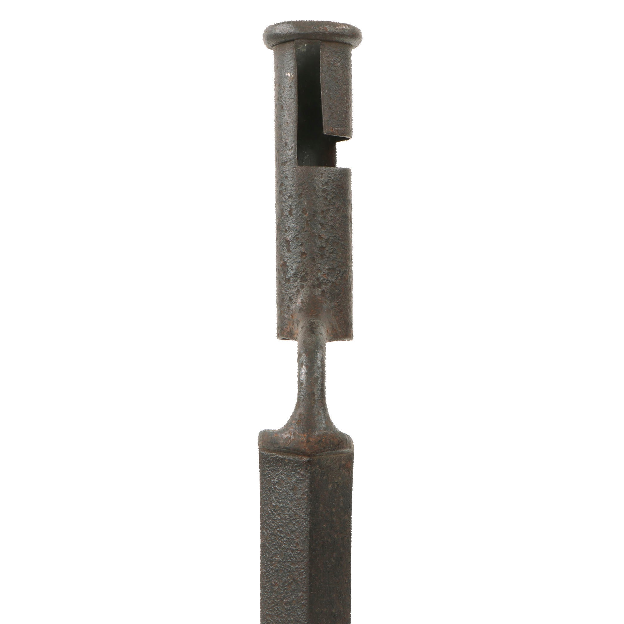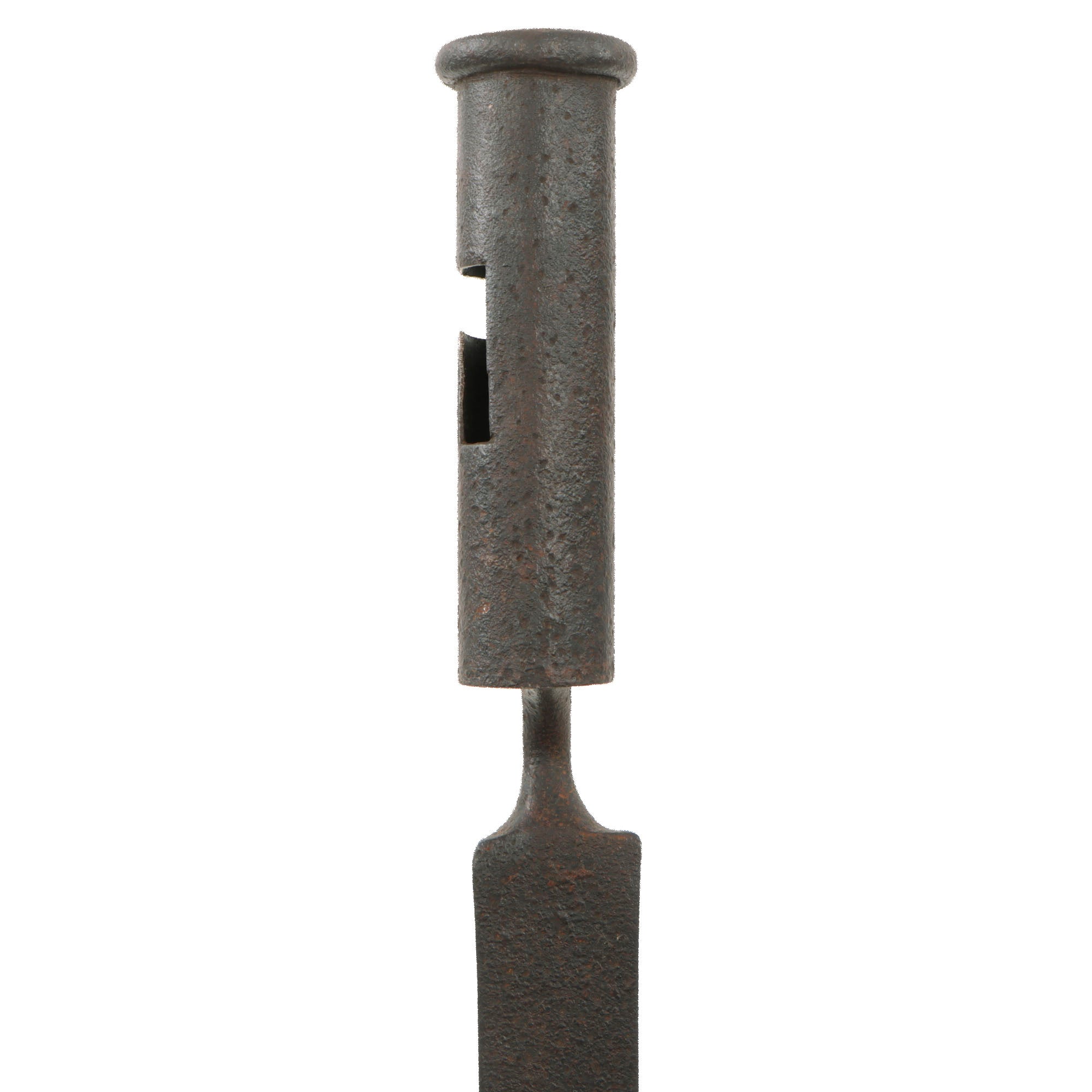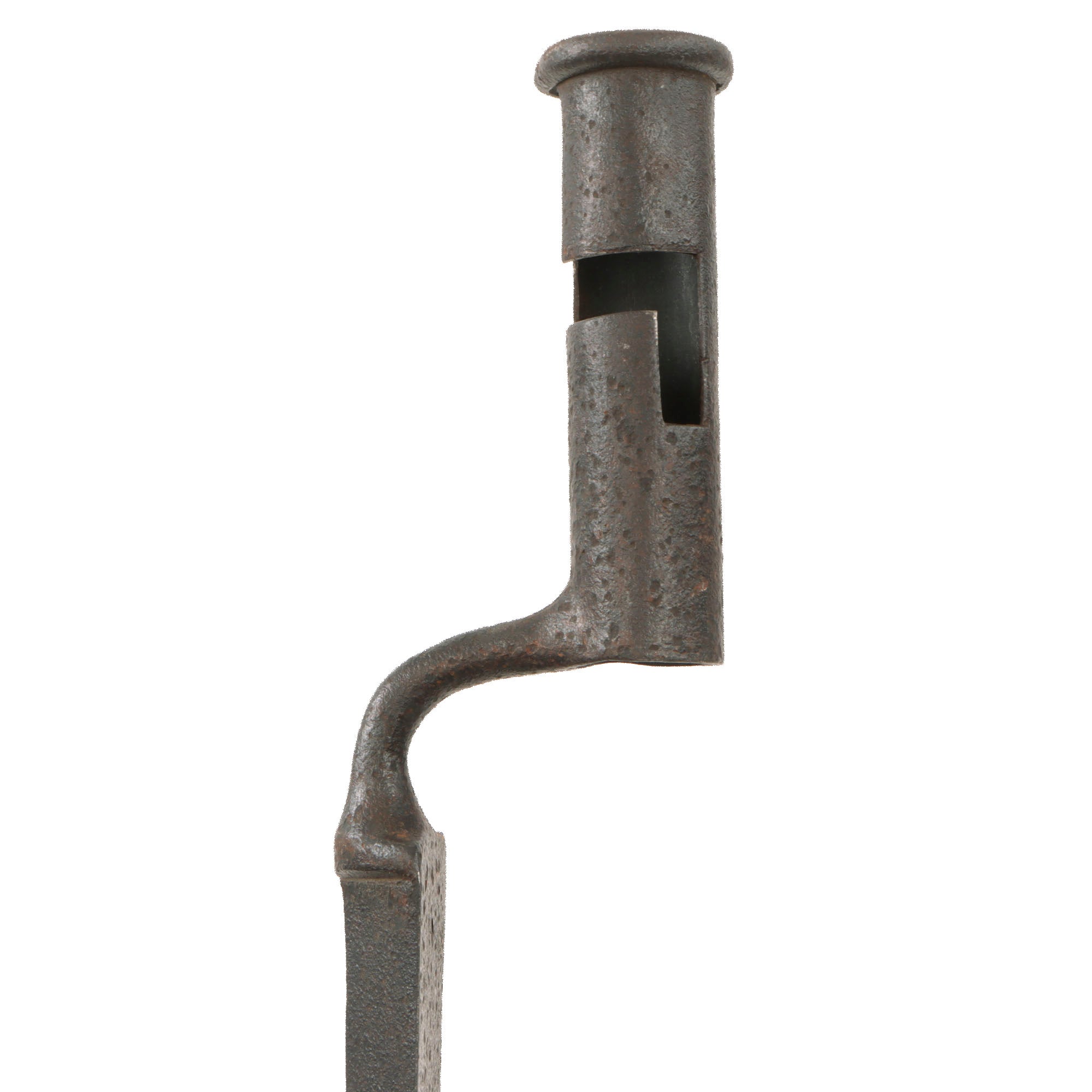 There is heavy pitting across the bayonet but its form is straight and the socket is in good order. The bayonet features a 16 ½” blade and is 21 ⅝” overall. There are no markings, correct for a wartime American manufacture. The very end hole of the socket is .9, while the other end is .86.