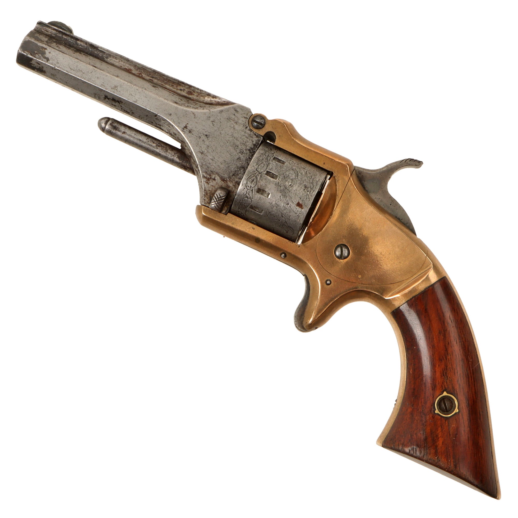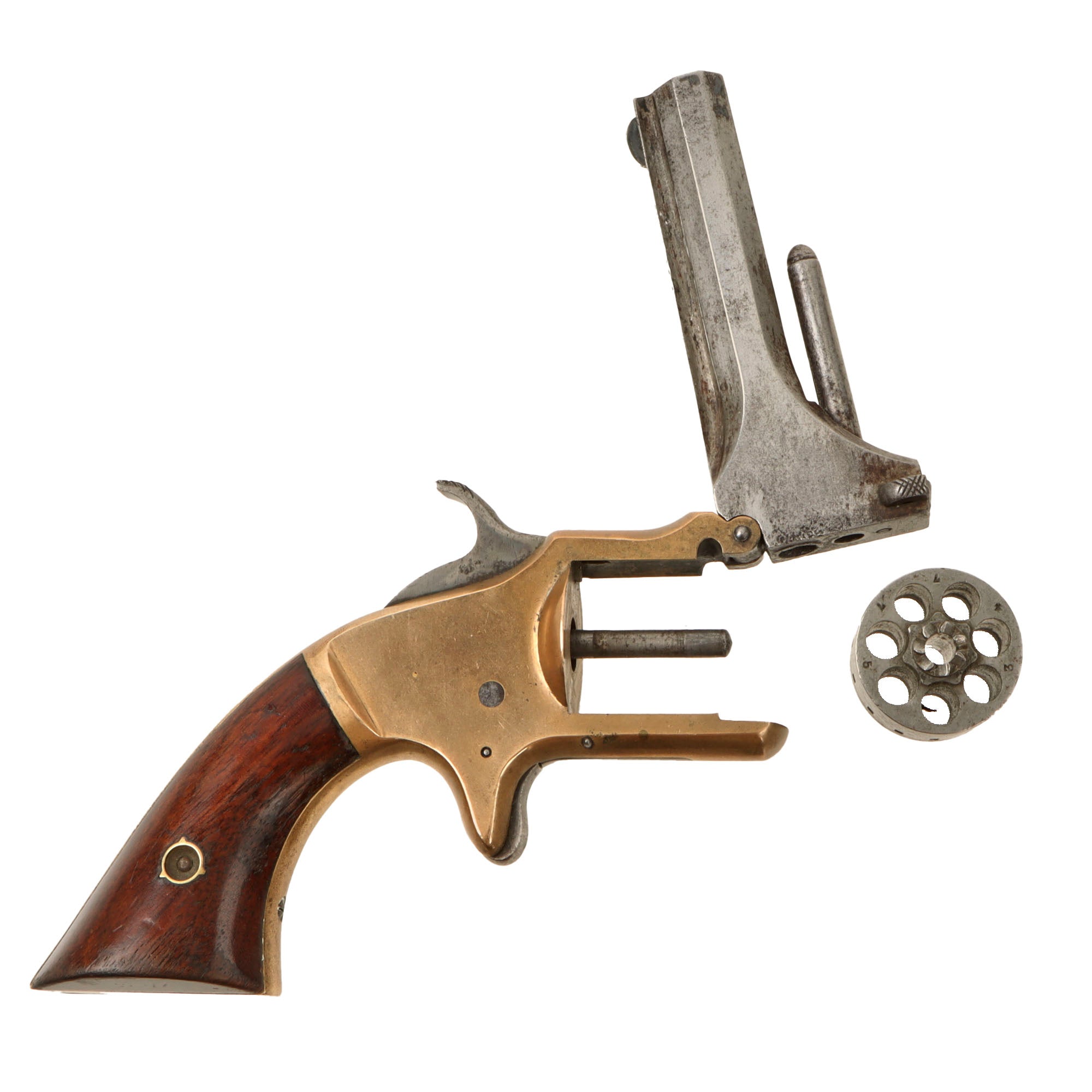 Original Item: Only One Available. This is a very nice example of an American Standard Tool Co. .22cal Tip Up vest revolver, based very heavily on the Smith & Wesson Model 1 2nd Issue revolver. This company was originally known as Manhattan Firearms Manufacturing Co, established in 1859, in Norwich, Connecticut. The company would later move to Newark, N.J.. During the Civil War they produced over 150,000 Revolvers running second only to COLT and REMINGTON. During the final years of the war and afterwards they manufactured "copies" of the Smith & Wesson .22 Model 1 and .32 Model 1 1/2 Revolvers. This continued after their name change in 1868 to American Standard Tool.