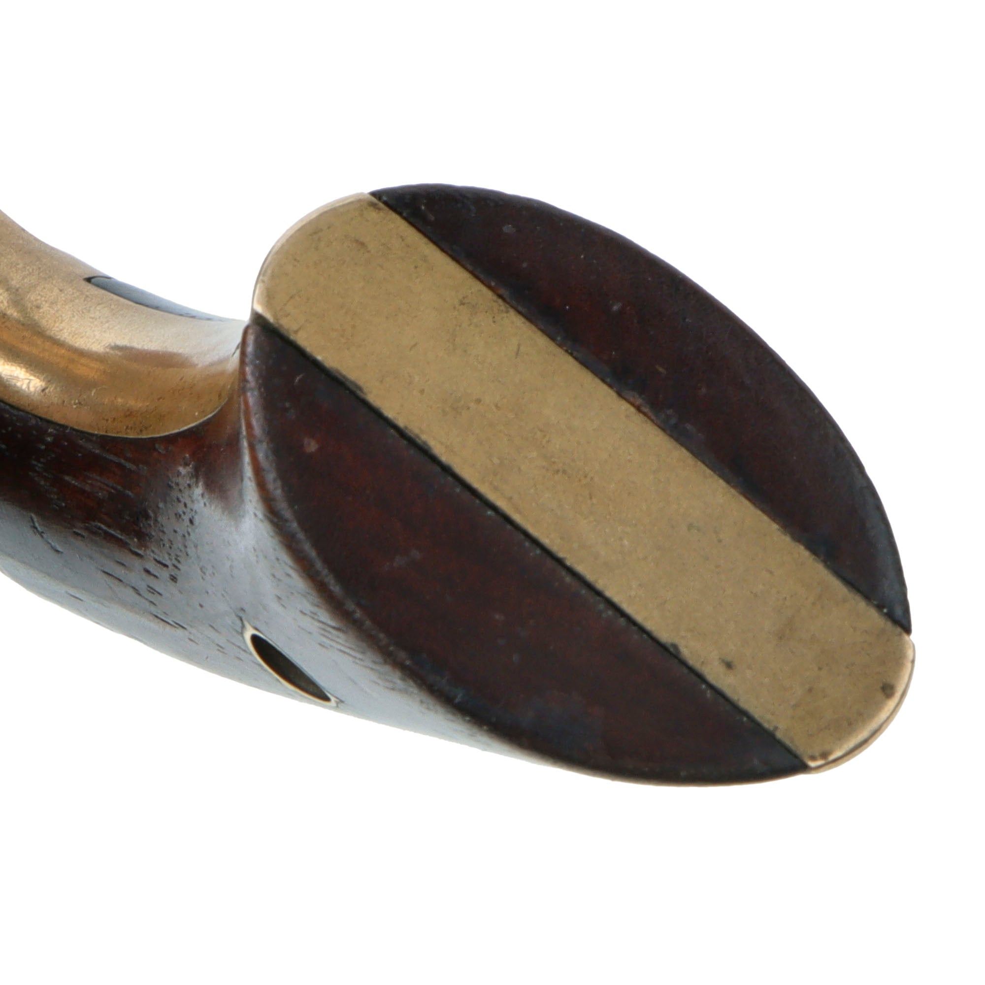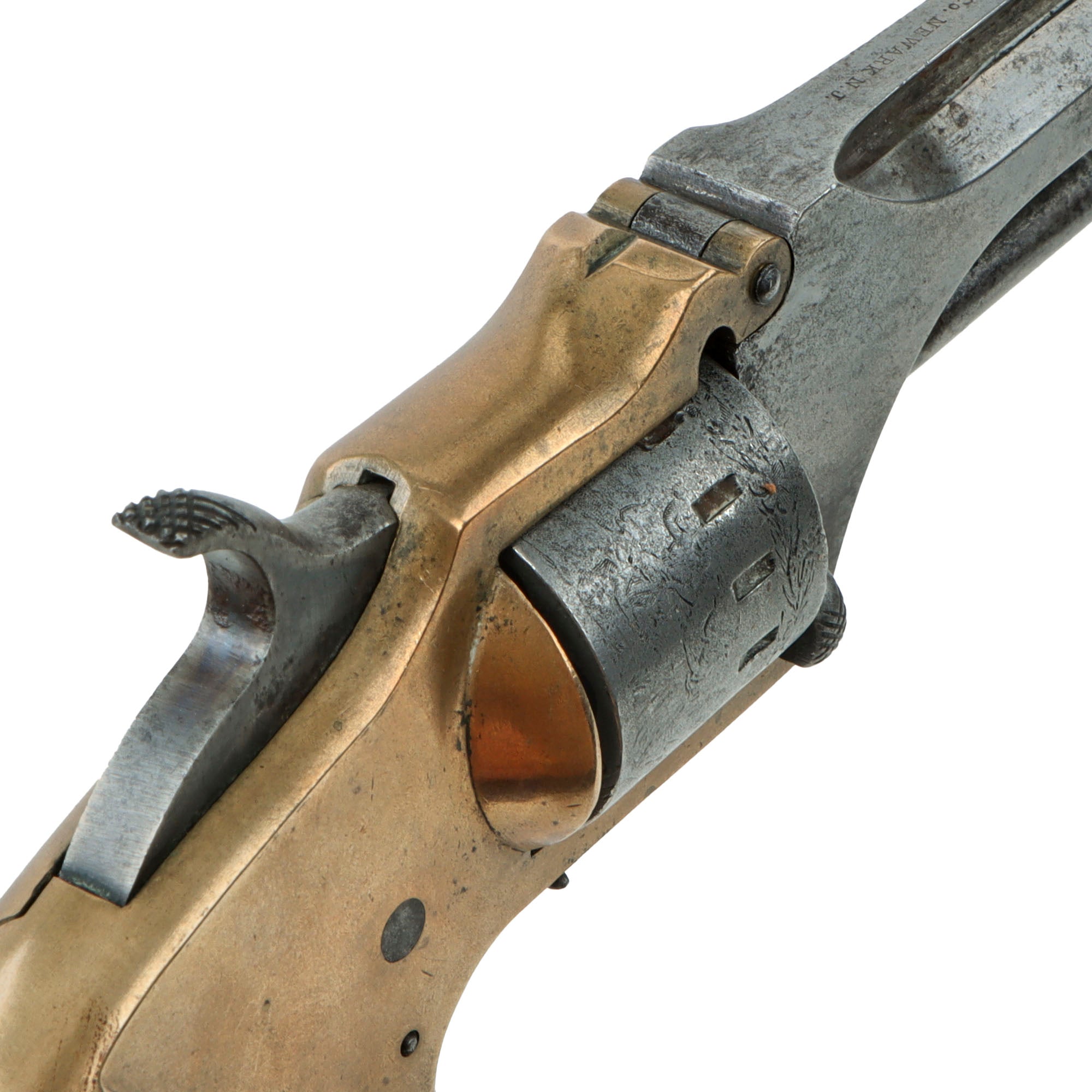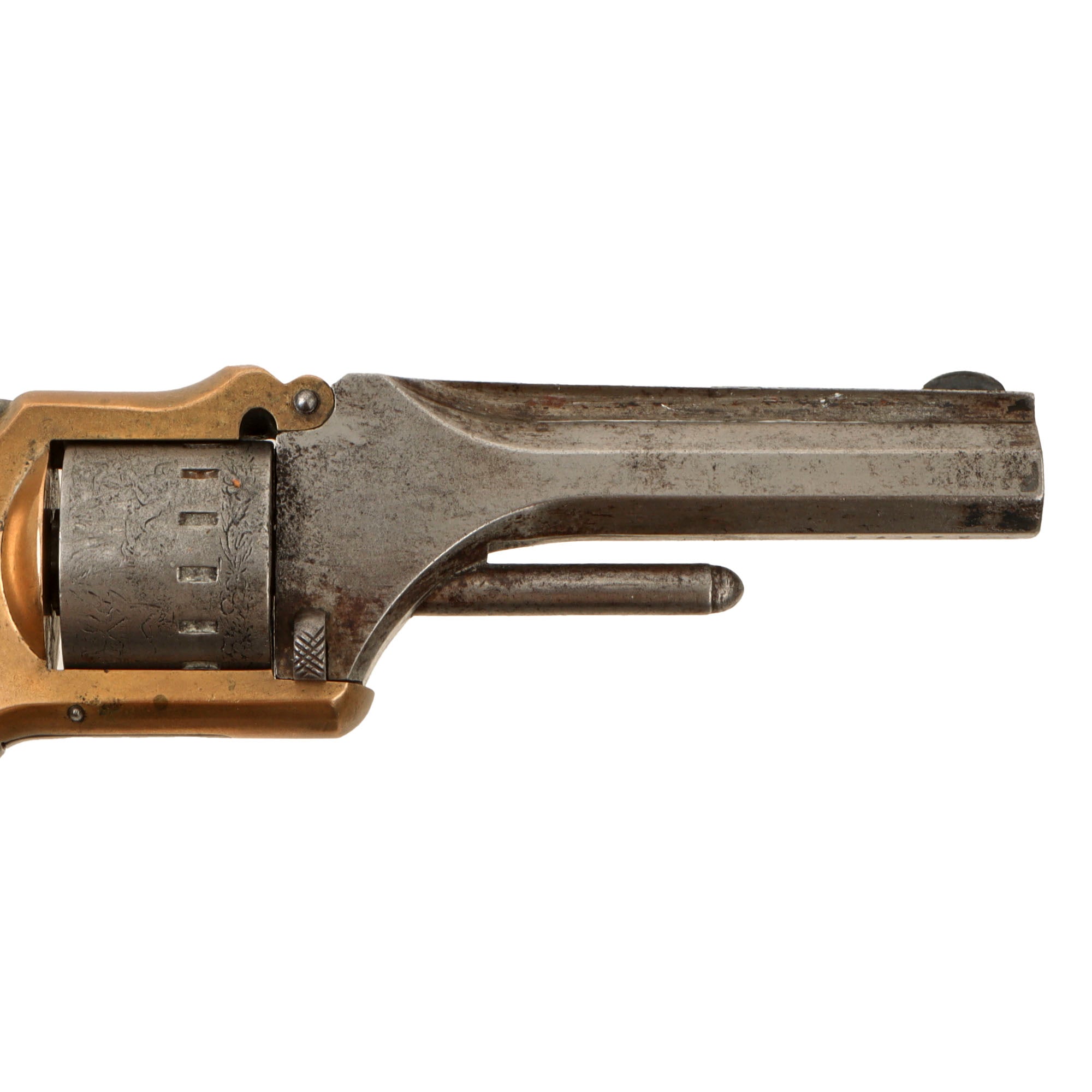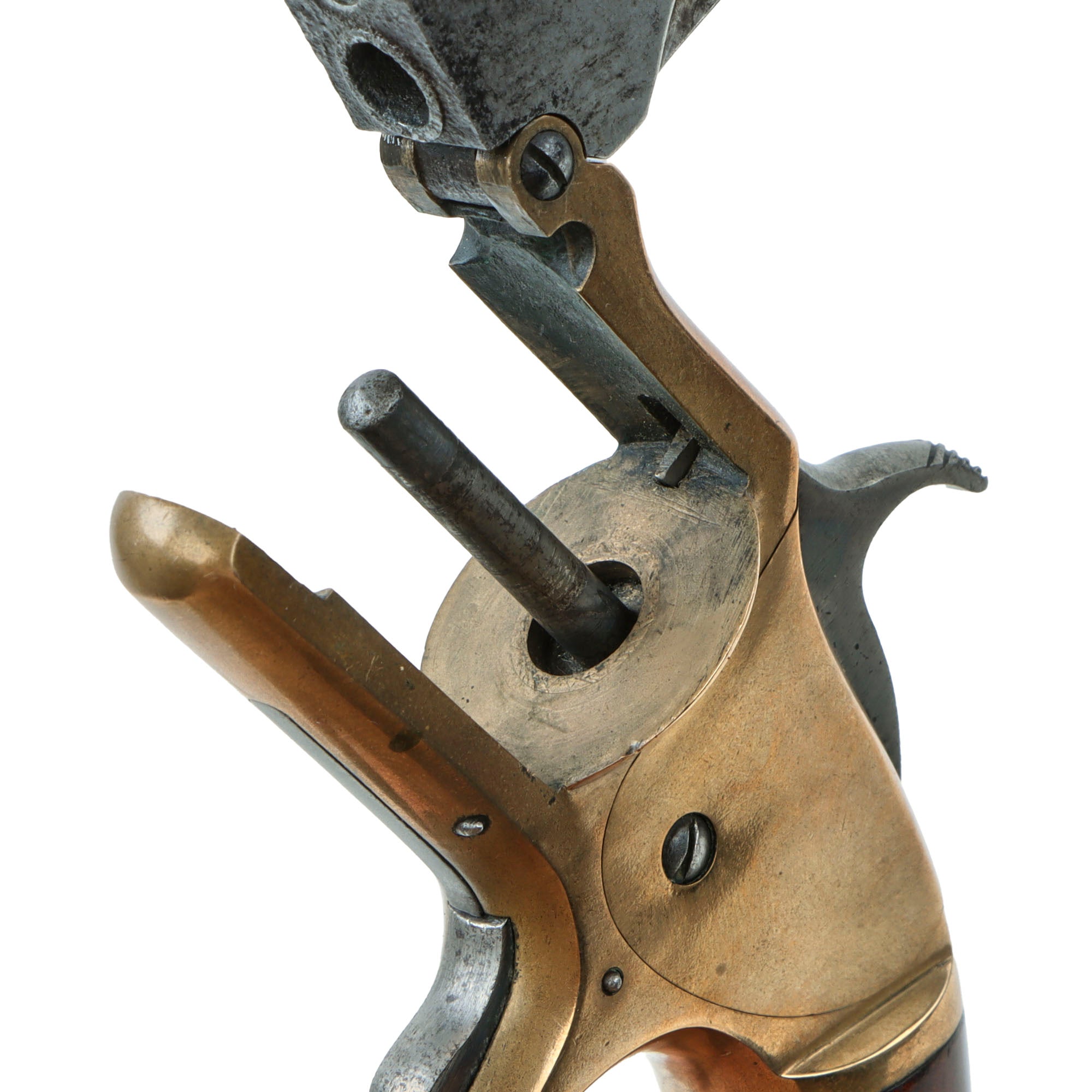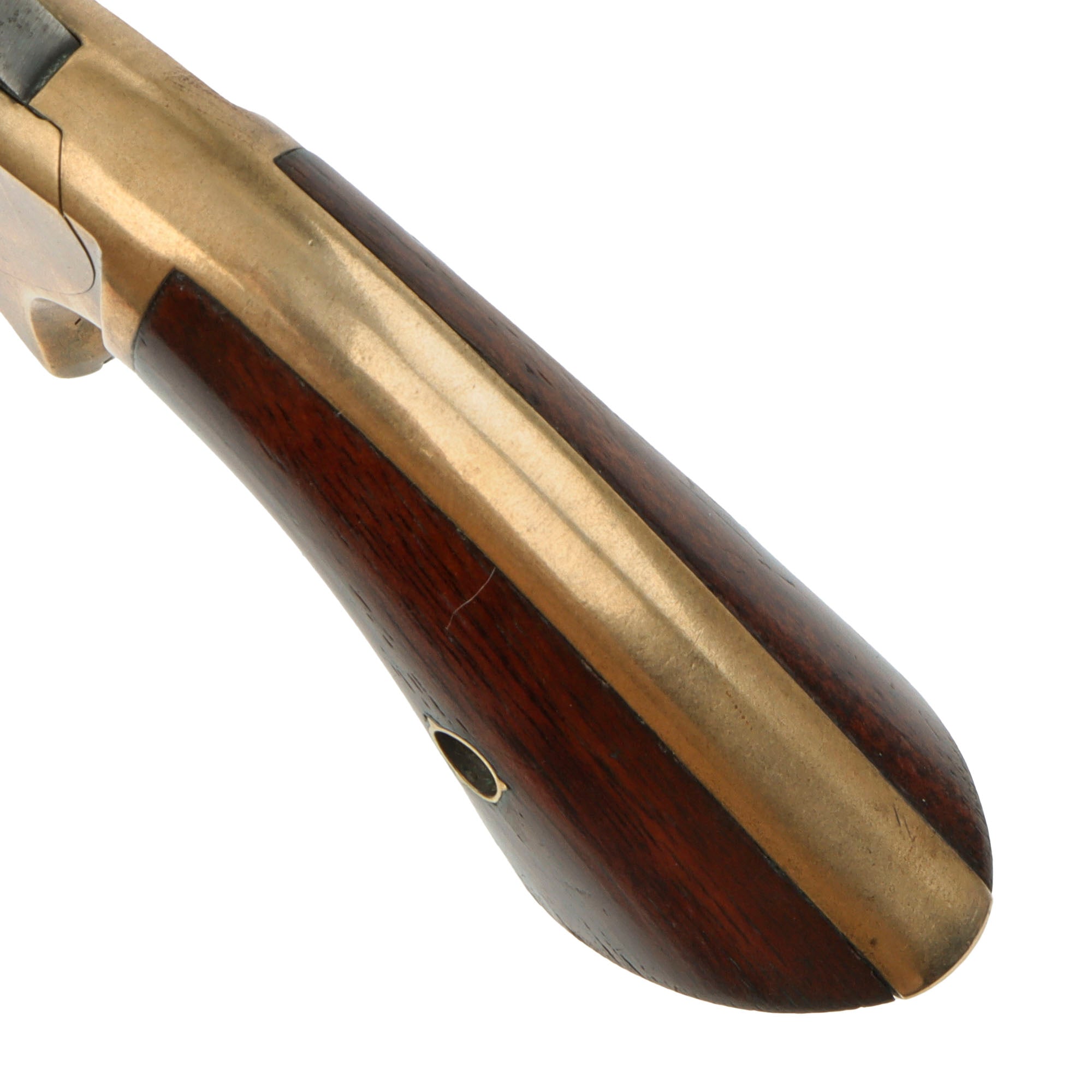 The revolver was most likely originally made with a blued or case hardened barrel and cylinder, with a nickel plated brass frame. Most of the original finish is gone, with the steel and iron portions showing a worn polished steel color, with just a bit of bluing at the end of the barrel, and the brass having faded to a lovely "mustard" color. There is engraving on the sides of the cylinder, which in this case is actually fairly well retained. It features a "spur" trigger and flat bottom grips made of a very fine Walnut finished with "Piano Varnish". This is well retained on both grip scales, which show some wear on the corners the bottom.
