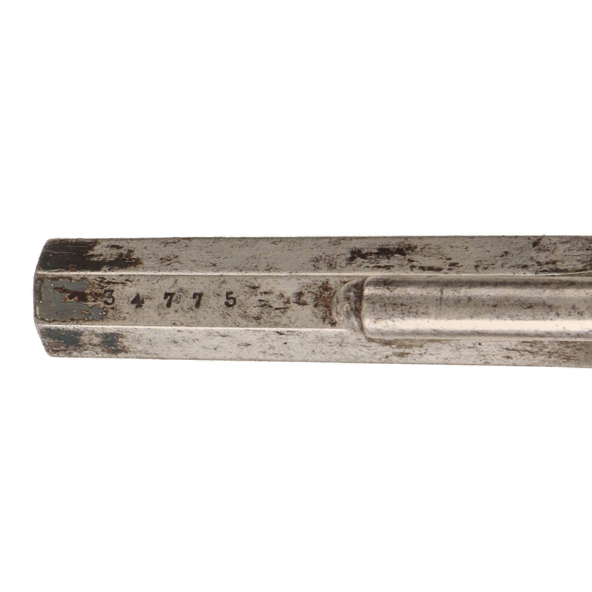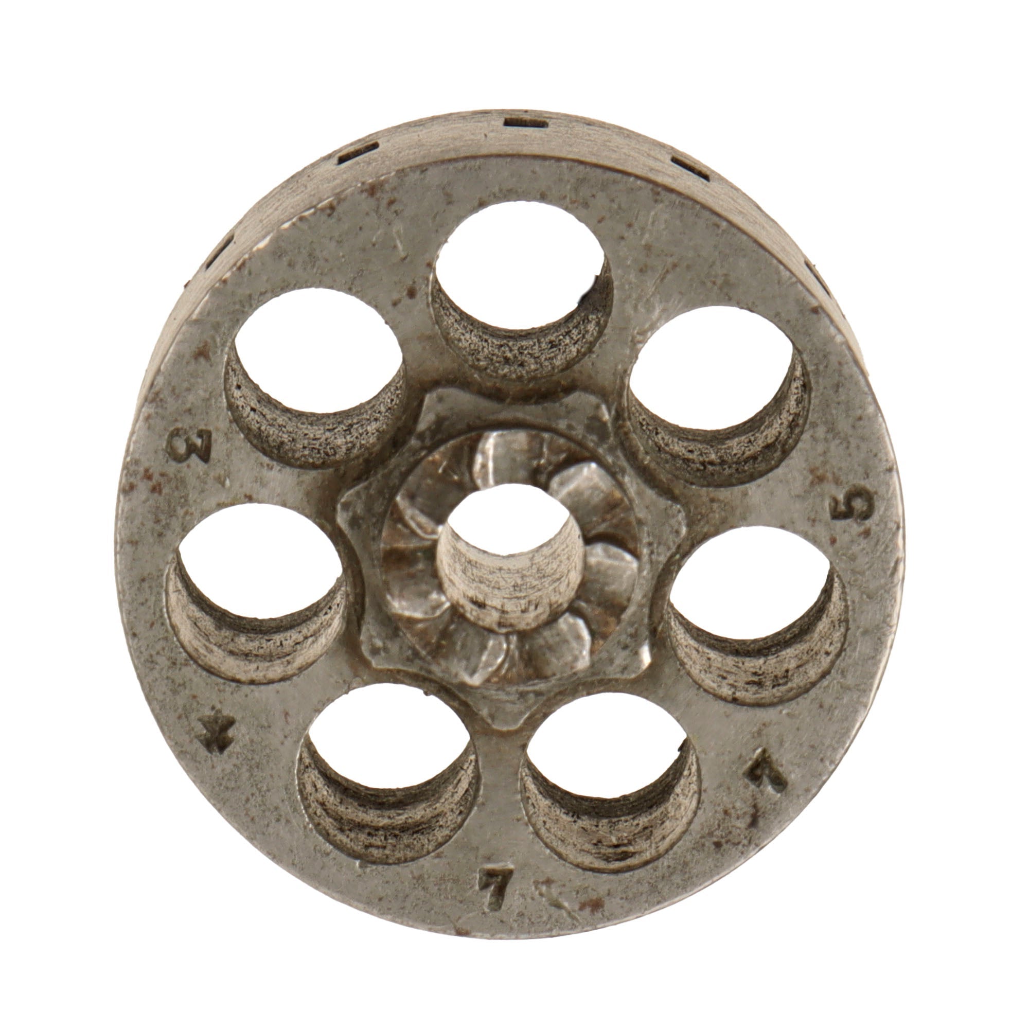 This has a tip up barrel revealing a SEVEN shot .22 caliber cylinder. There is a central ejector rod under the barrel that serves to knock out any stubborn empty cartridge shells, just as with the Smith & Wesson. The revolver functions very well, with a crisp action, accurate indexing, and a solid cylinder lockup. There is just a bit of wobble at full cock, and the action opens correctly for reloading, with the frame hinge solid. The bore is in very good condition, showing a mostly bright finish with clear lands and grooves. The three groove rifling is still crisp, and there is just a bit of past fouling and oxidation, now cleaned away.