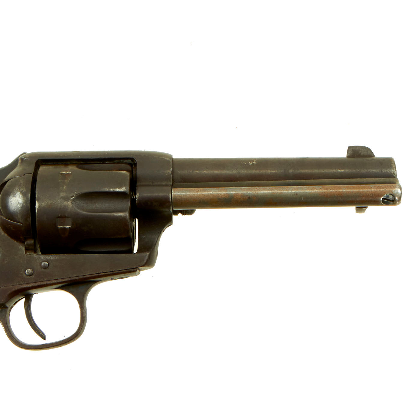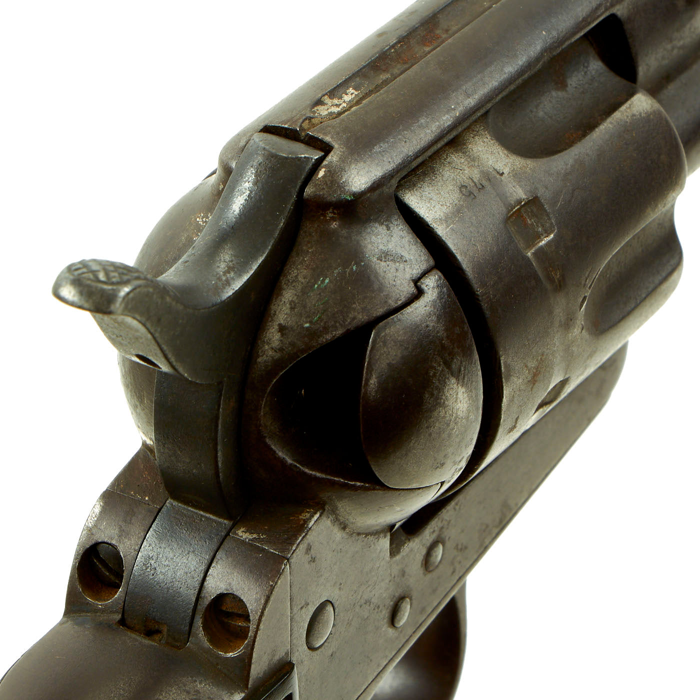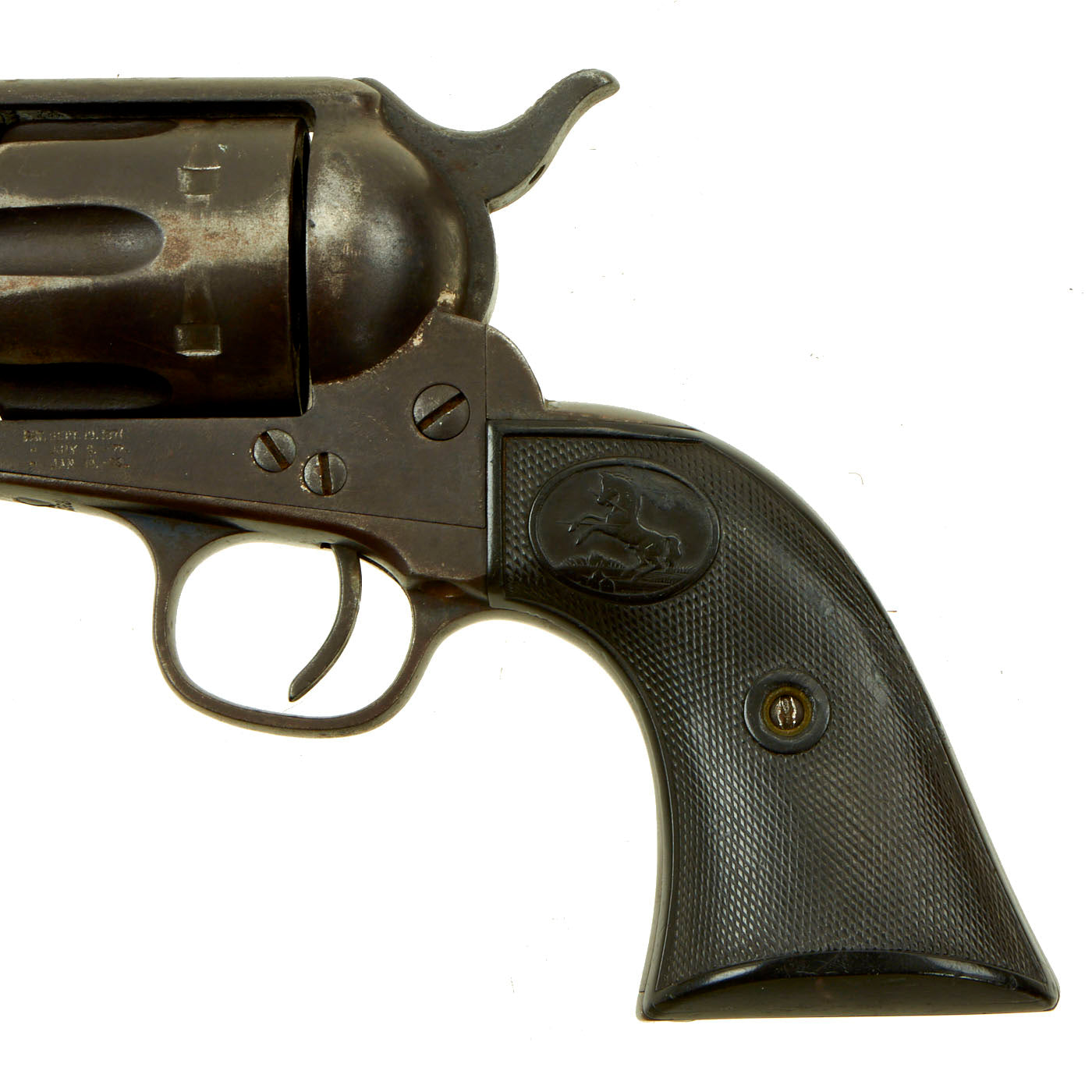 Original Items: Only One Set Available. This is it! Every young "Old West" fans dream: A real Colt Cowboy Six-shooter! This very nice Colt Frontier Six Shooter SAA (Single Action Army) Revolver has a "Gunfighter Friendly" shortened 4 1/2" barrel, cut down to make it easier to draw. The revolver has definitely had work done and parts replaced over its live. It looks to originally have possibly been nickel plated, as we can see a few tiny spots in the recesses of the frame, however that has almost entirely flaked away. Now it has a great aged steel patina, and it still retains the original Colt "Prancing Pony" hard rubber grip scales.