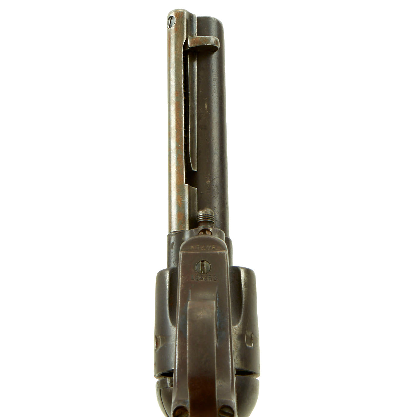 The revolver presents beautifully, and really has the look of a sidearm that was "really there" in the old west. The mottled patina is lovely, and the original grips still have most of their checkered pattern, with clear colt "Prancing Pony" emblems still present, and no repairs that we can see.