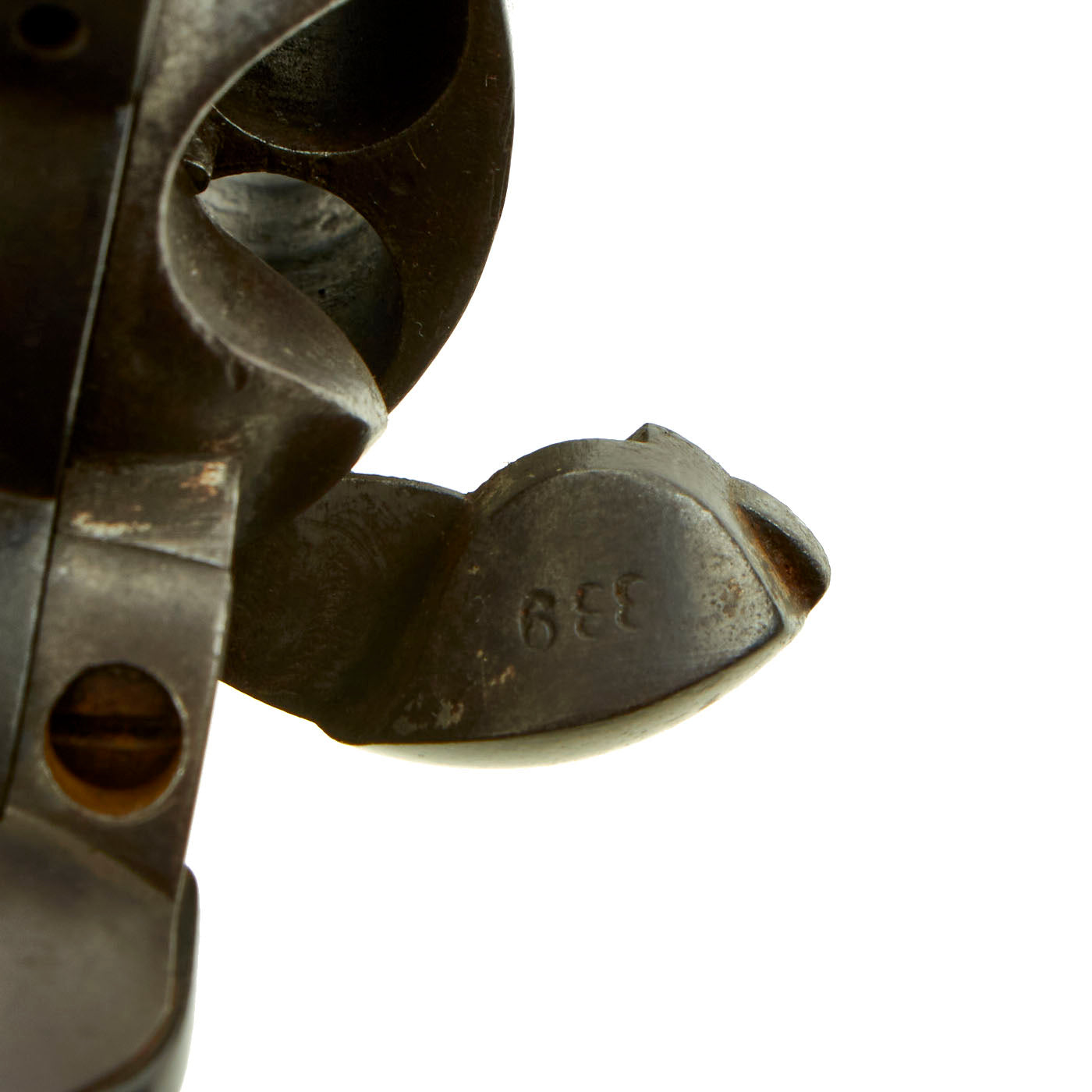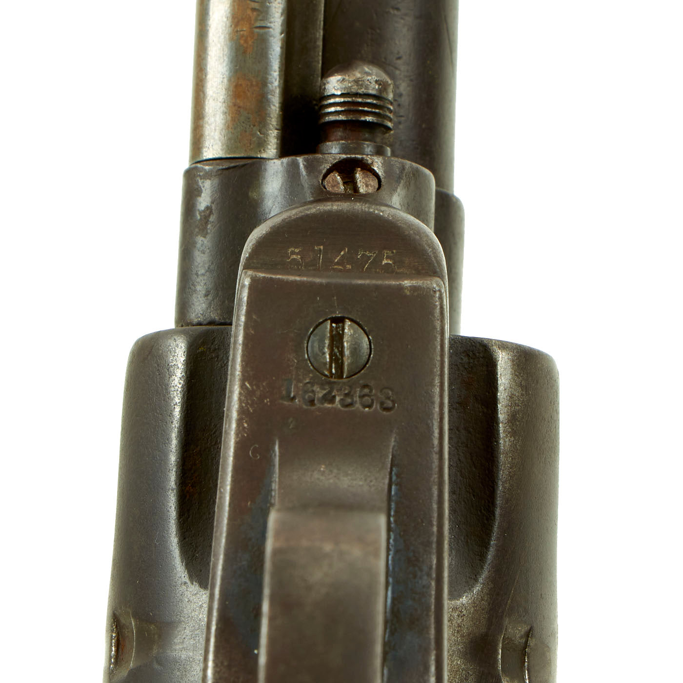 The revolver's serial number is 51475, marked on the frame, which indicates manufacture in 1879. It also has shortened number 1475 on the cylinder, which Colt stopped marking in 1883. The grip frame and trigger guard are marked with a different serial number, 162363, which indicates 1895 production, so the trigger guard and grip frame were swapped out, a common occurrence in the old west. The loading gate is marked with assembly number 339.