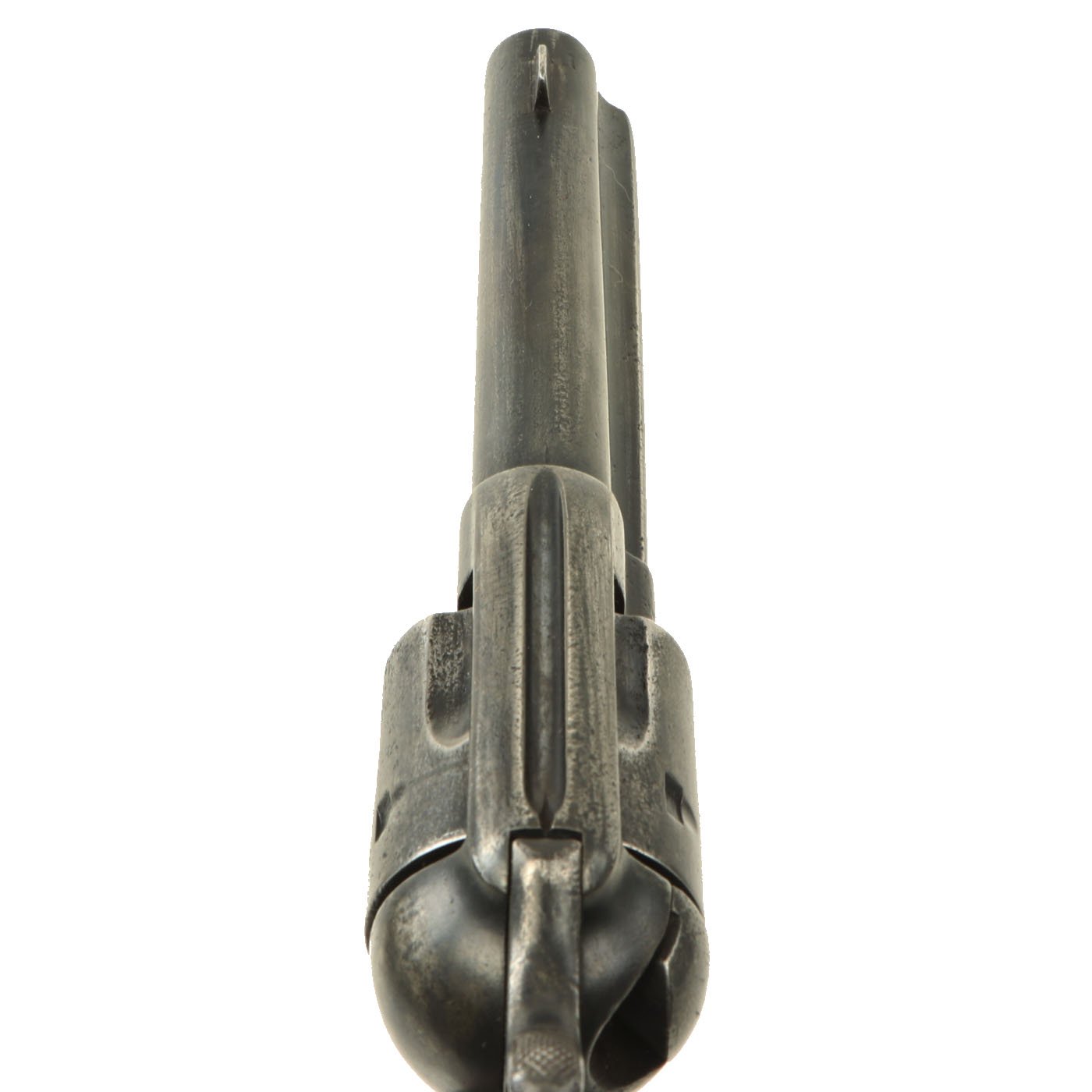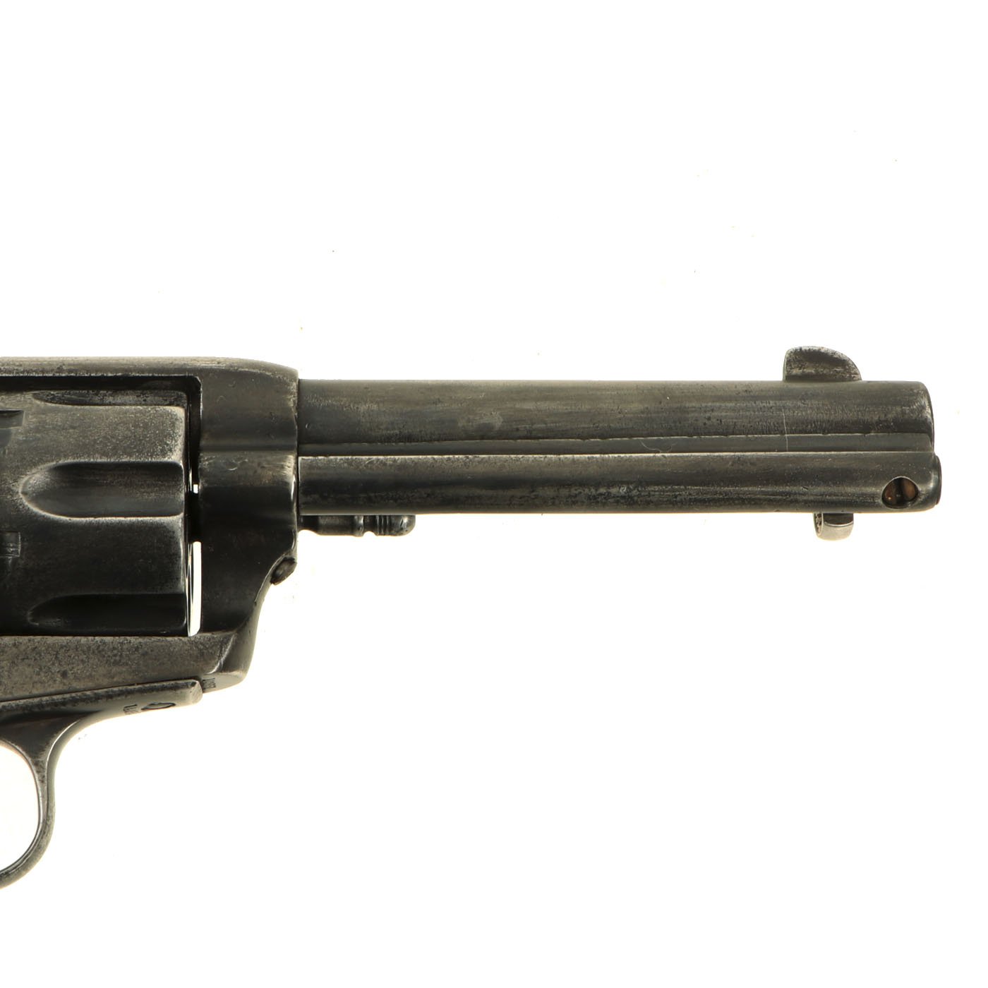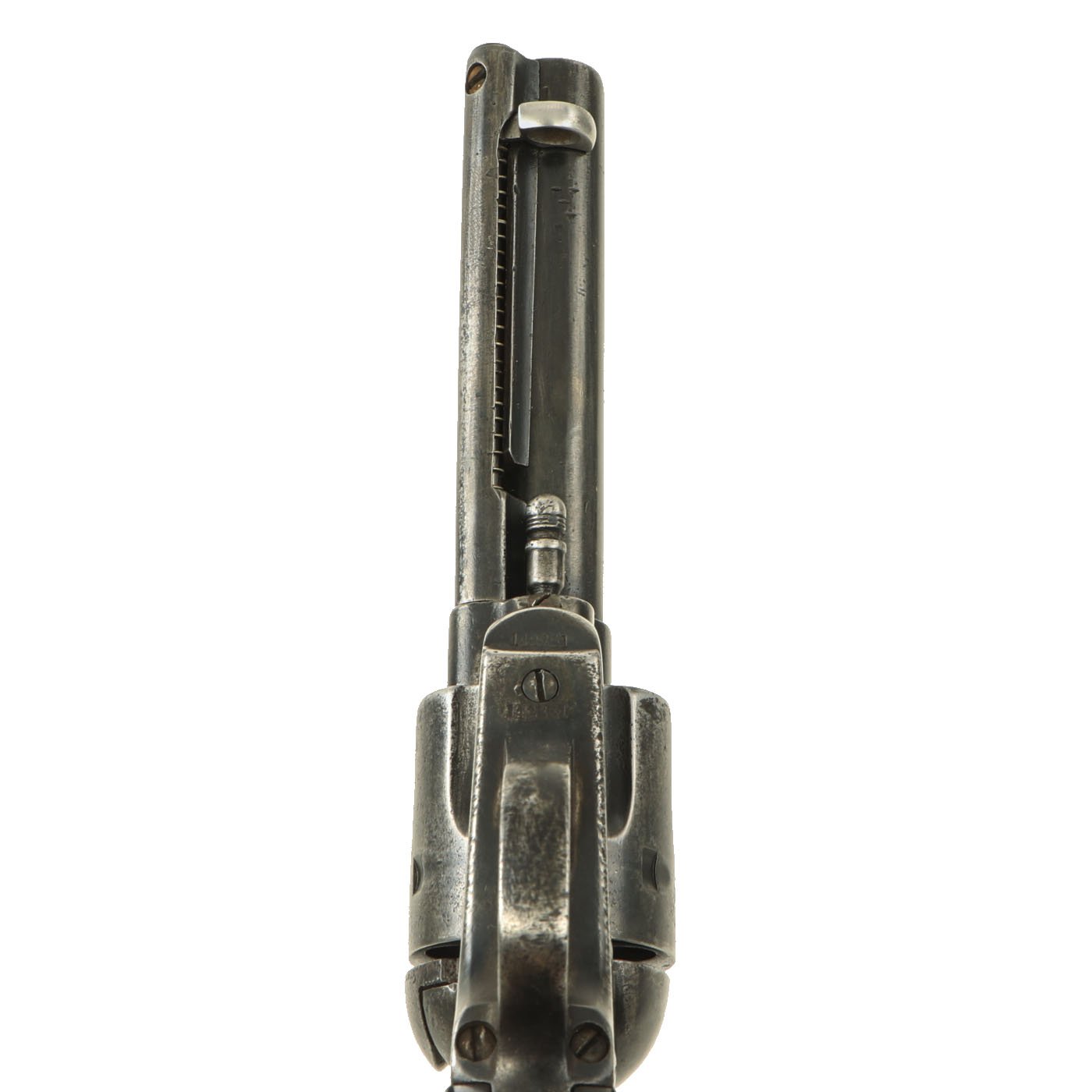 Mechanically, the action is smooth, with a good cylinder lock up, and crisp dry fire. The cylinder base pin slides out easily, allowing the cylinder to be removed for cleaning and inspection. The action has all four clicks with a functional loading position, and we have not noticed any of the usual finicky behavior of old revolvers. Really a great action on this example. The ejector door swings open easily, and the ejector itself works flawlessly. The bore is clear with visible rifling, and a partly bright finish. This is a revolver that looks to have been carried around extensively, but not actually fired that much.