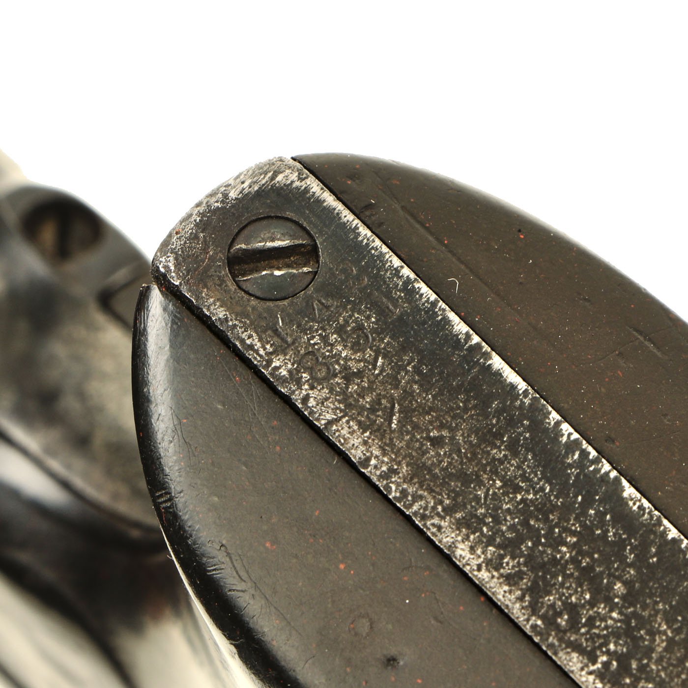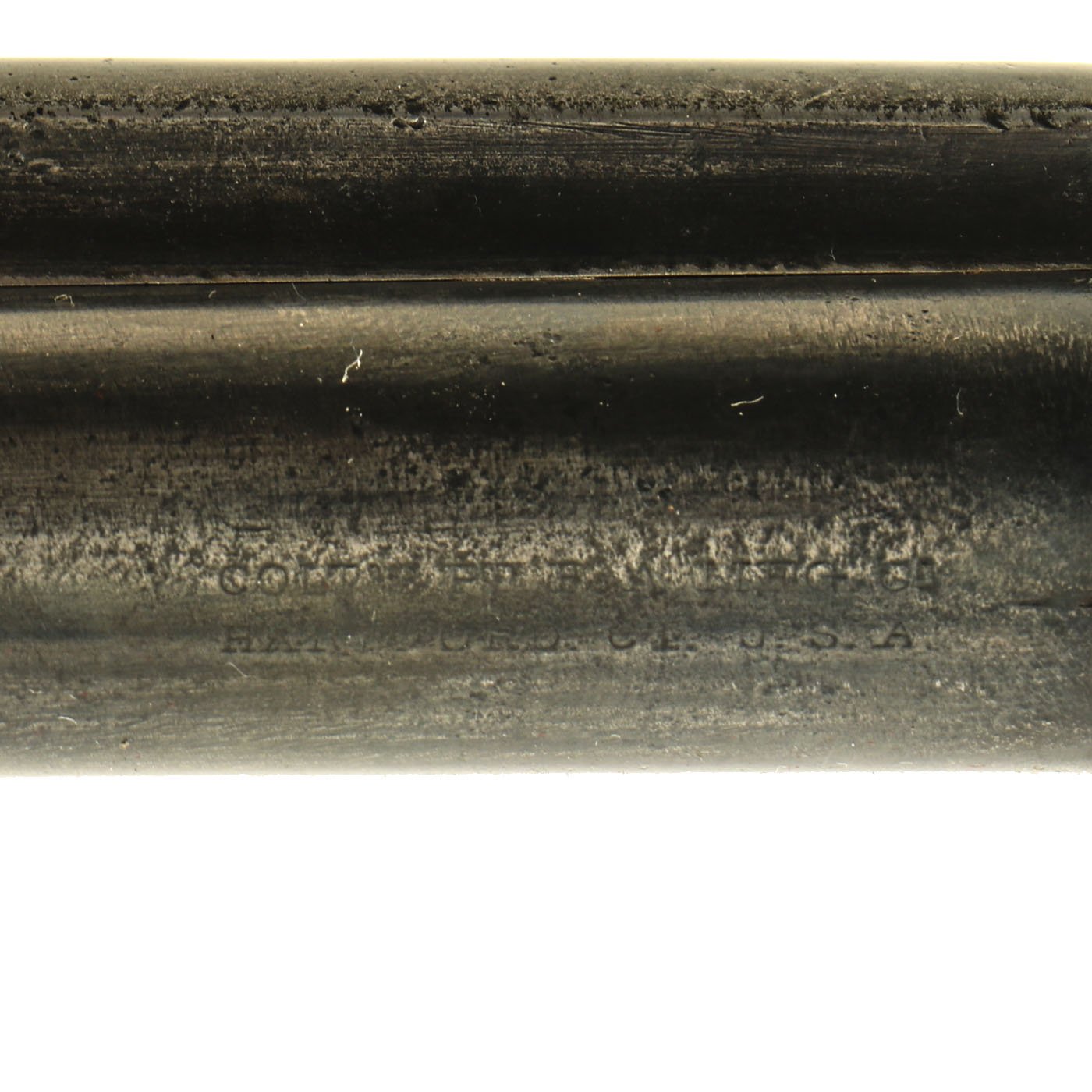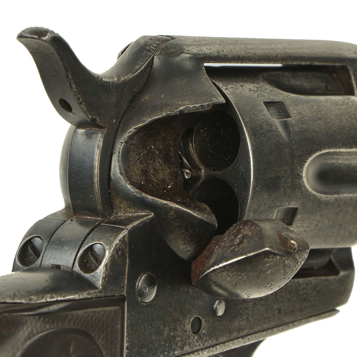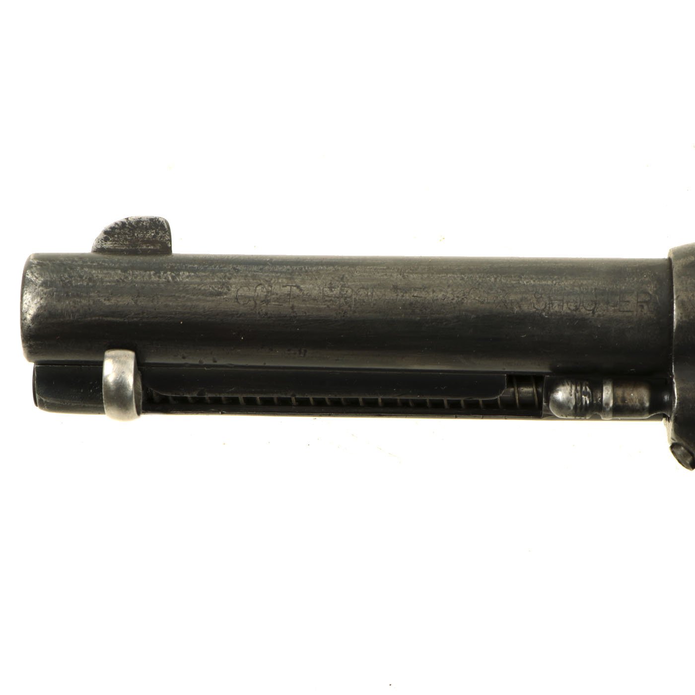 Mechanically, the action is smooth, with a good cylinder lock up, and crisp dry fire. The cylinder base pin slides out easily, allowing the cylinder to be removed for cleaning and inspection. The action has all four clicks with a functional loading position, and we have not noticed any of the usual finicky behavior of old revolvers. Really a great action on this example. The ejector door swings open easily, and the ejector itself works flawlessly. The bore is clear with visible rifling, and a partly bright finish. This is a revolver that looks to have been carried around extensively, but not actually fired that much.