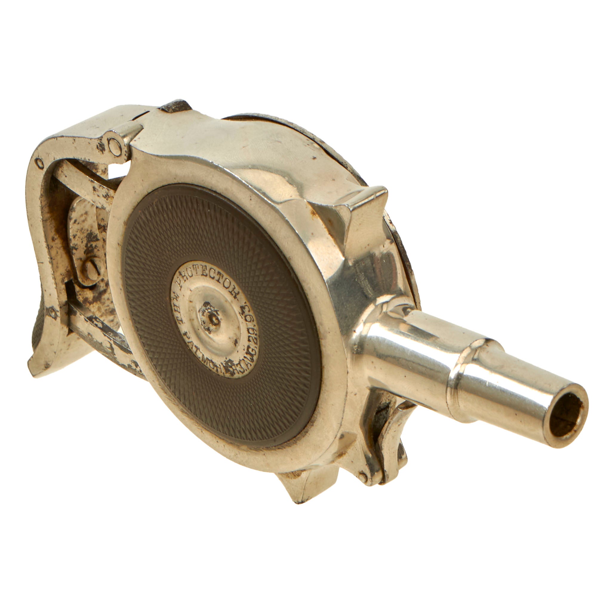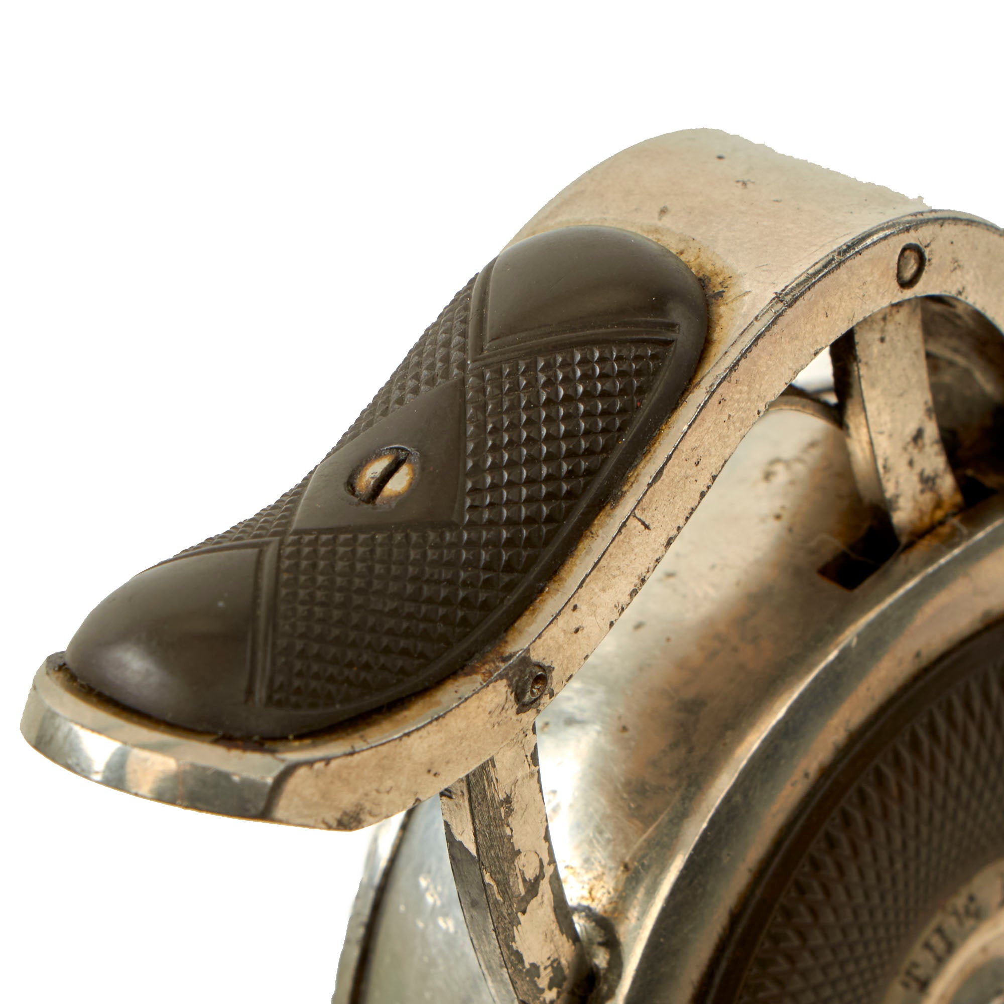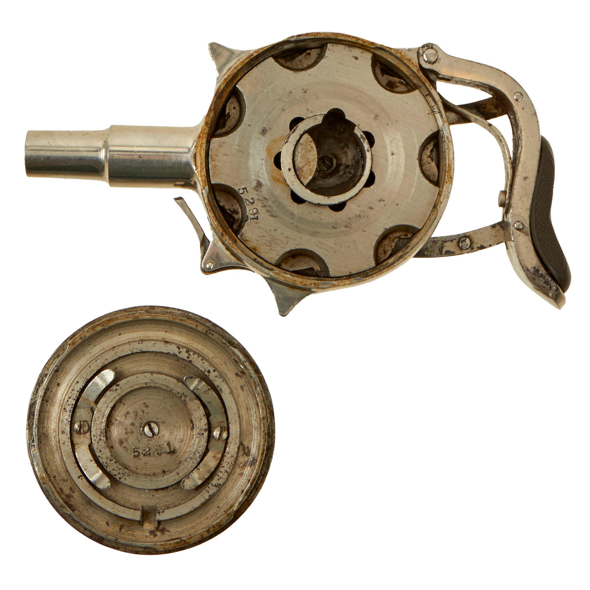 The revolver/pistol is in great condition, showing just a bit if plating loss to the exterior with subsequent oxidation, but no major issues. The textured bakelite pads on both sides show no cracking or major damage, just a few scratches and scrapes from long service. The cover comes off easily, and the "cylinder" can easily be removed from the frame for inspection and cleaning.