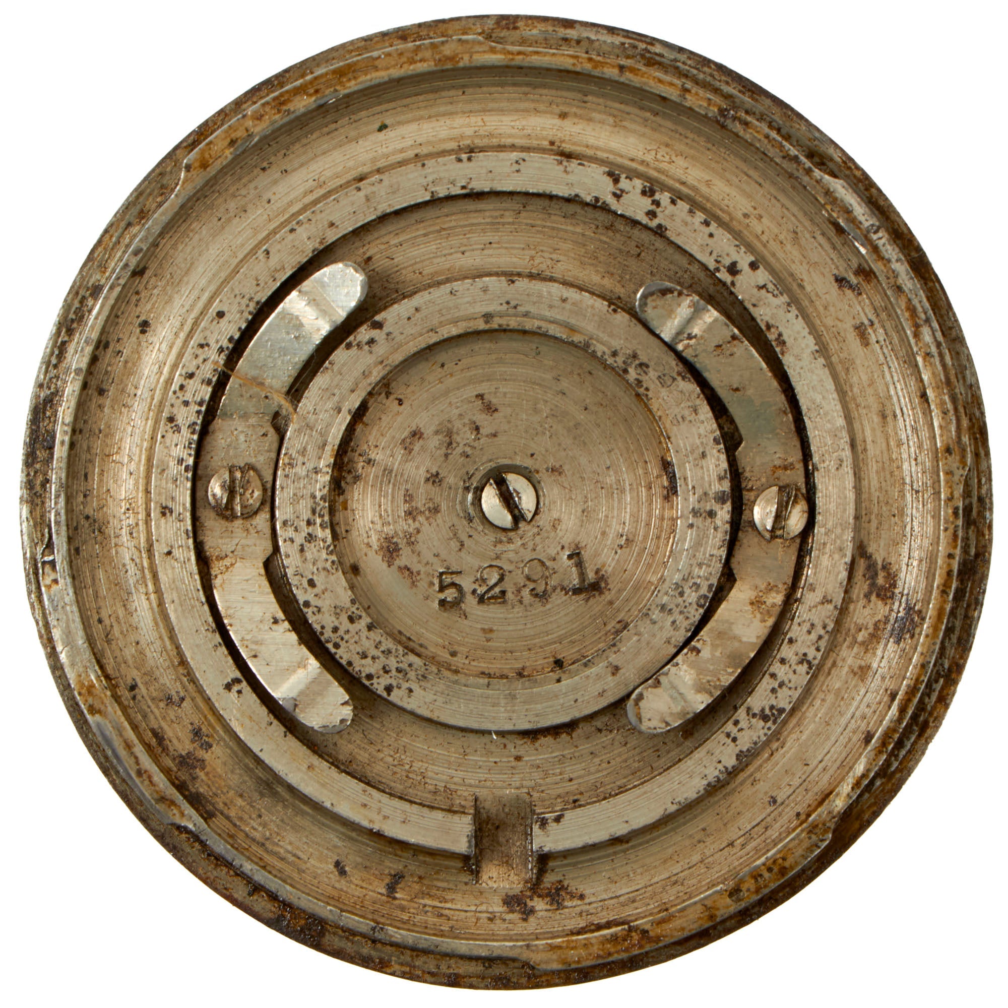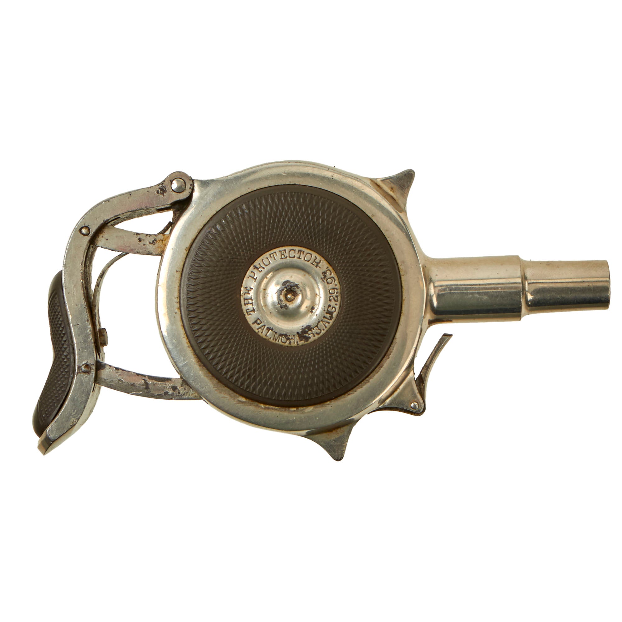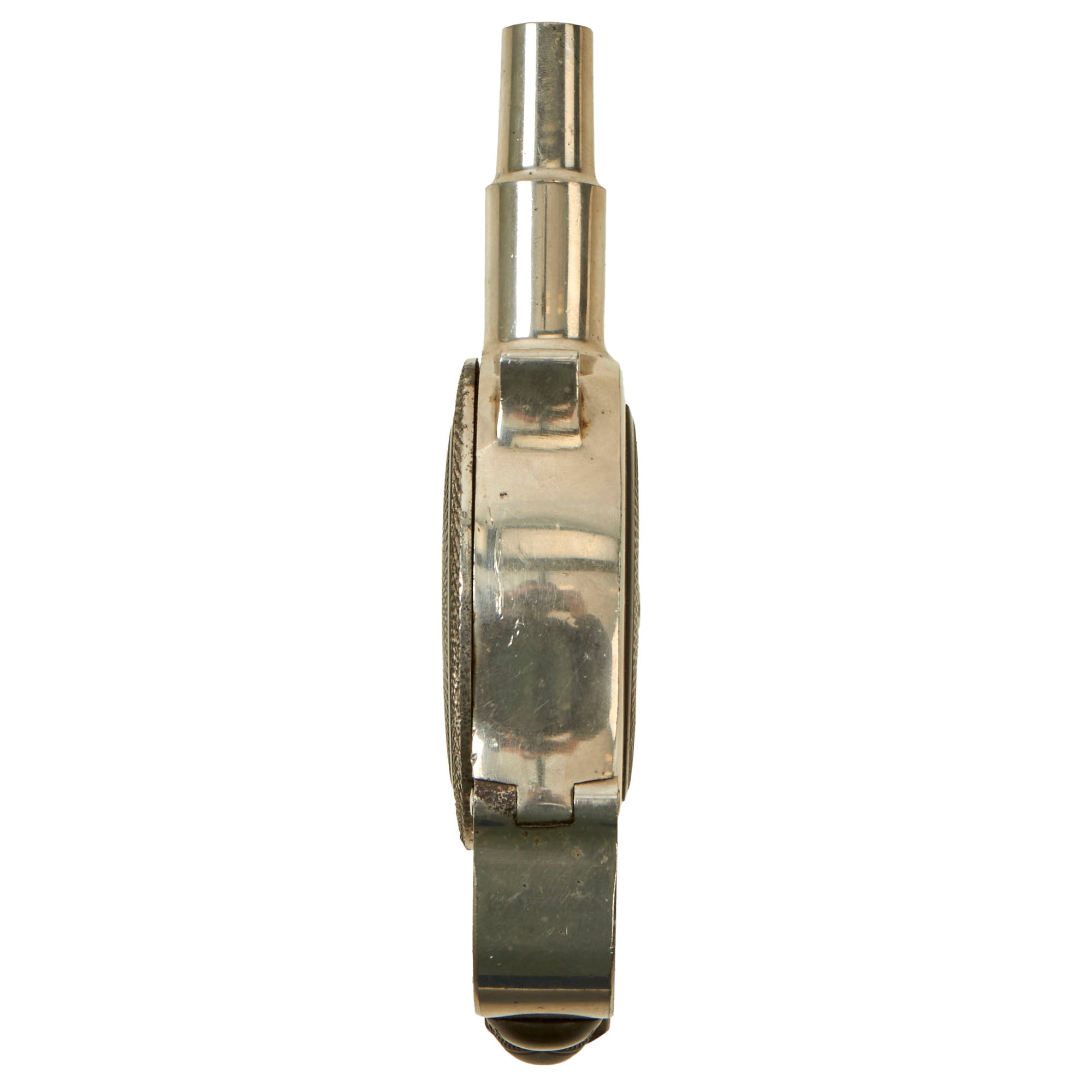 The revolver/pistol is in great condition, showing just a bit if plating loss to the exterior with subsequent oxidation, but no major issues. The textured bakelite pads on both sides show no cracking or major damage, just a few scratches and scrapes from long service. The cover comes off easily, and the "cylinder" can easily be removed from the frame for inspection and cleaning.