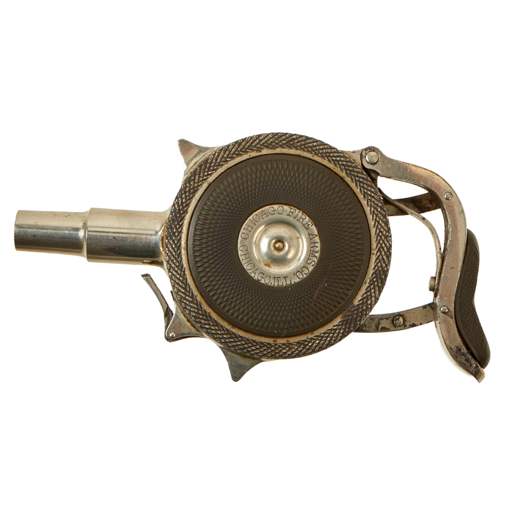 First invented by The Frenchman JACQUES TURBAUX of Paris in 1882 the Patent was purchased by PETER FINNEGAN of Austin, Illinois in 1892 who immediately formed the CHICAGO FIRE ARMS COMPANY to produce this weapon to be launched at the WORLD'S COLUMBIAN EXPOSITION of 1893. Finnegan contracted the Ames Sword Company of Chicopee, Massachusetts to manufacture 15,000 pistols, however only 1,500 were produced in time for the exposition. Legal action ensued, and a settlement was reached.