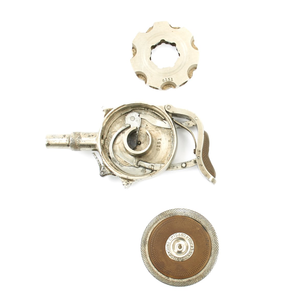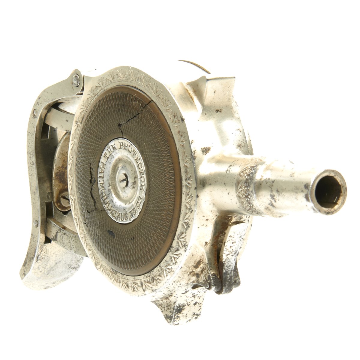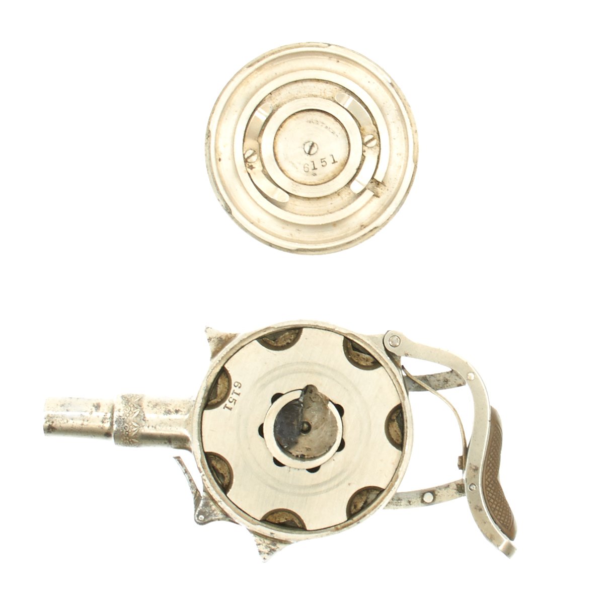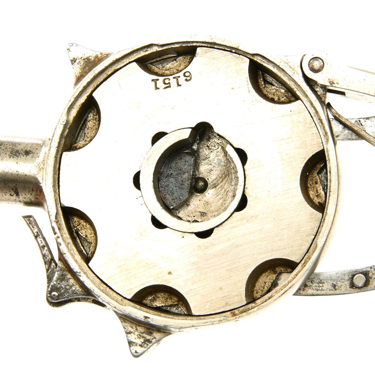 Eventually total of 12,800 units were produced by Ames, mostly Seven shot with a Nickel Finish in .32 Rimfire such as this one. The serial number of our fine example is 6151, which is marked on the inside of the frame, on the cylinder, and on the removable cover. The outside of the cover is marked around the center with: