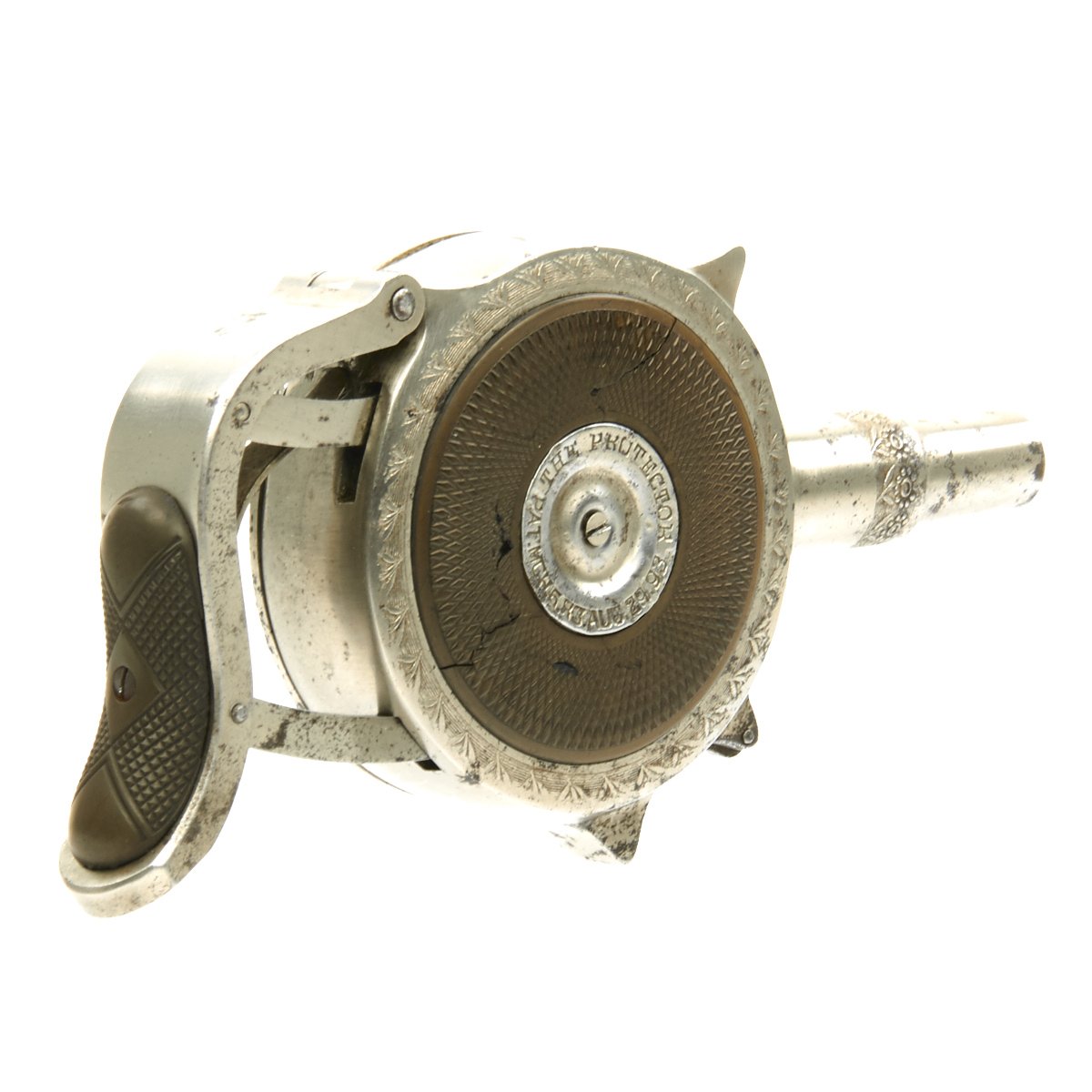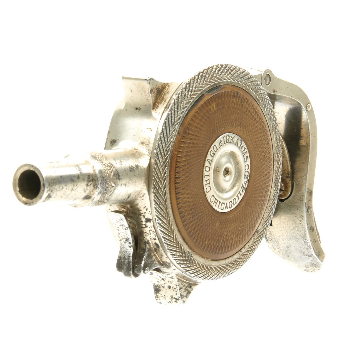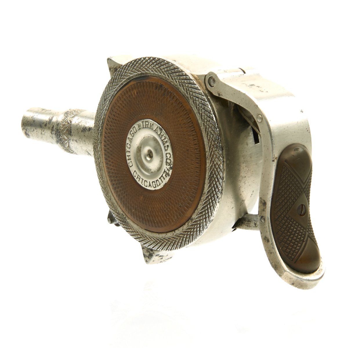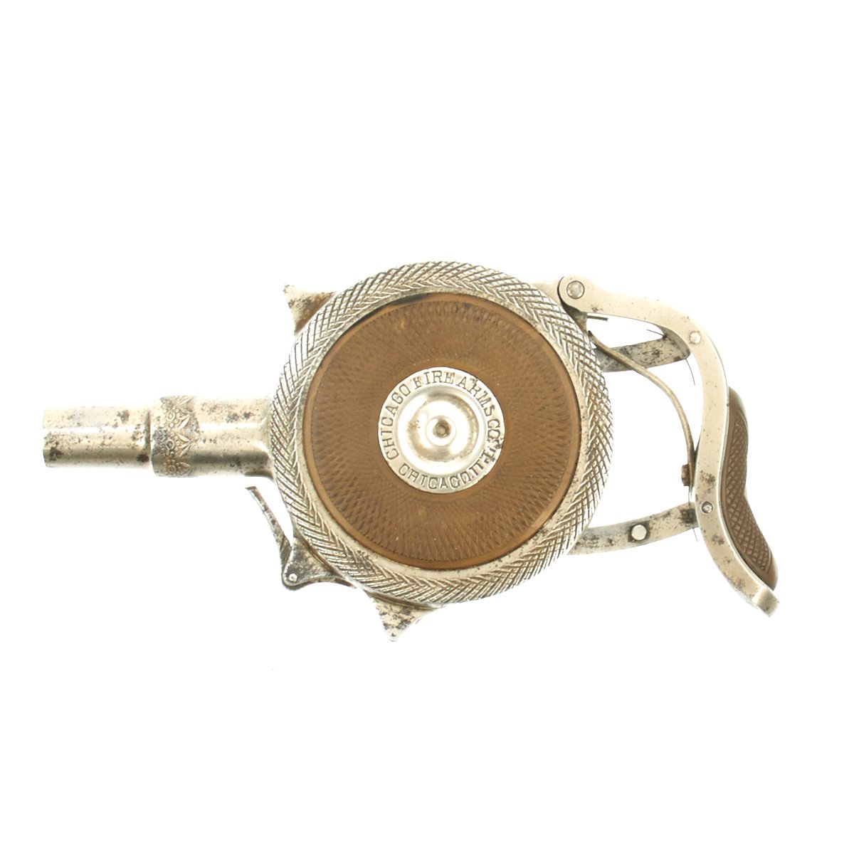 First invented by The Frenchman JACQUES TURBAUX of Paris in 1882 the Patent was purchased by PETER FINNEGAN of Austin, Illinois in 1892 who immediately formed the CHICAGO FIRE ARMS COMPANY to produce this weapon to be launched at the WORLD'S COLUMBIAN EXPOSITION of 1893. Finnegan contracted the Ames Sword Company of Chicopee, Massachusetts to manufacture 15,000 pistols, however only 1,500 were produced in time for the exposition. Legal action ensued, and a settlement was reached.