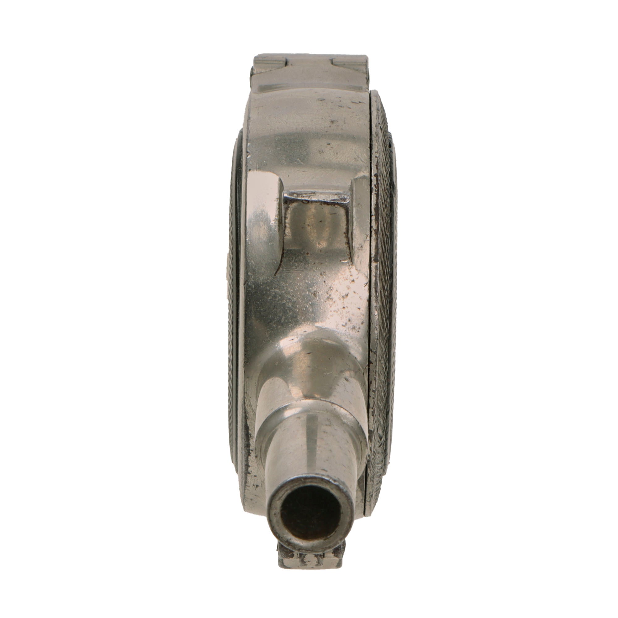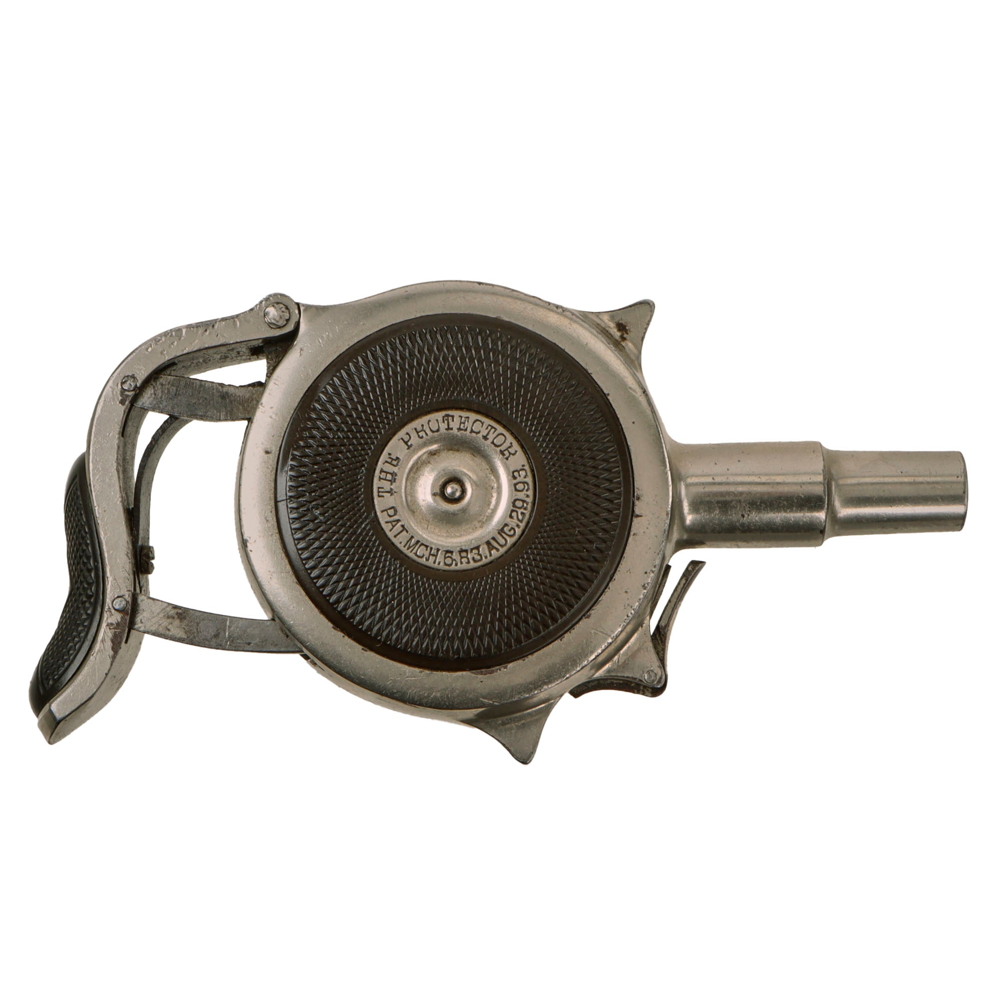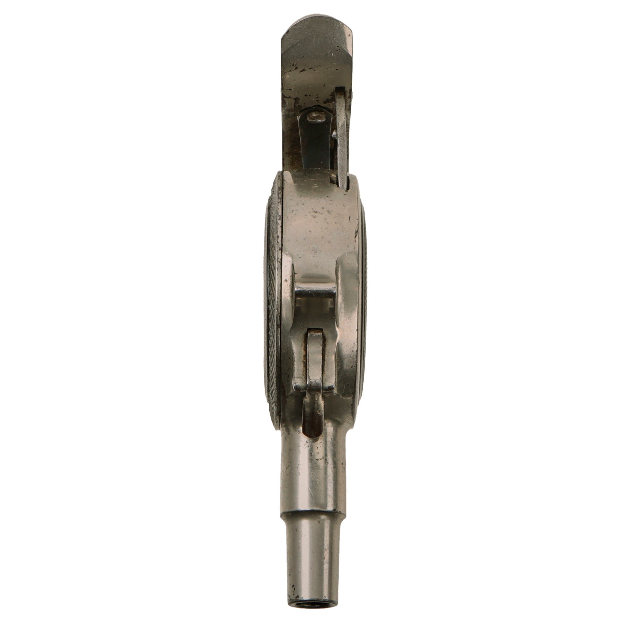 The revolver/pistol is in great condition, showing just a bit if plating loss to the exterior with subsequent oxidation, but no major issues. The textured bakelite pads on both sides show no cracking or major damage, just a few scratches, scrapes, and tiny chips from long service. The cover comes off easily, and the "cylinder" can easily be removed from the frame for inspection and cleaning.