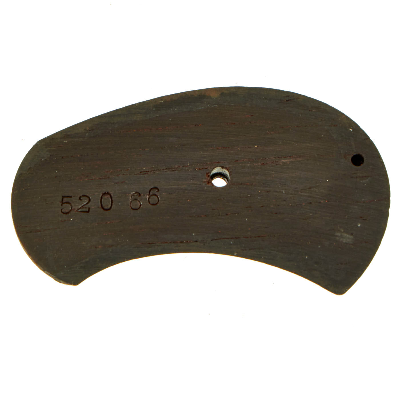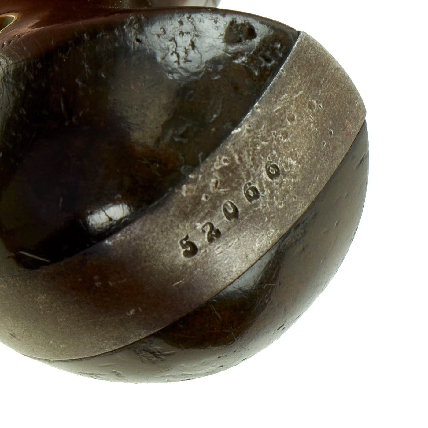 2nd Issue guns were serial numbered consecutively after the 1st Issue, with numbers ranging from approximately 26,300 through 127,000. Serial number on this example is 52066 placing it early-production around 1869-70. This number is found on the bottom of the grip, as well as on the inside of the right grip scale. There is also assembly number BB 4 on the grip frame, barrel, and cylinder.