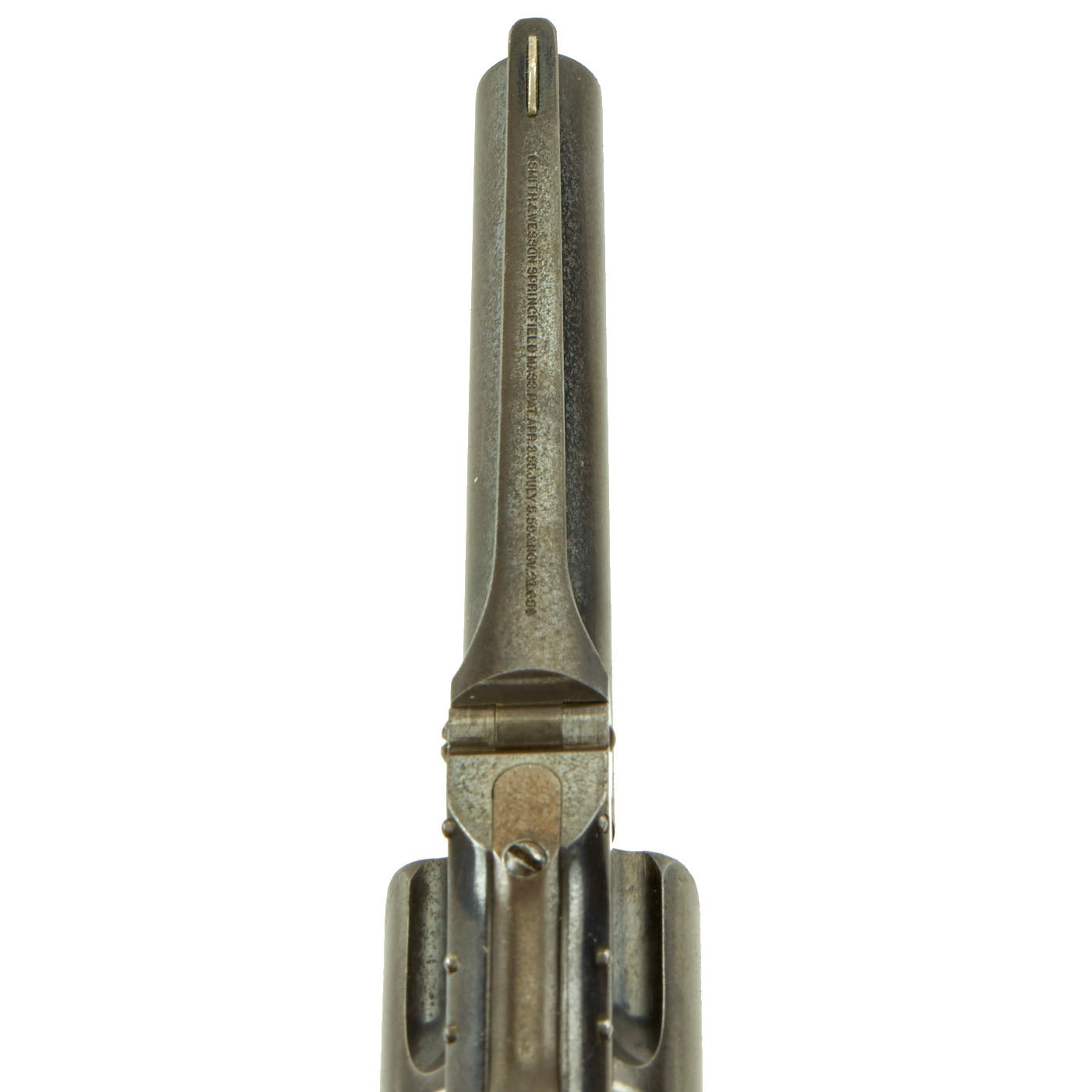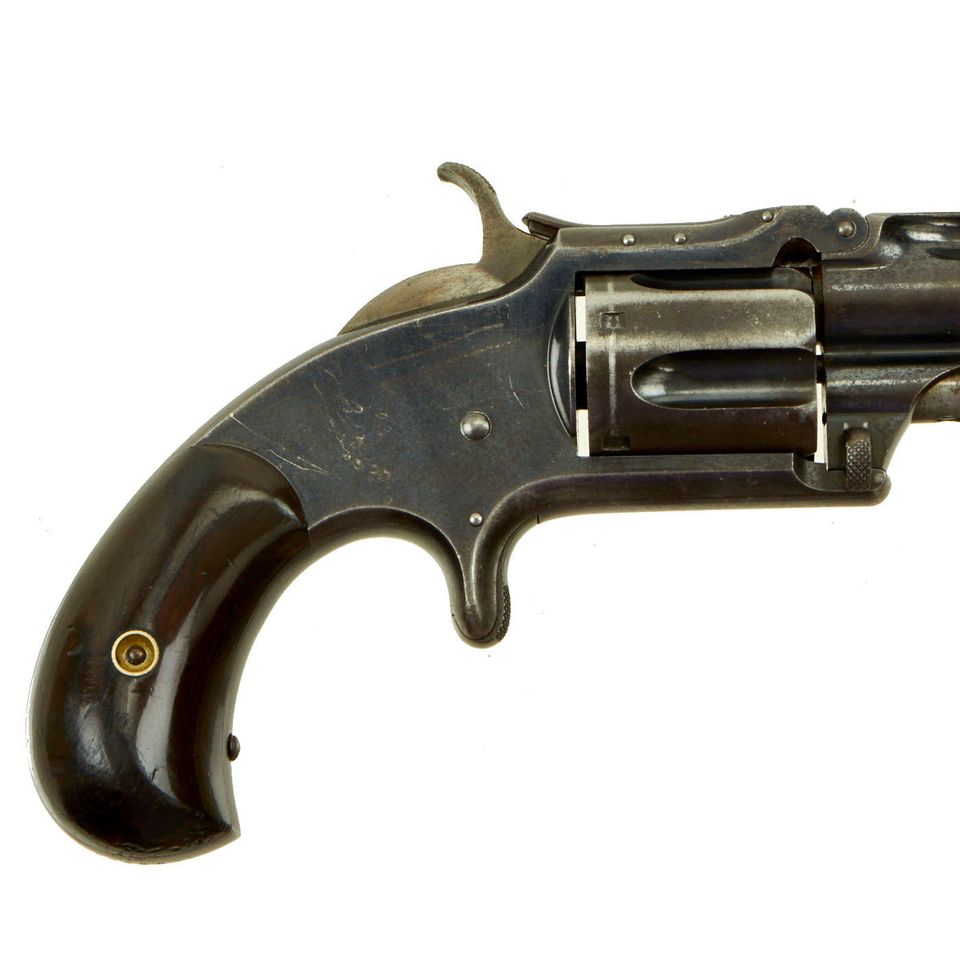 This is an excellent example of the Model 1 1/2, 2nd Issue Revolver with 3 1/2" barrel. Standard blued finish with rosewood grips. Produced by Smith and Wesson from 1868-1875, this was the firm's final improvement of the .32 rimfire tip-up with the more stylish stream-lined barrel, fluted cylinder, and birds head grips. The original Smith & Wesson address and patent dates are still easily readable on the top strap: