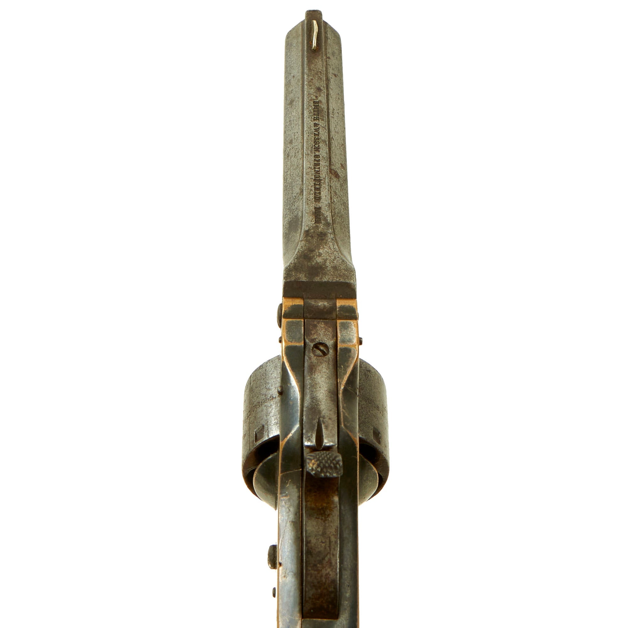 The model 1 is loaded by actually unhooking the bottom of the barrel so it could swivel upwards, allowing the entire cylinder to be removed in order to reload. Fitted with spur trigger, these were an extremely convenient little multi shot revolver ideal for a lady or gambler. Fully marked along the top of the barrel:-