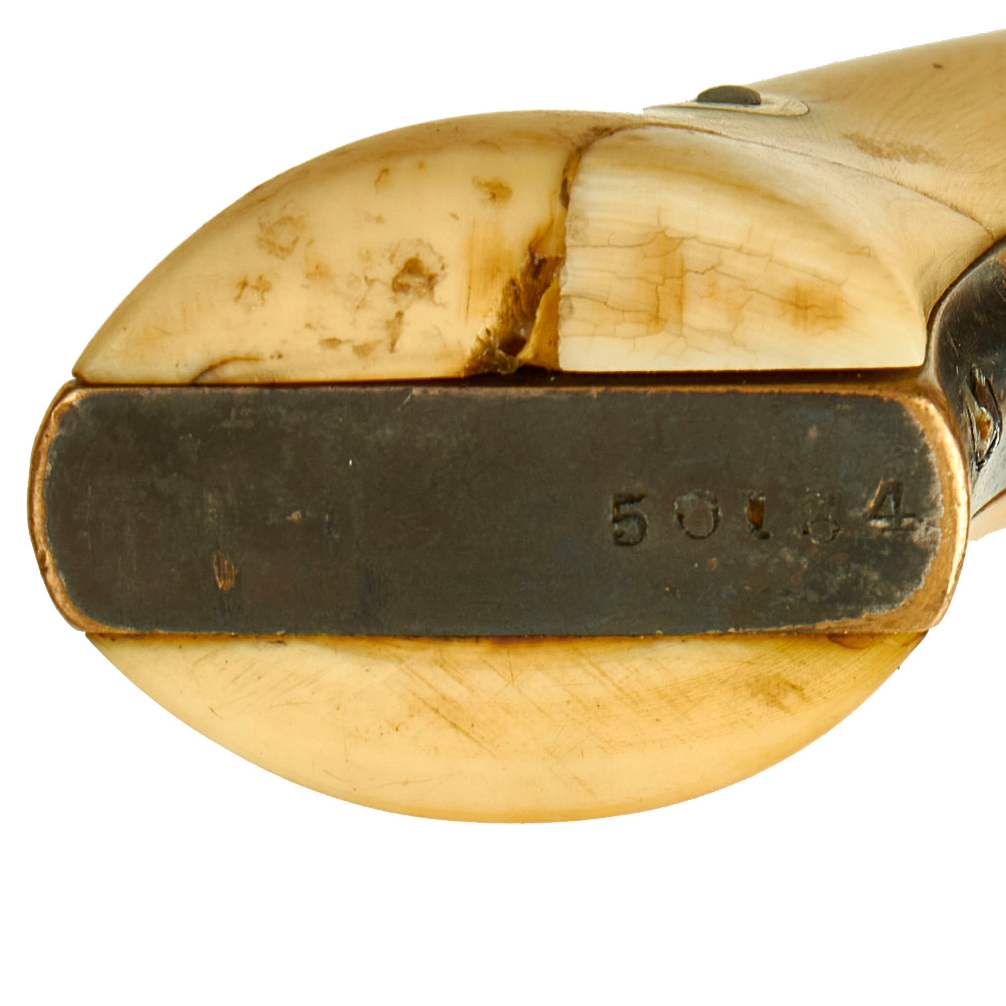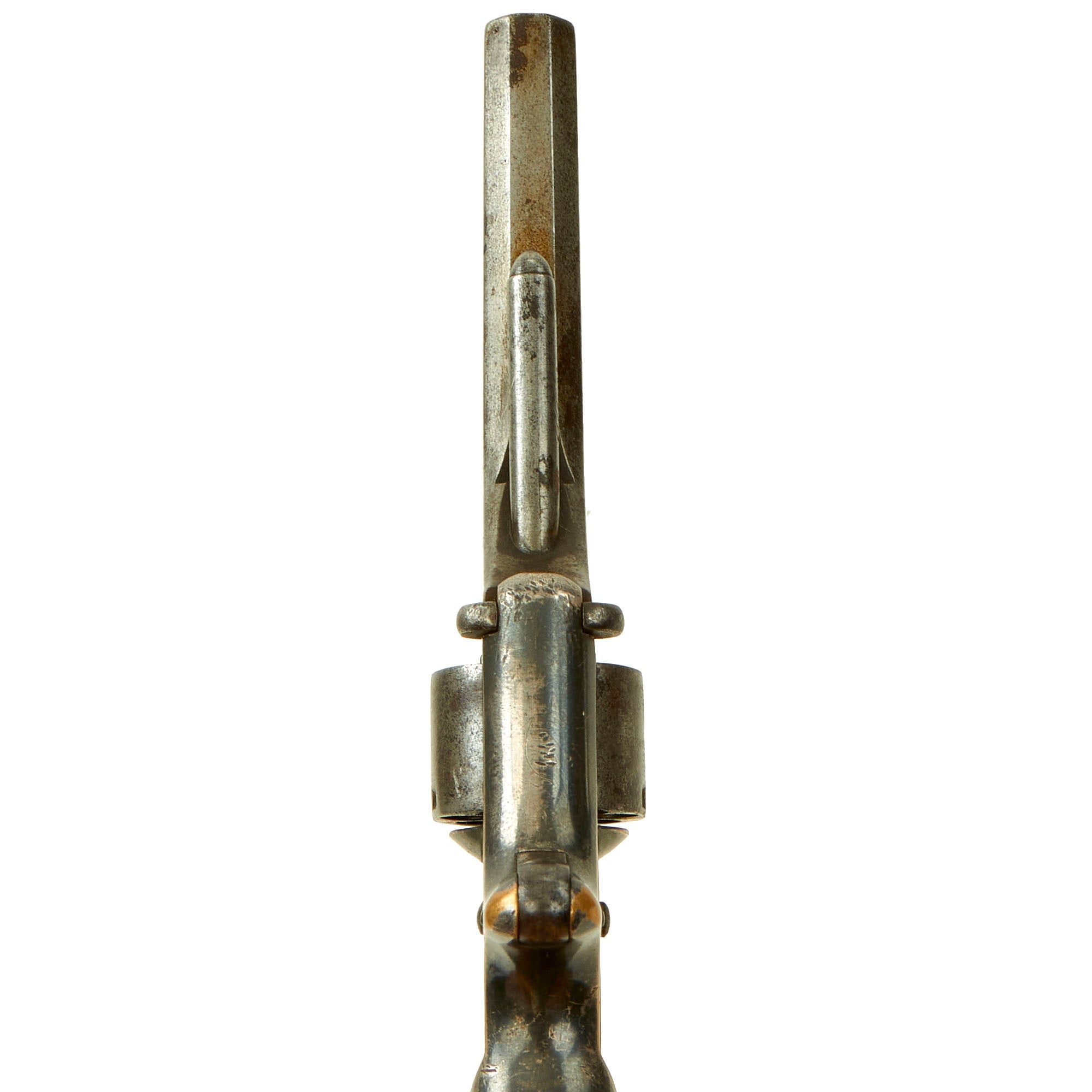 This very nice example has a silver plated and blacked / tarnished brass frame with a steel barrel and cylinder. Originally the barrel would have been case hardened, but cleaning has removed all of that finish, so now it has a gray oxidized patina, with a few areas of past peppering. The revolver is also fitted with lovely ivory grips, which look to be factory original!