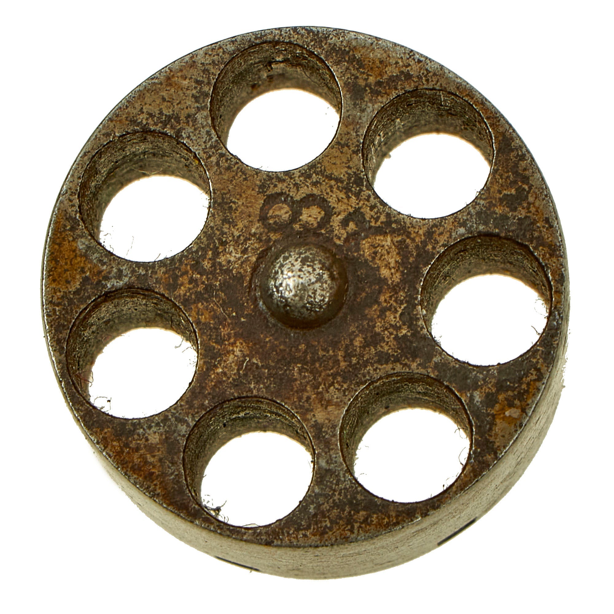 It is marked with serial number 50184 on the bottom of the grip and on the inside of the left grip scale. It also is marked with assembly number 889 on the left side of the grip frame. However, the front of the cylinder and the back of the barrel are marked with number 007, so it is possible that they were swapped out during the revolver's service life, a relatively common occurrence.