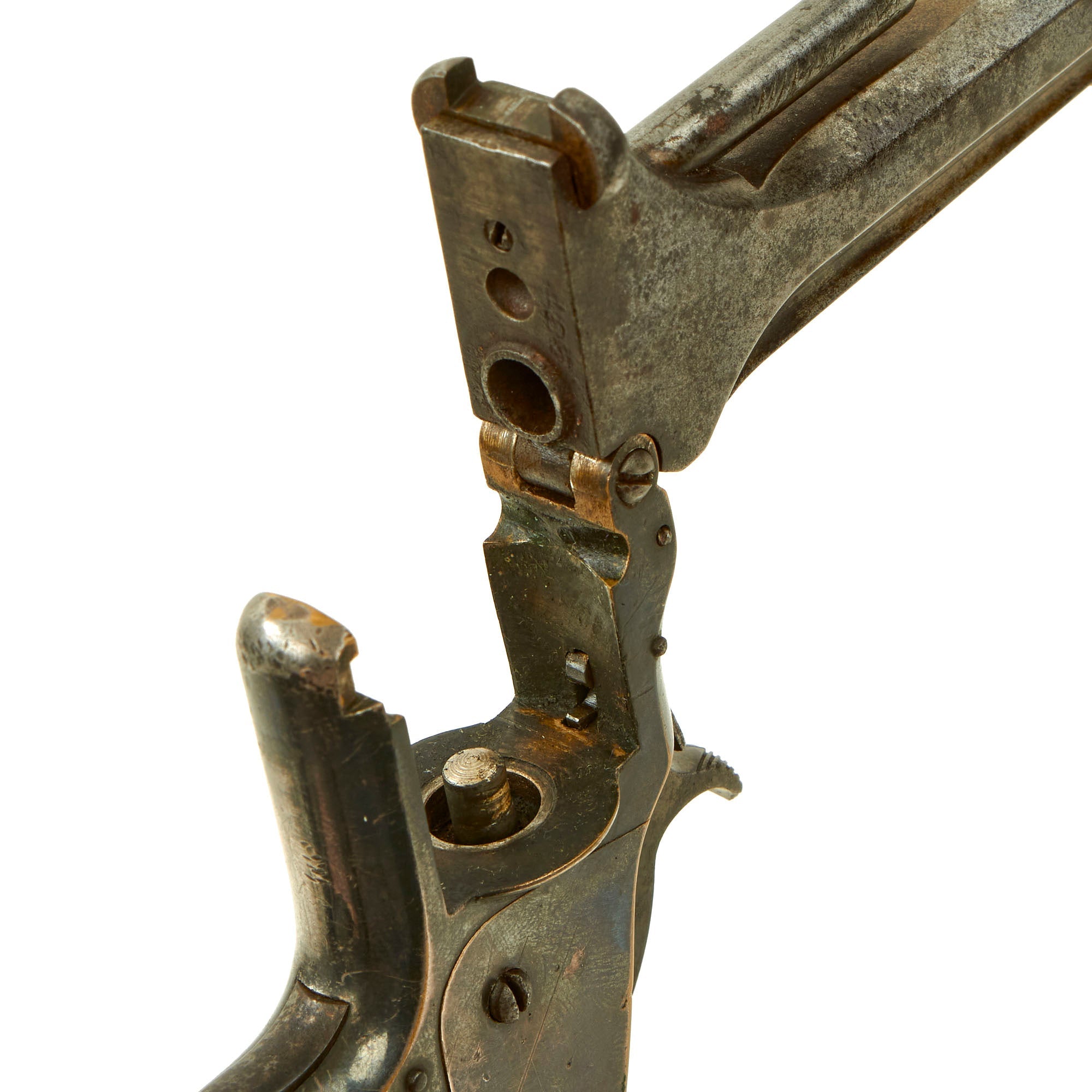 The 2nd Issue of the Model 1 looked similar to the 1st Issue, with several notable differences. The side plate on the 2nd Issue was much larger and irregularly shaped. The profile of the frame was flatter (a likely concession for manufacturing efficiency), and the hammer was now made in one piece. Model 1 2nd Issues still had the flared, square cornered shaped grip and the octagonal tip-up style frame, and at first glance the two issues are easy to confuse.