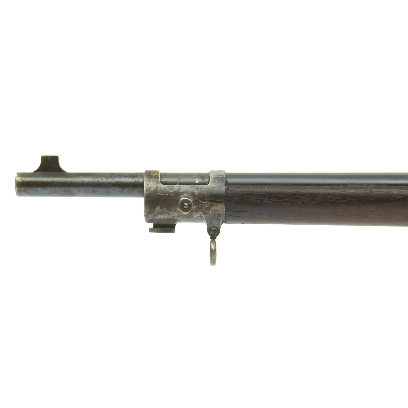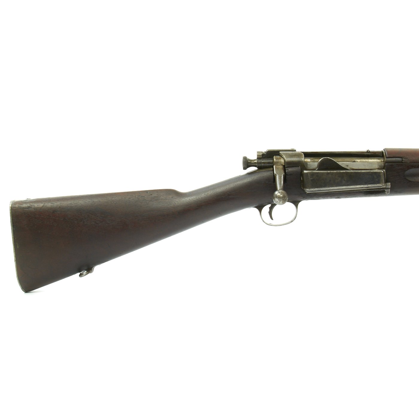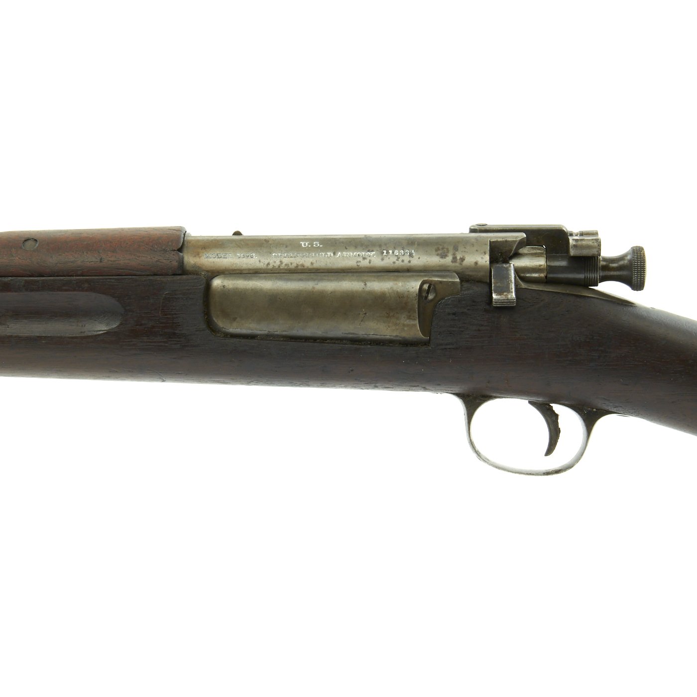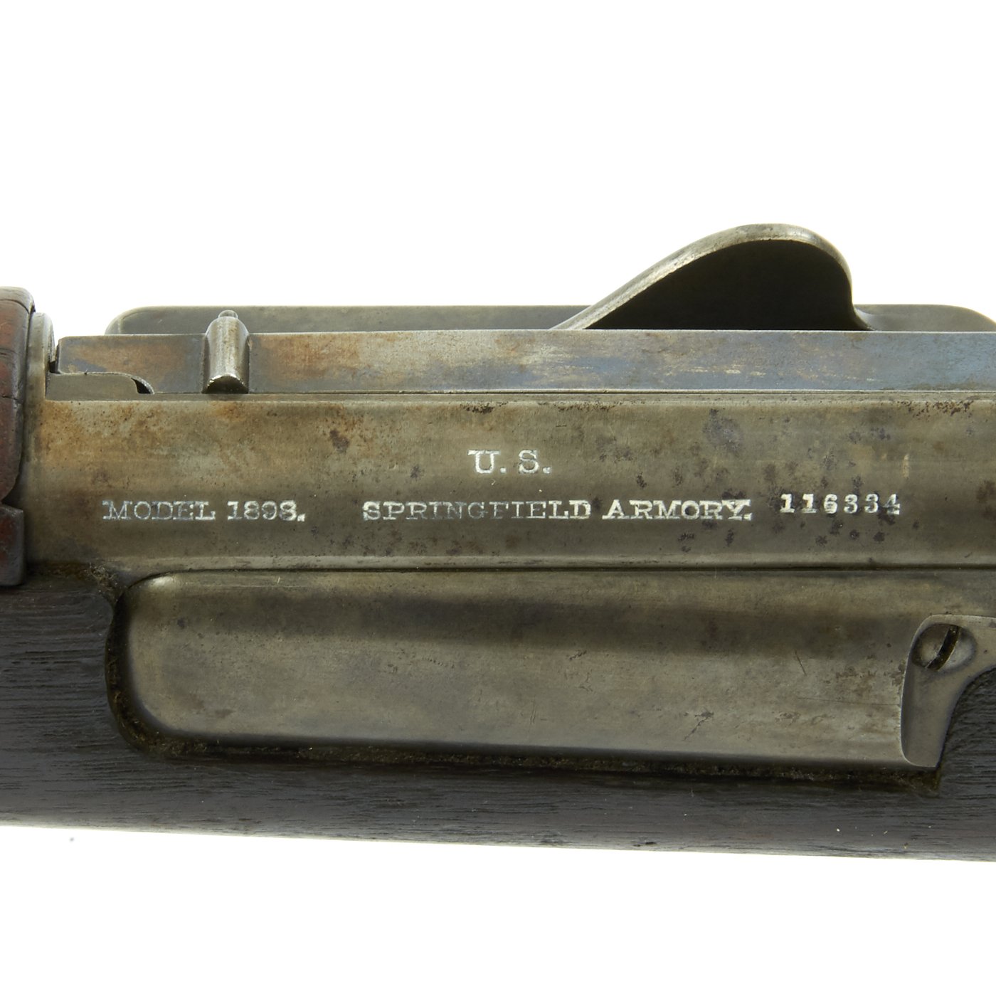 Research reveals that serial number 116334 dates the time of manufacture to about July of 1898, which is part of U.S. fiscal year 1899. The stock is fitted with a M1896 solid smooth buttplate with a curved toe and butt-trap. The handguard meets the front edge of the receiver fitted with what was probably a left over 1896 pattern rear sight. We see no evidence that the rear sight was replaced, so as this is a very early 1898, they used up the parts on hand. These are very desirable as a U.S. military service rifle as most of these rifles saw heavy use in the Spanish-American War and early 1900s until the development of the M1903 rifle.