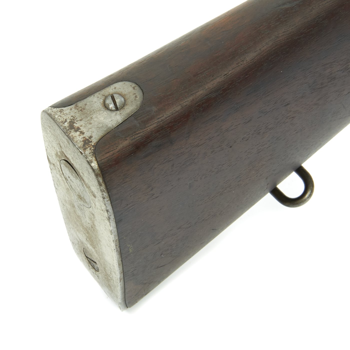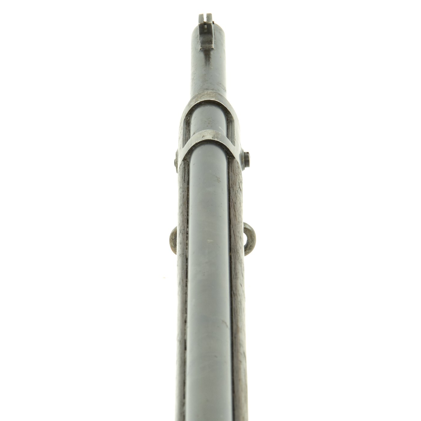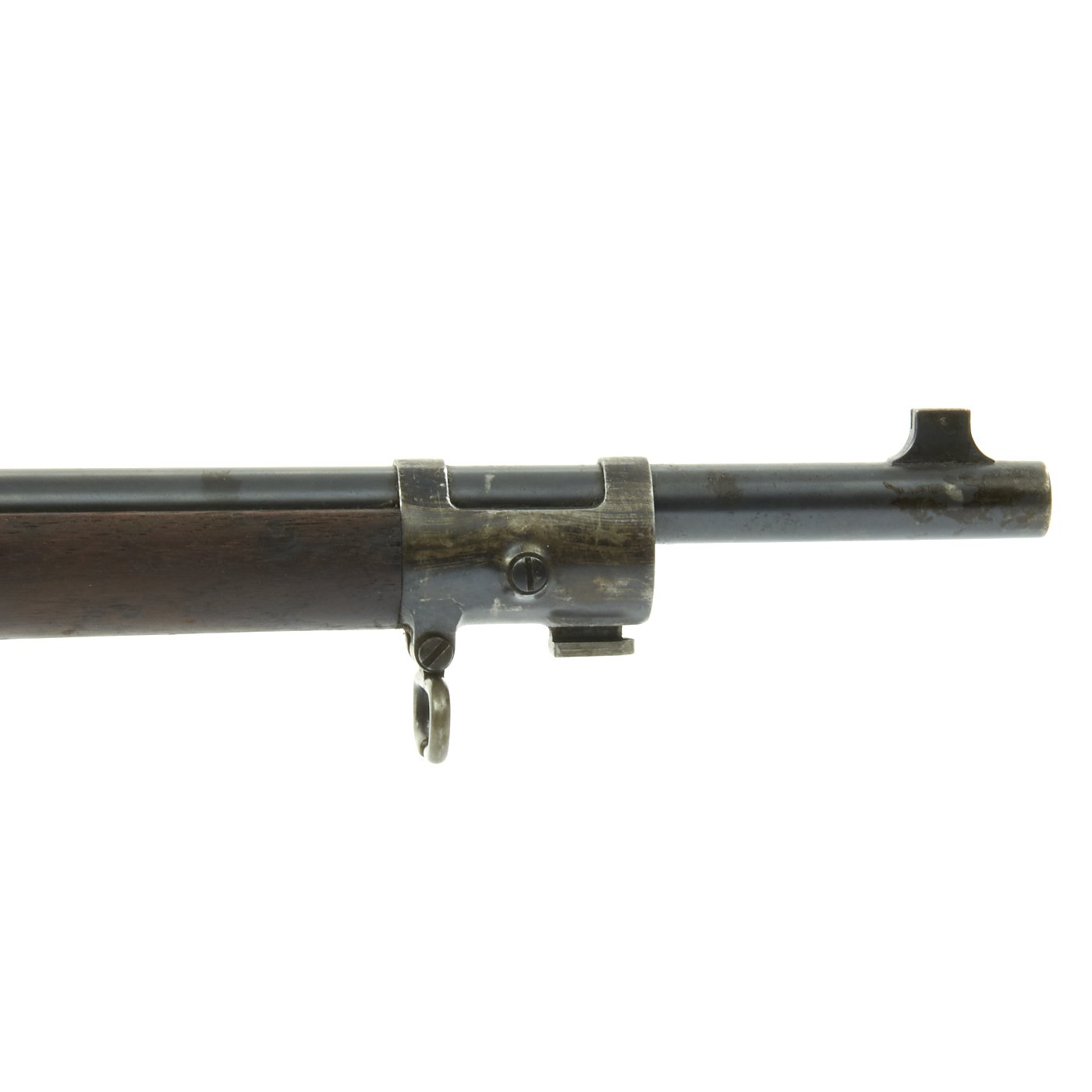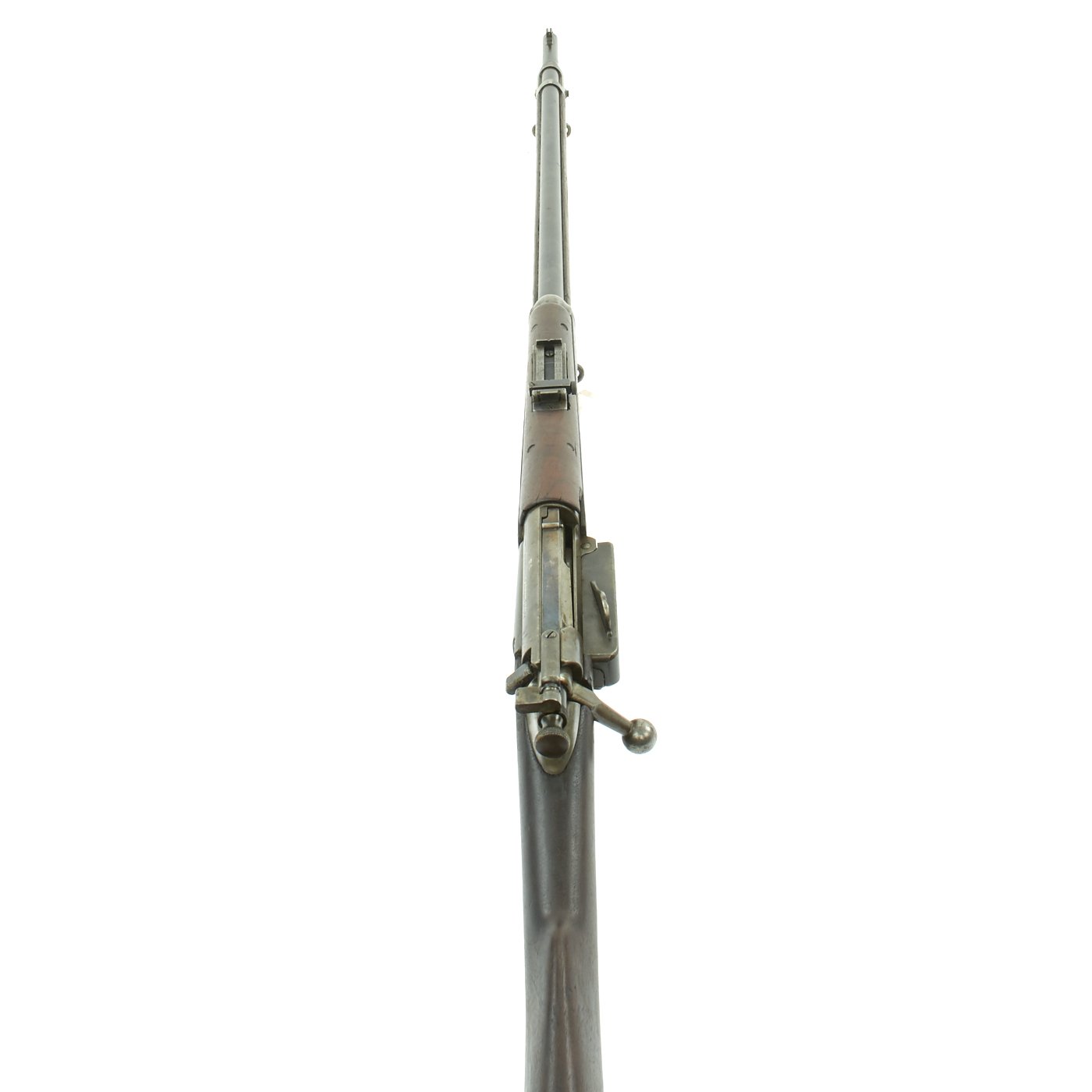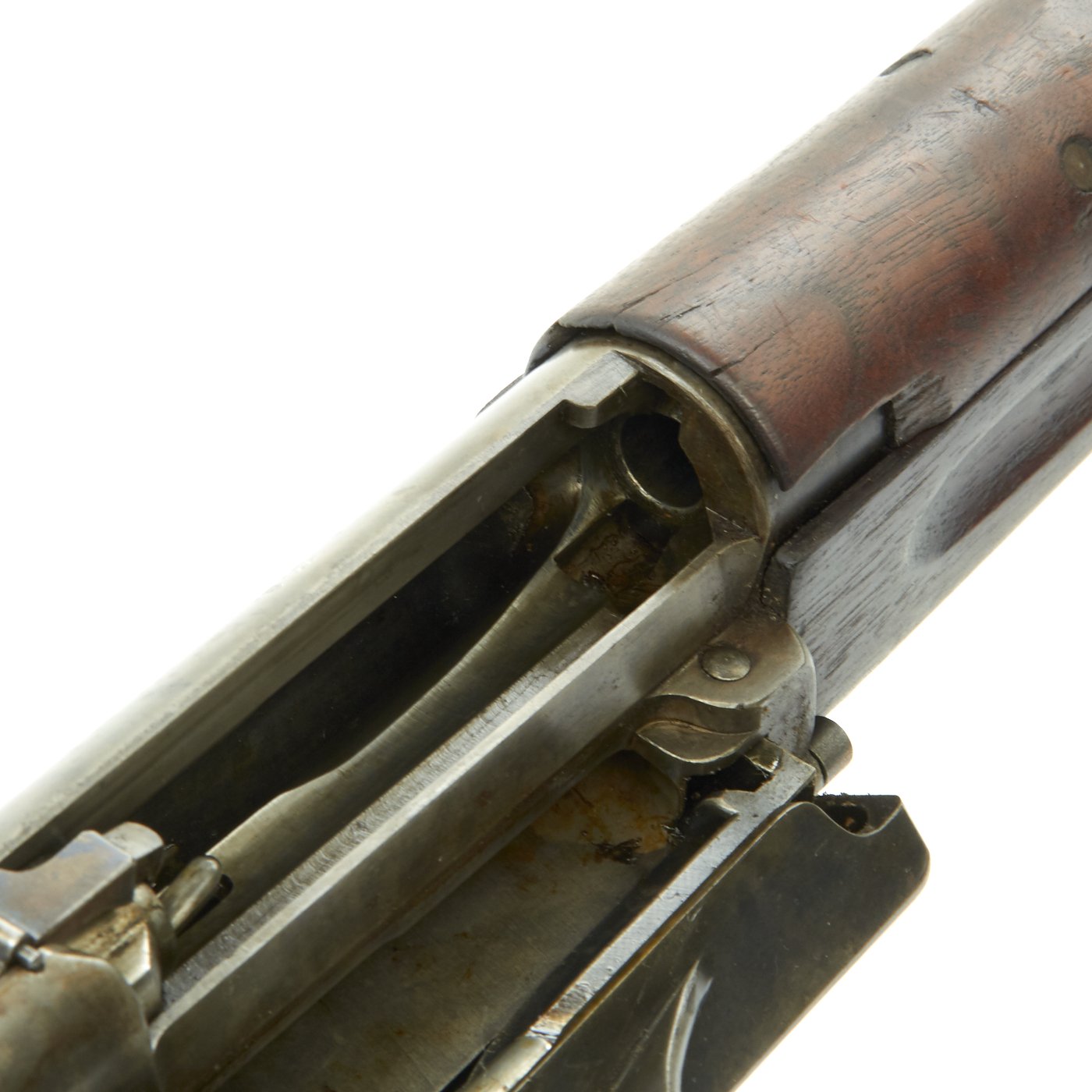Research reveals that serial number 116334 dates the time of manufacture to about July of 1898, which is part of U.S. fiscal year 1899. The stock is fitted with a M1896 solid smooth buttplate with a curved toe and butt-trap. The handguard meets the front edge of the receiver fitted with what was probably a left over 1896 pattern rear sight. We see no evidence that the rear sight was replaced, so as this is a very early 1898, they used up the parts on hand. These are very desirable as a U.S. military service rifle as most of these rifles saw heavy use in the Spanish-American War and early 1900s until the development of the M1903 rifle.