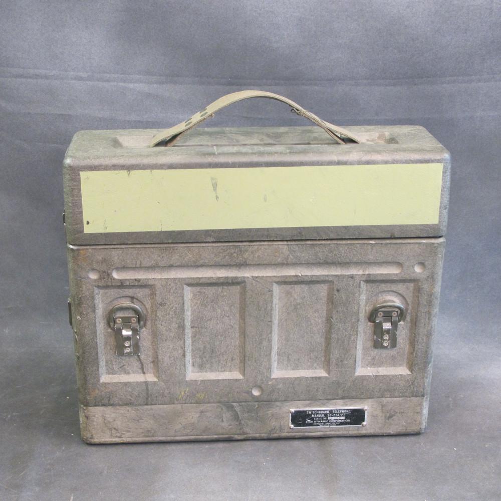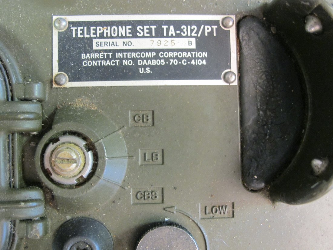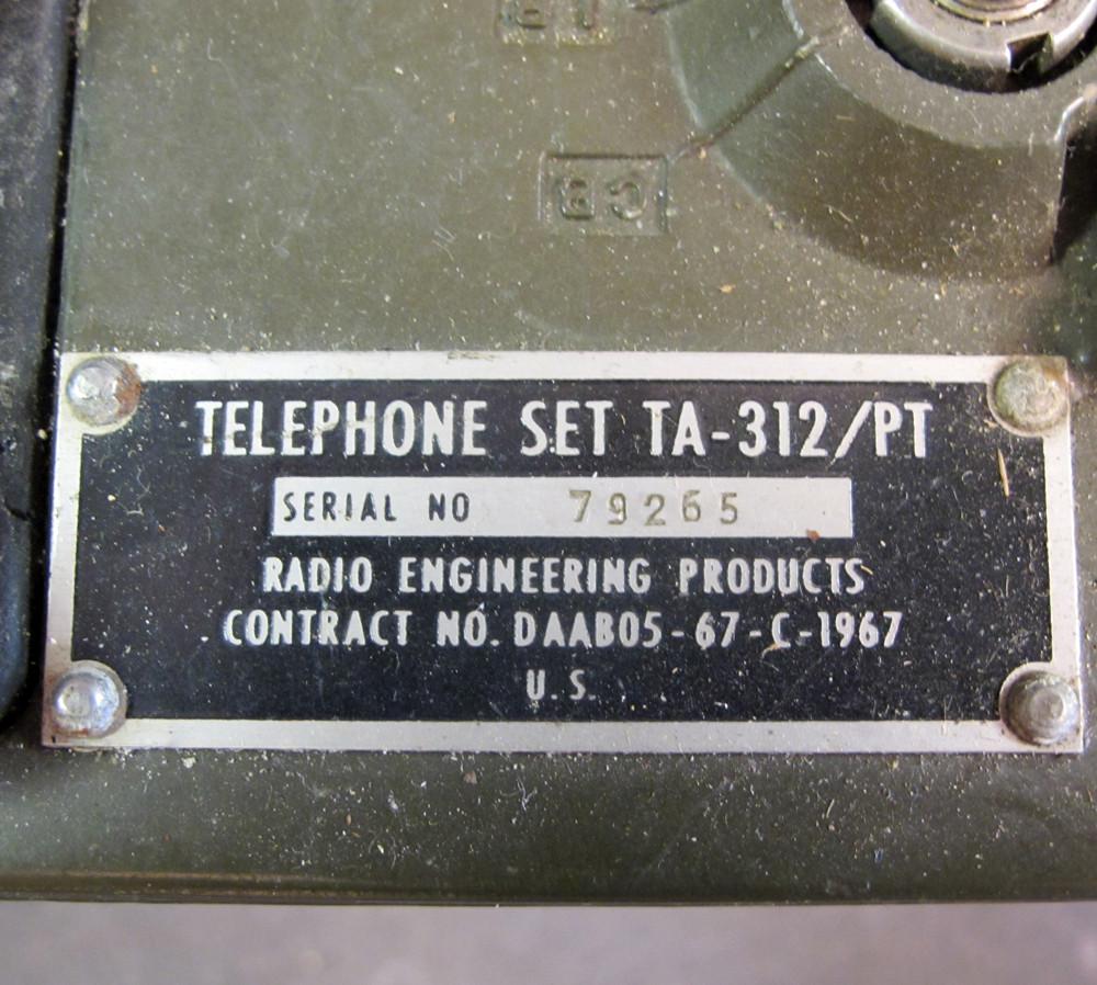 The TA-312 is supplied with a canvas case that closes with a brass zipper and has a shoulder strap for carrying or hanging the phone. The TA-955 dual tone multifrequency (DTMF) adapter allows push button operational interface with automatic analog switches. The TA-955 Touch Tone pad can be connected to the TA-312 with an integrated coupler and attachment point. The TA-312 also utilizes the G-42 crank generator and BZ3 clacker call signaler. It requires two BA-30 D-cell batteries.