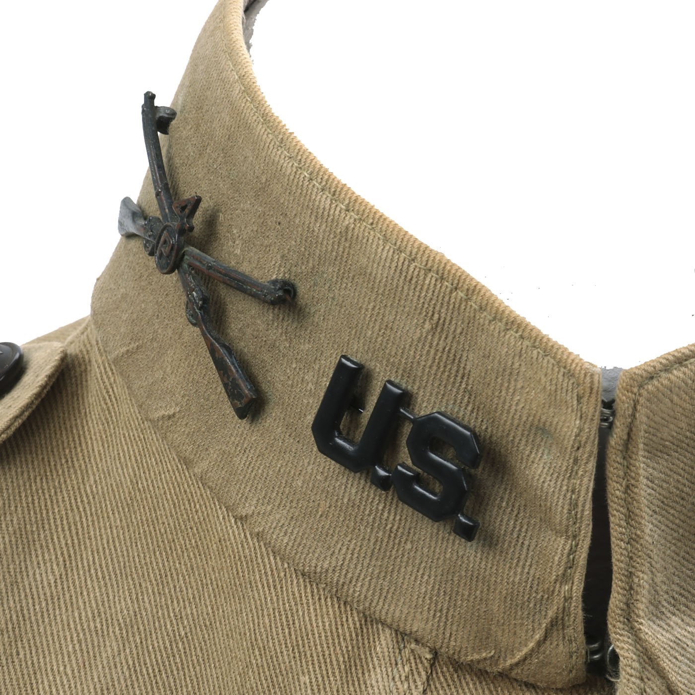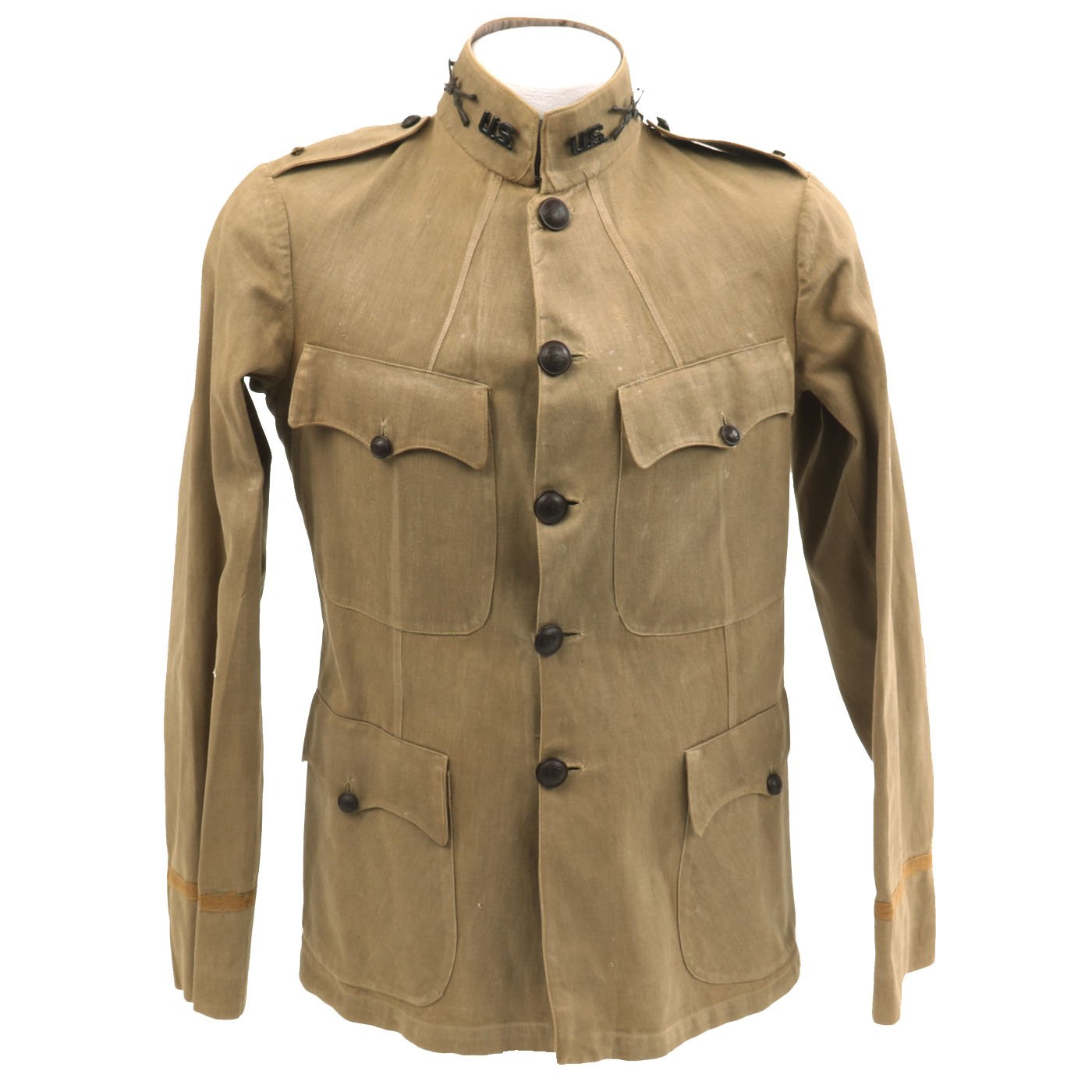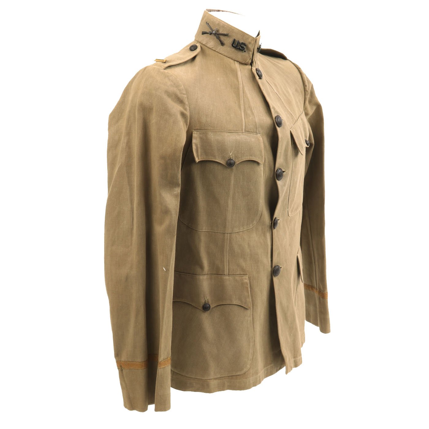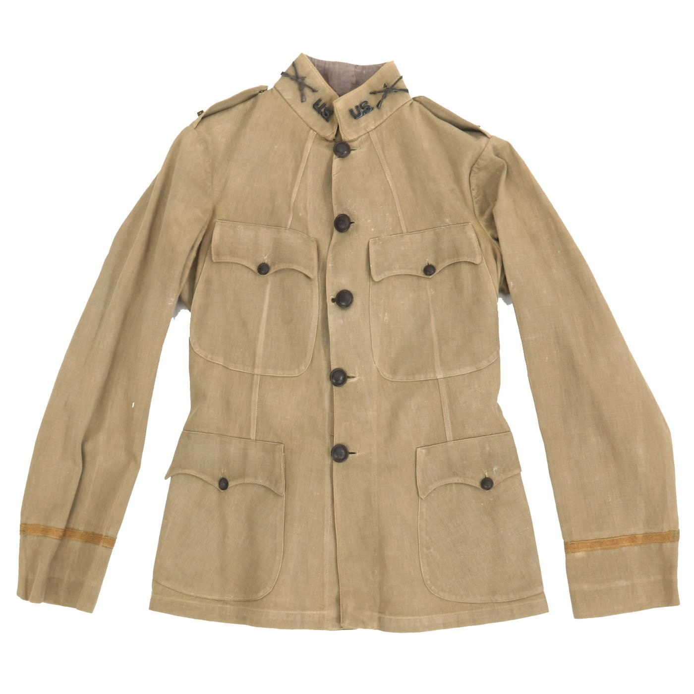 Original Item: Only One Available. This is an excellent condition cotton summer khaki patter 1912 field blouse for an officer in the Infantry. It features rimmed buttons, stand up collar, and P"4 P" infantry insignia with pin backs.