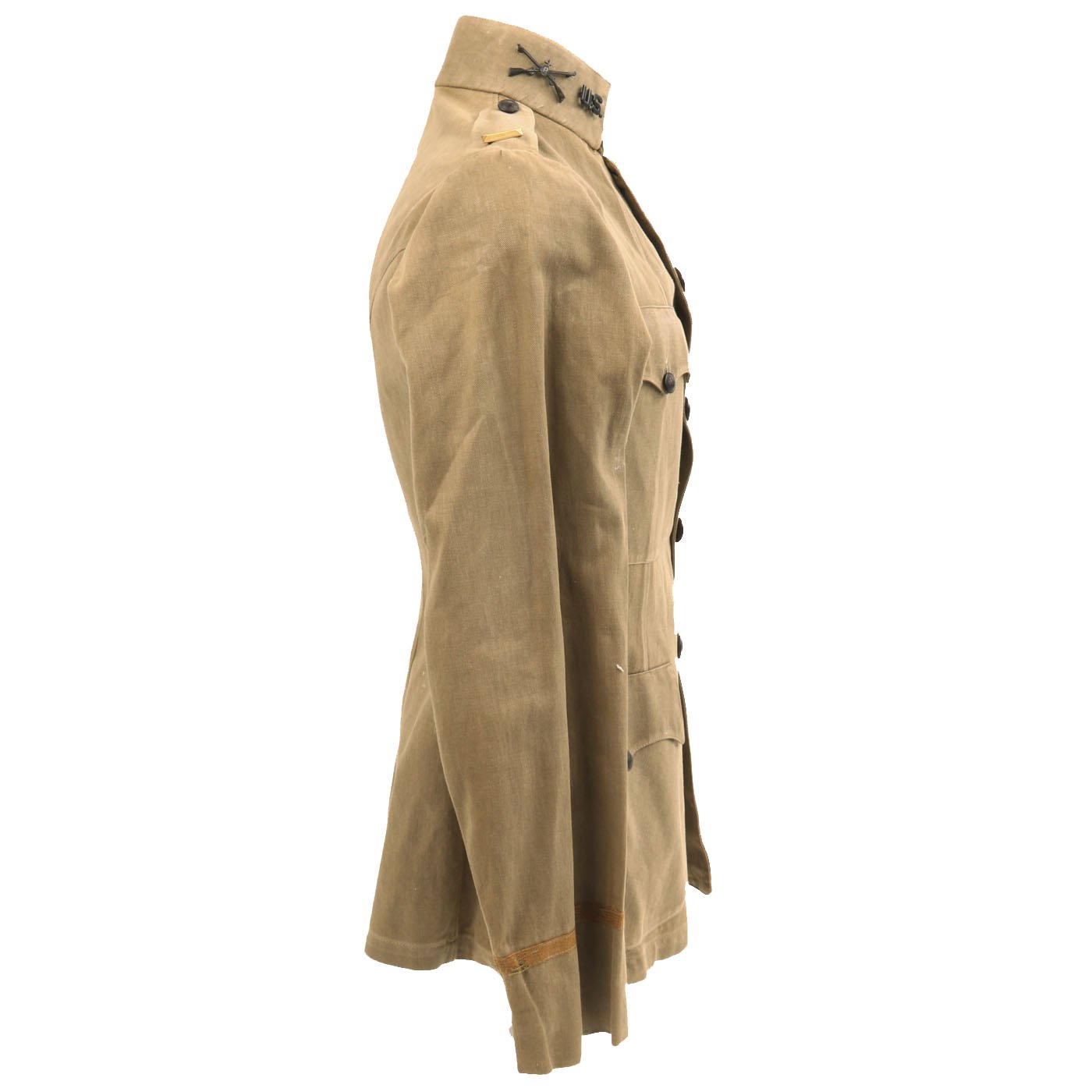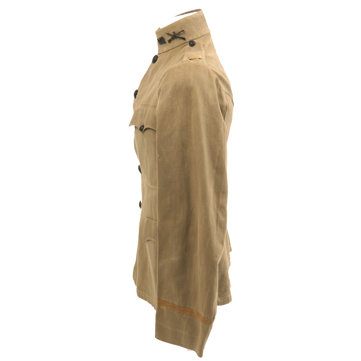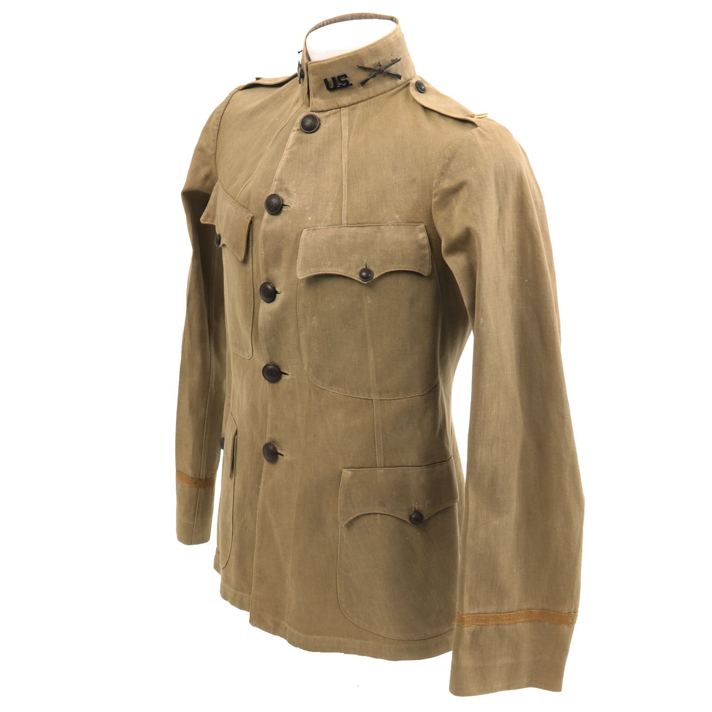 Original Item: Only One Available. This is an excellent condition cotton summer khaki patter 1912 field blouse for an officer in the Infantry. It features rimmed buttons, stand up collar, and P"4 P" infantry insignia with pin backs.