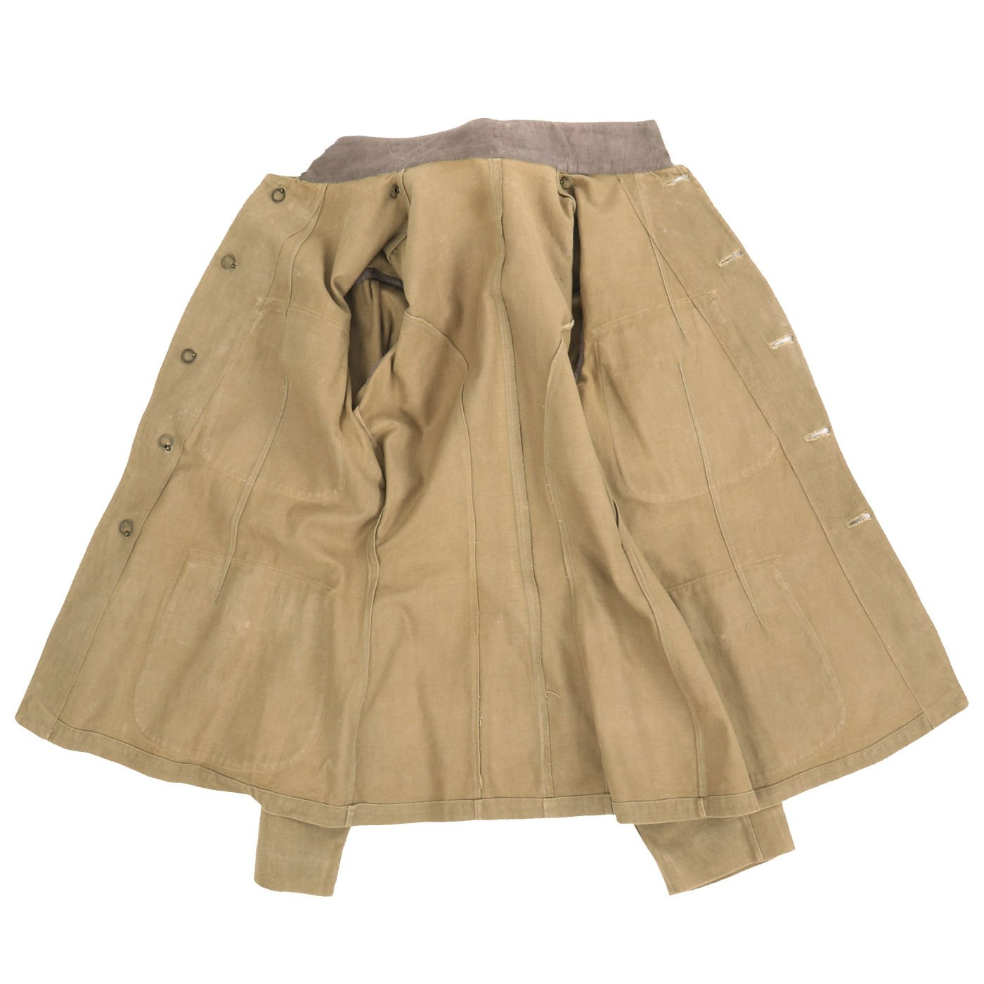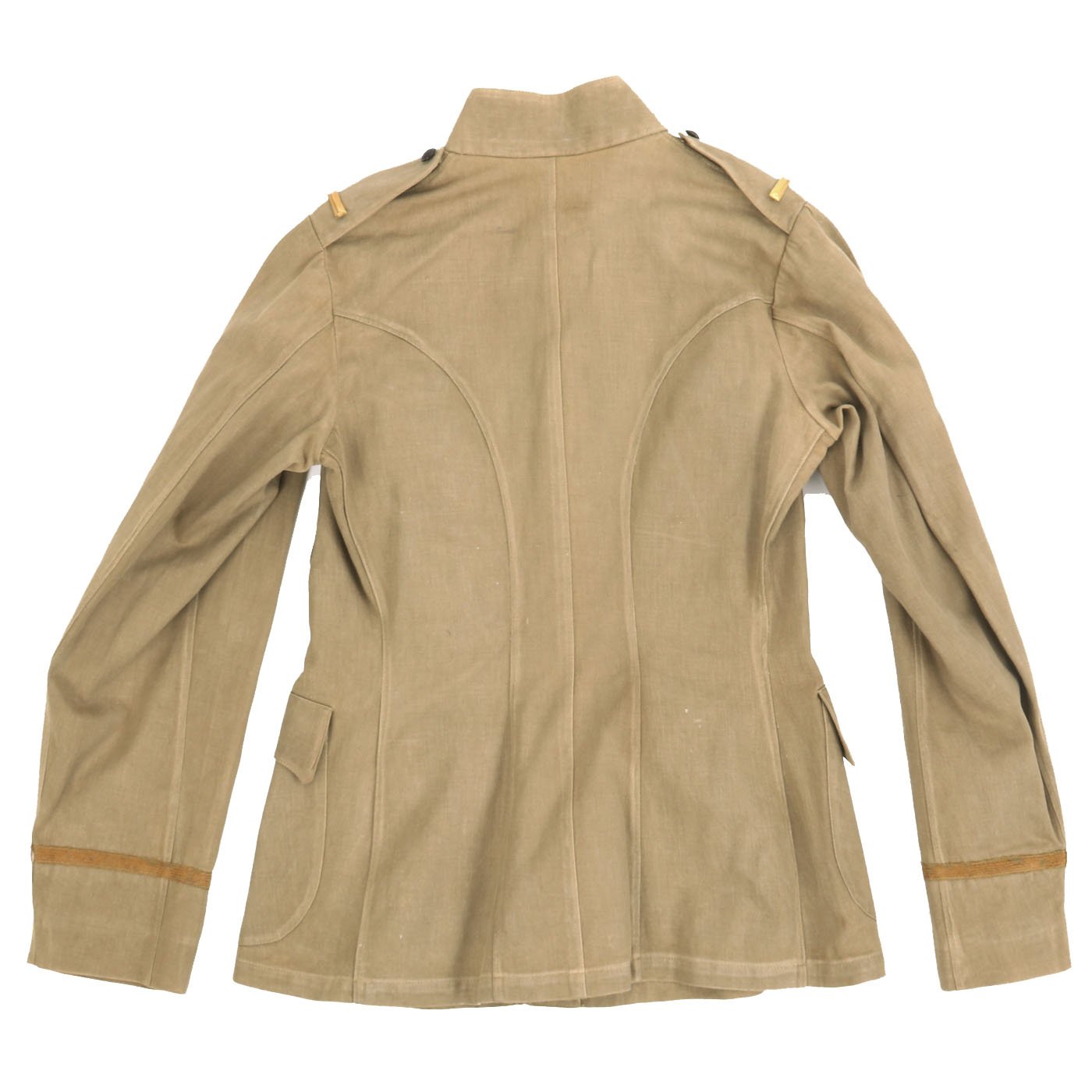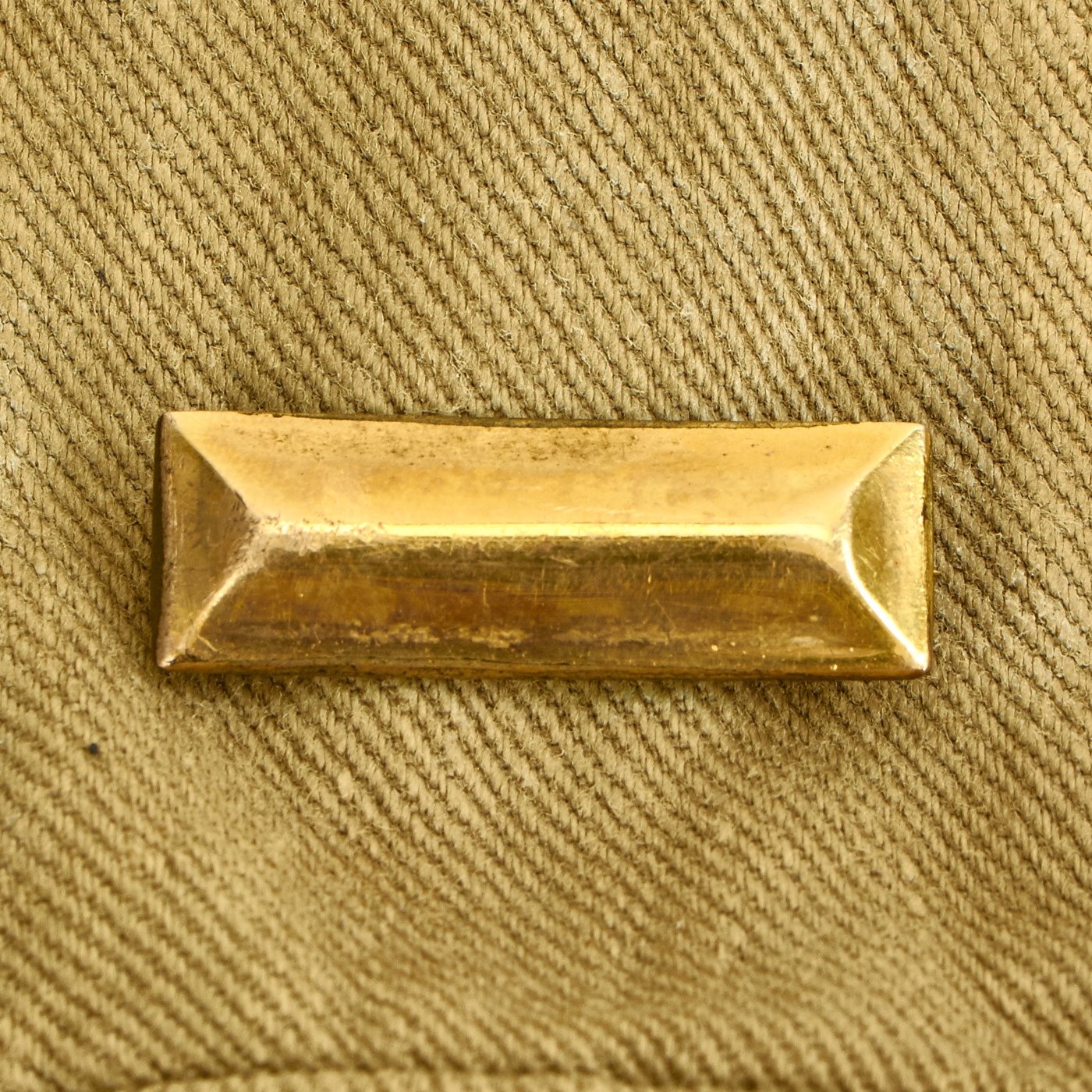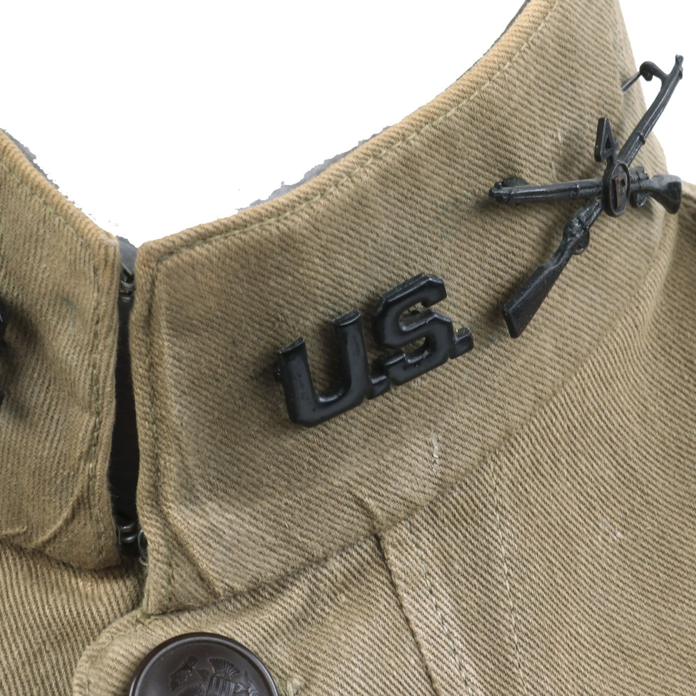 Original Item: Only One Available. This is an excellent condition cotton summer khaki patter 1912 field blouse for an officer in the Infantry. It features rimmed buttons, stand up collar, and P"4 P" infantry insignia with pin backs.