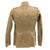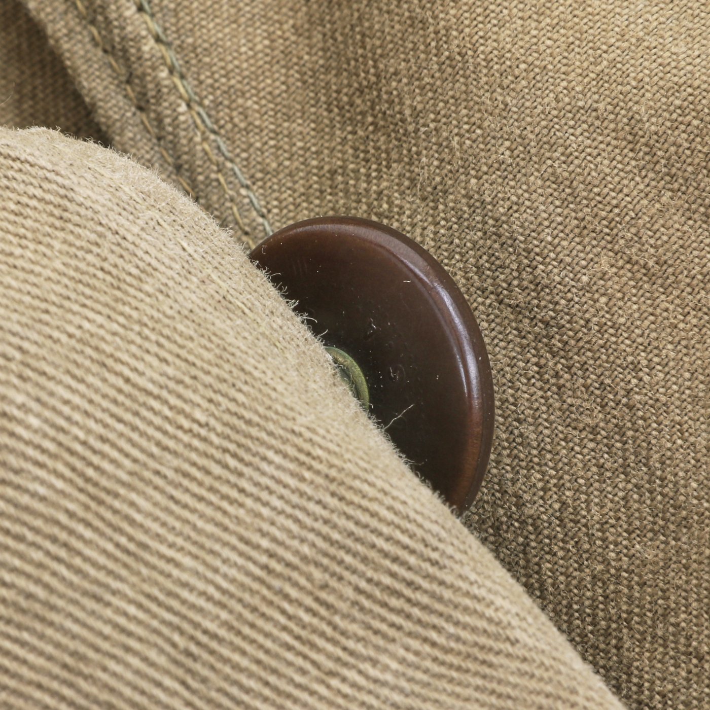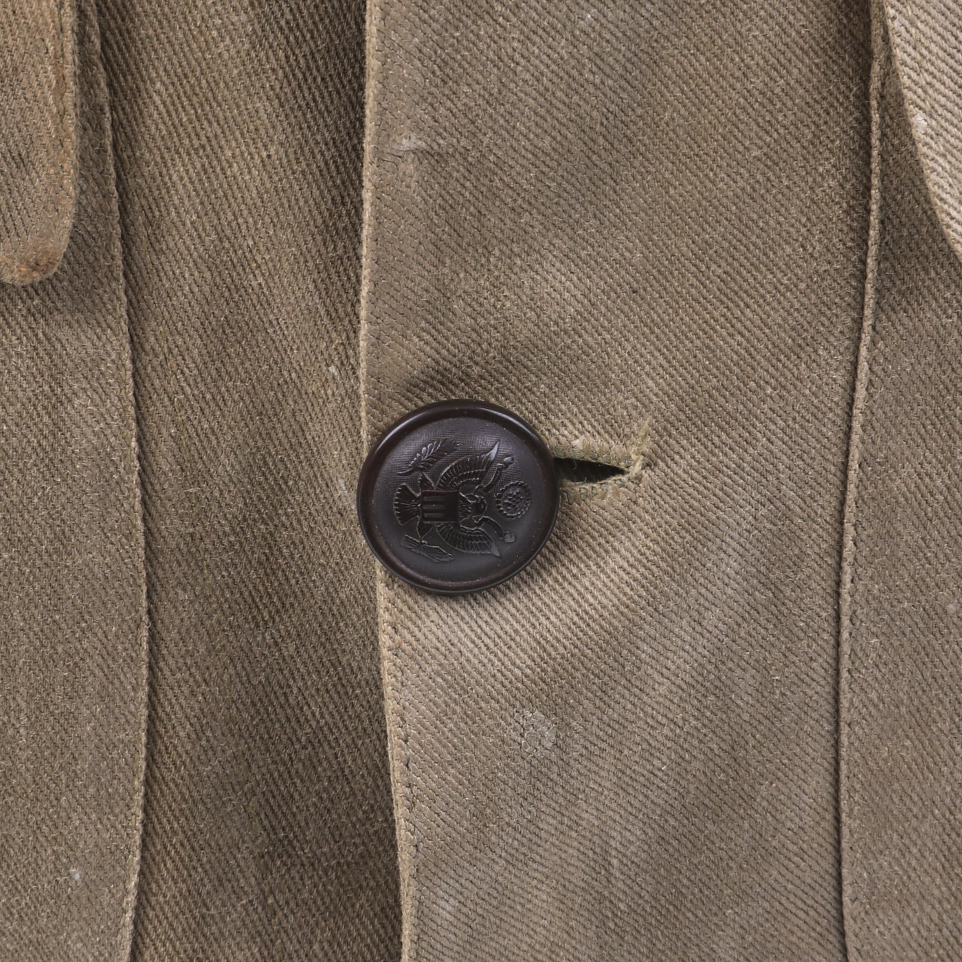 The new service blouse for enlisted men had a rollover collar and pointed cuffs. The regulations described it as, “A single-breasted sack coat of olive drab woolen material or khaki-colored cotton material, made with two outside breast choked-bellows pockets and two outside pockets of the same pattern below the waist; pockets to be without plaits and covered by flaps, rounded at edges, buttoned by a small regulation button.” The last portion of this description alludes to another important change in the Army’s appearance: The regulation button.