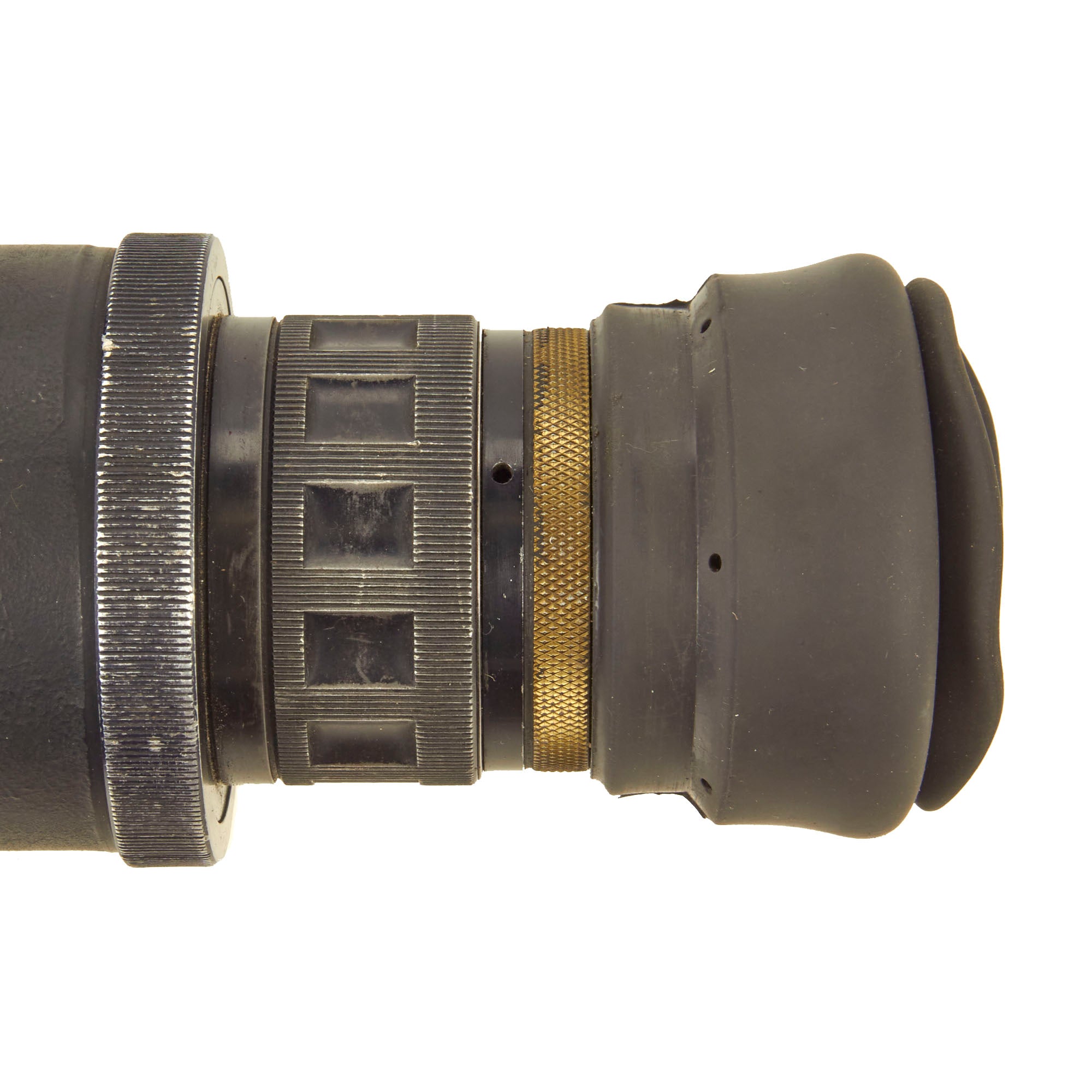 The AN/PVS-2 was intended as a rifle scope, and has a standard mount on the bottom for attaching to rails, such as used on the M-16 rifle. A switch on the upper left activates the scope, which can be used during the day with the attached daylight filter. The rubber eyeshield has an internal "flapper" closure that prevents light from escaping the back of the scope, helpful during clandestine operations. There is a focus control near the eyepiece, and there are instructions on the left side of the scope.