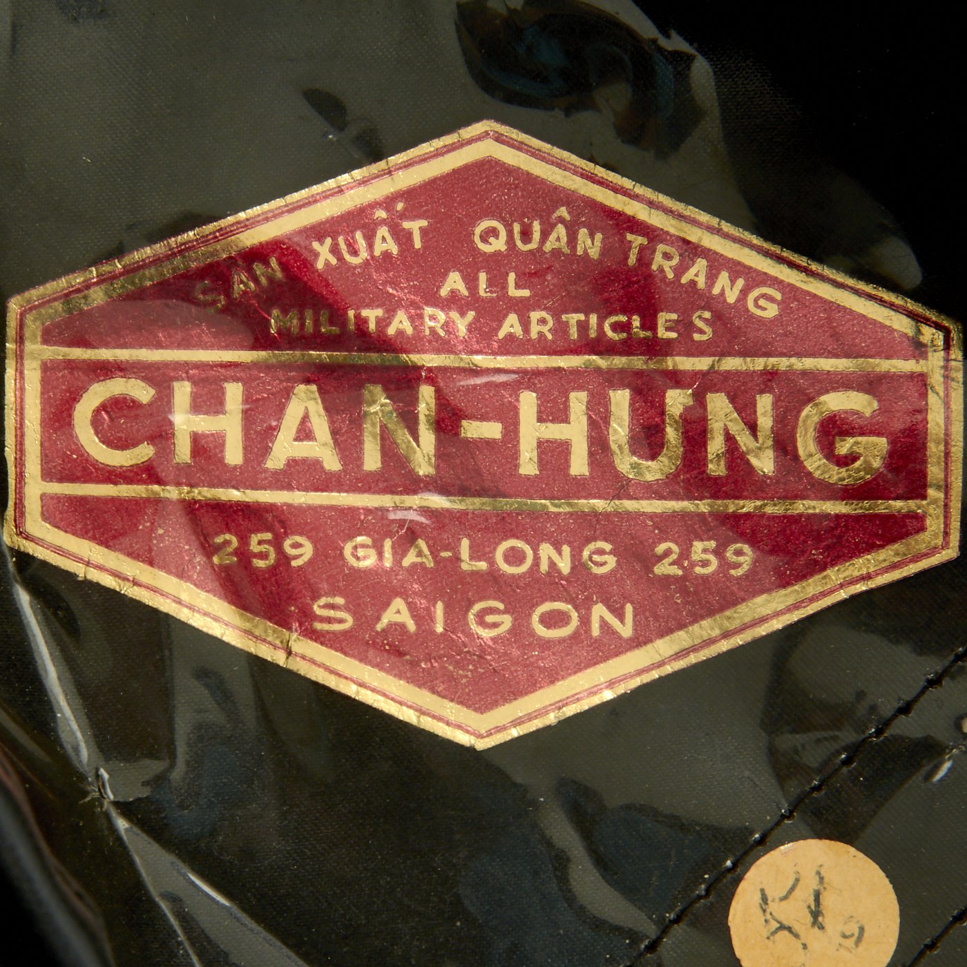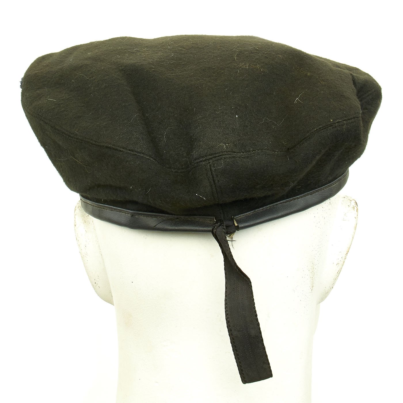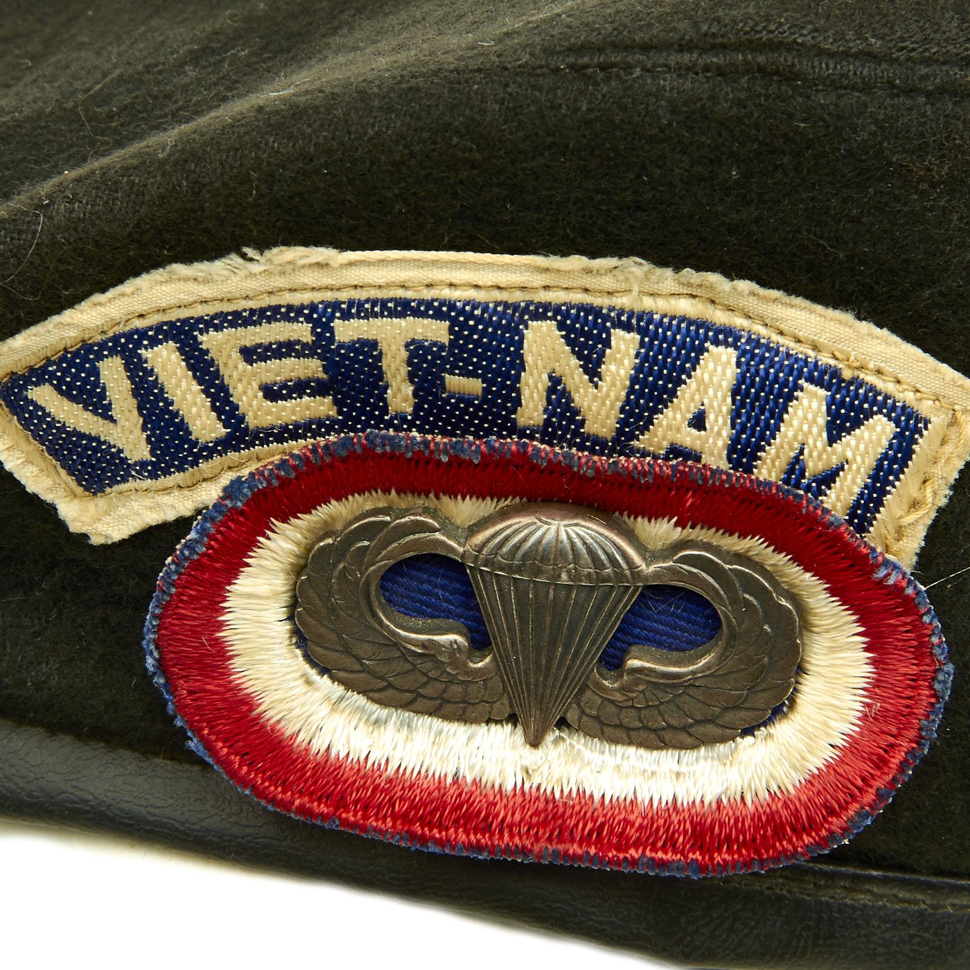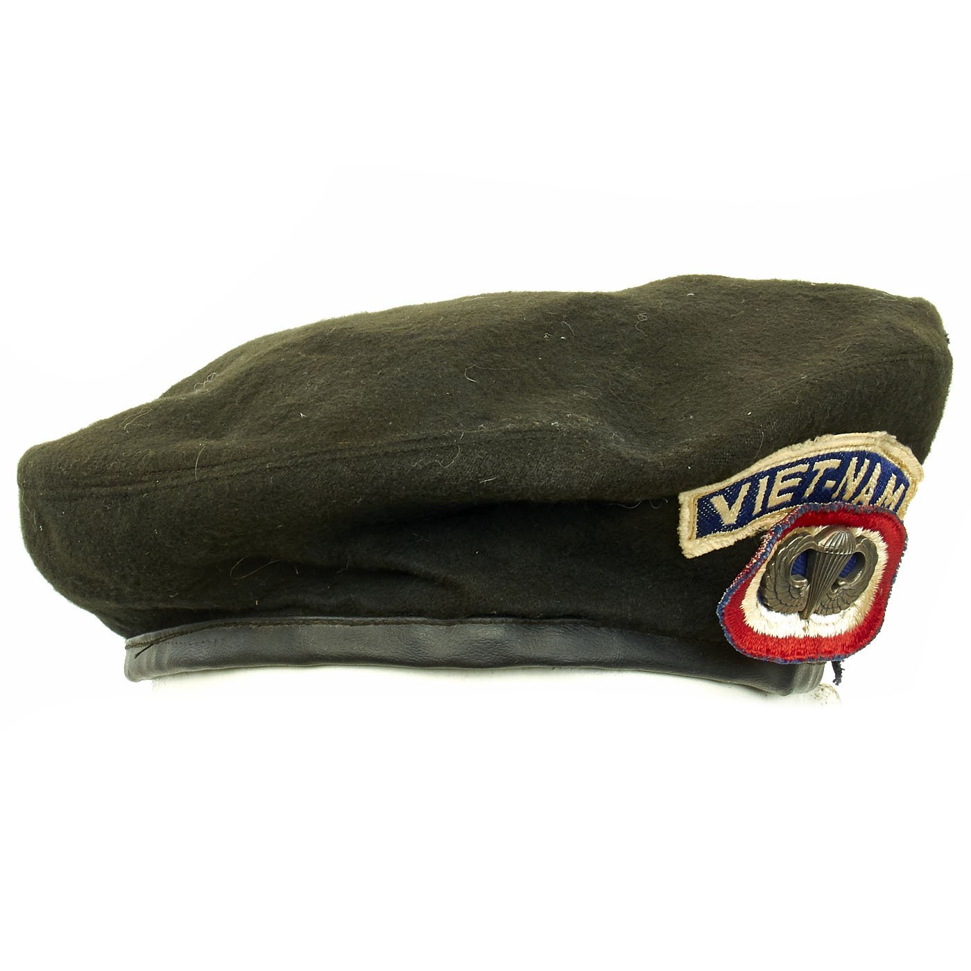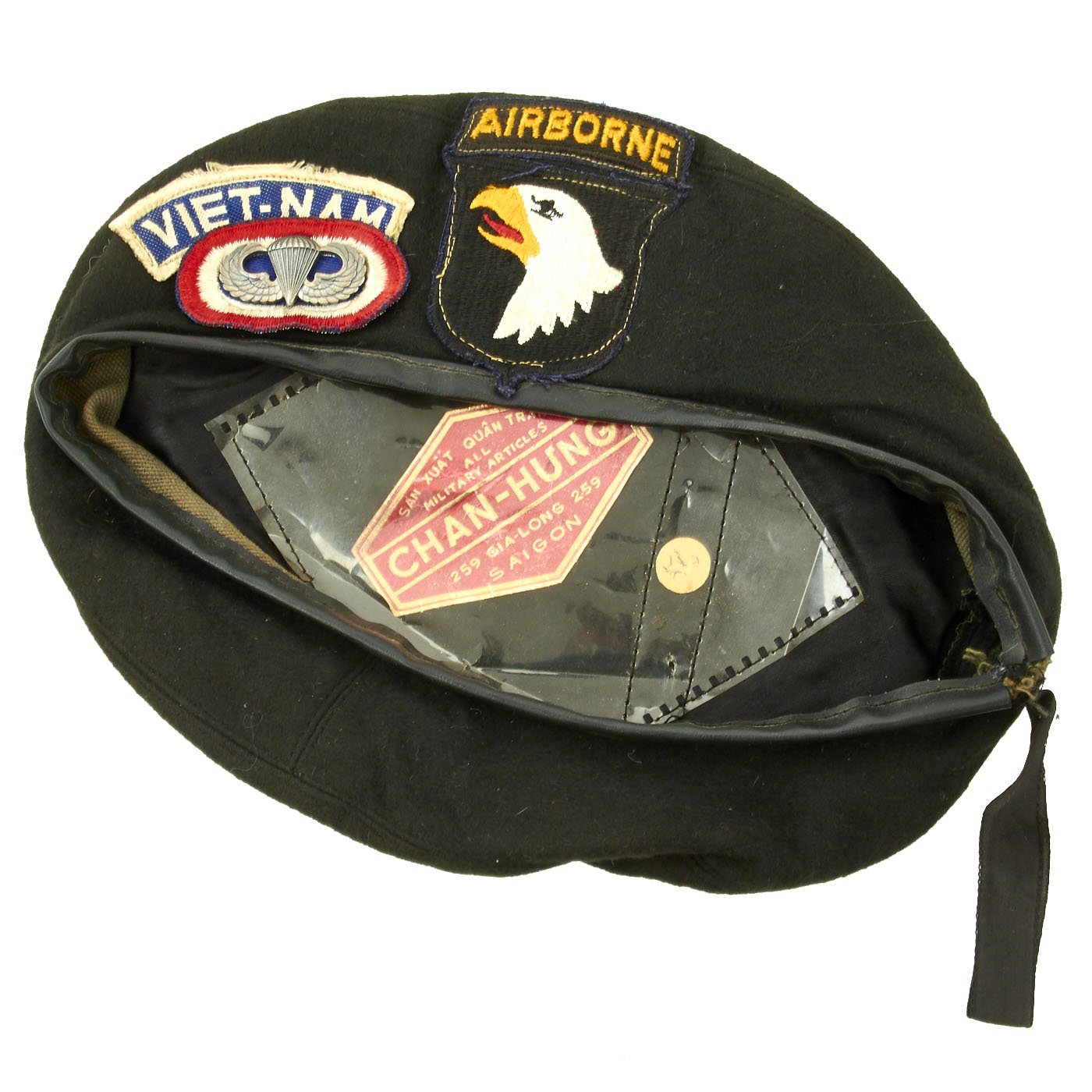 Original Item: Only One Available. This is an original Vietnam War era Vietnamese produced black wool Souvenir beret with leather band, rayon and plastic interior. The inside bear an original Vietnamese foil label under the plastic sweat shield which reads CHAN-HUNG SAIGON. The beret is approximately a US size 7 (56cm) and features a hand stitched 101st Airborne Division patch or flash, Viet-Nam rocker patch, clasp back sterling silver parachute wings and red/white/blue embroidered 82nd Airborne Division jump oval. The beret and all patches are Vietnam War era and offered in very good condition. These berets and other hats, such as boonies were very popular among American servicemen during their time in Vietnam and would be assembled as souvenir's of their time at war.