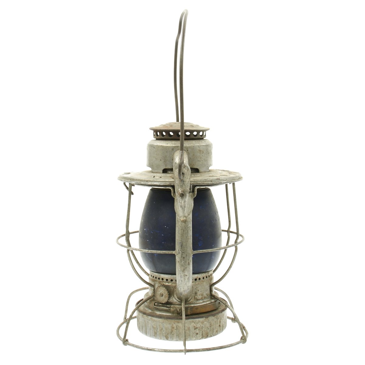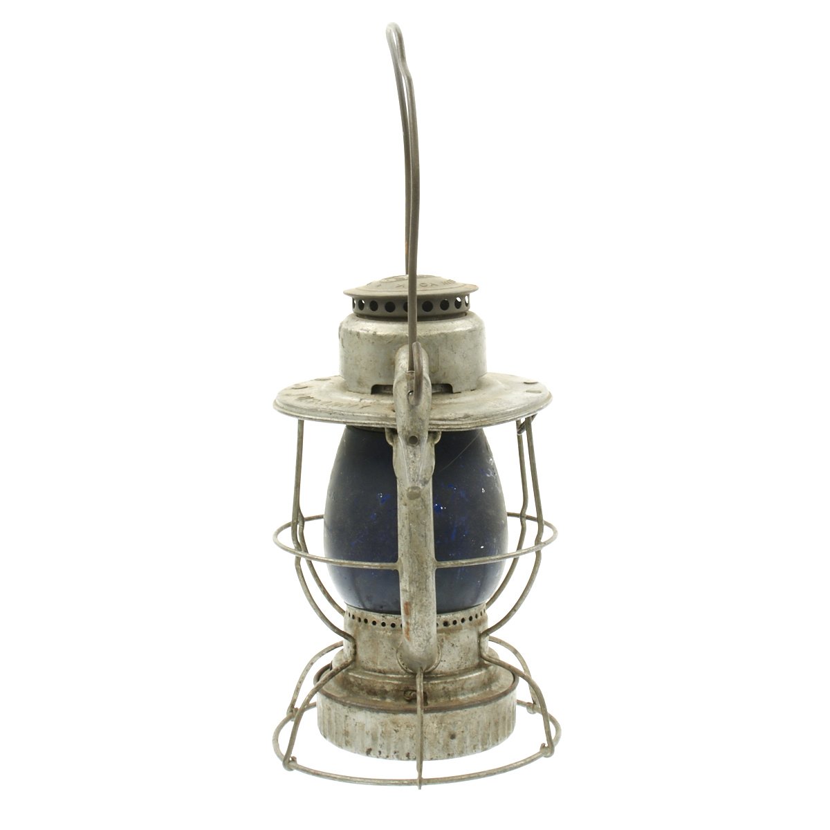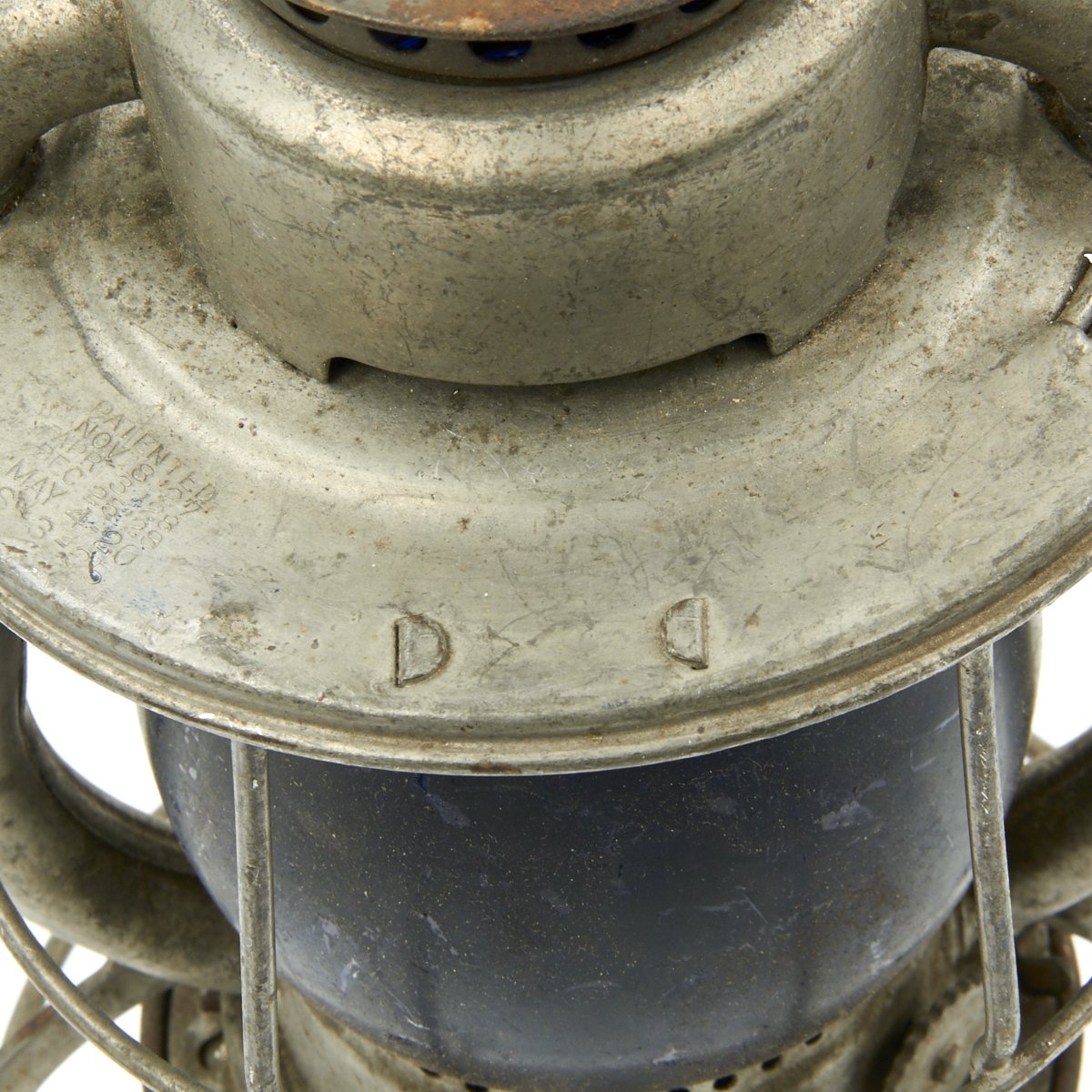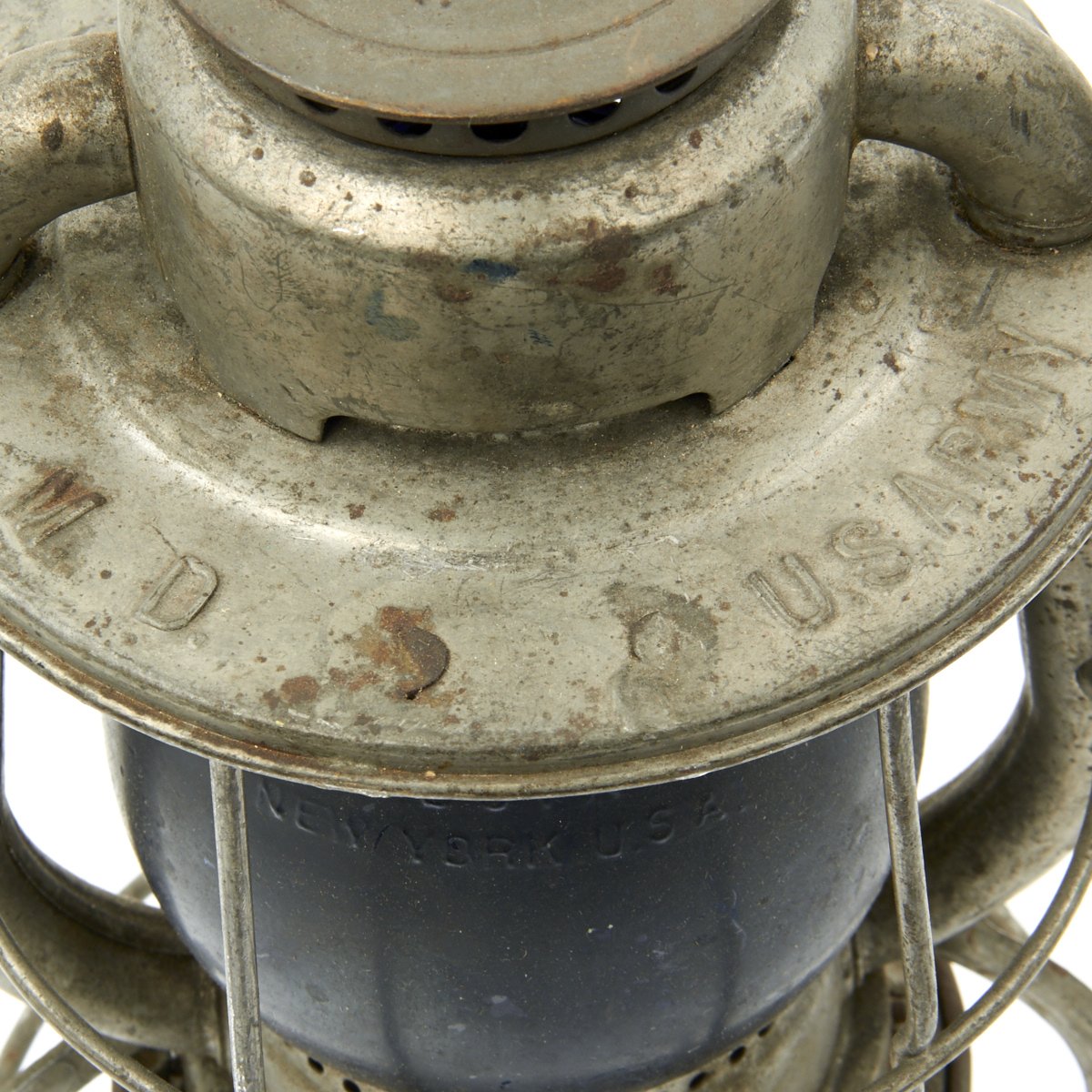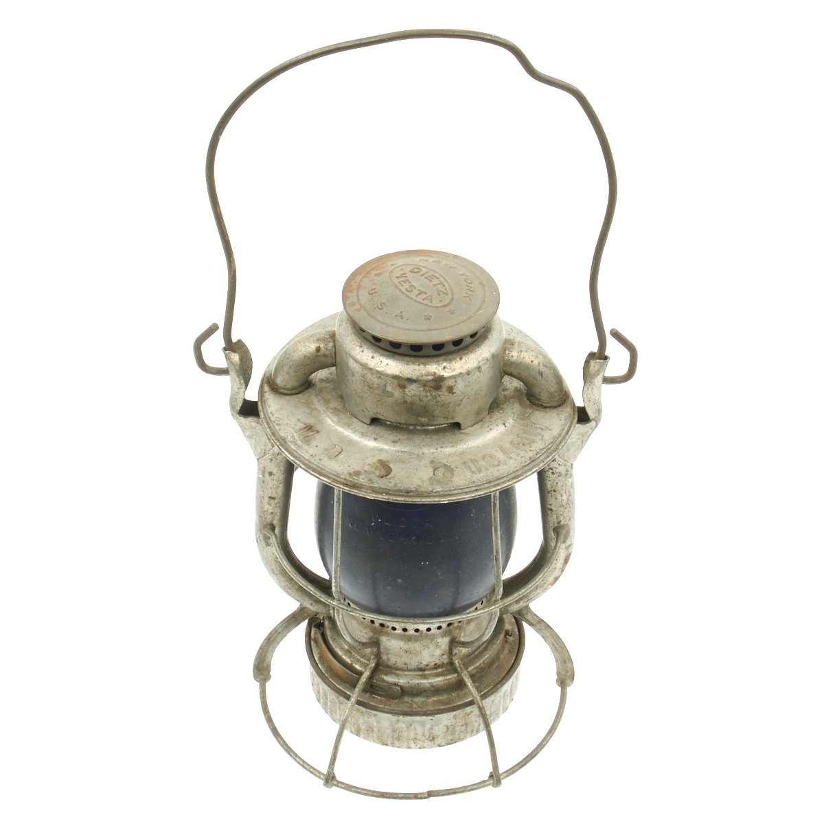 - Original Item: Only One Available. Made by the R.E. Dietz Company in the U.S, this is one of the VESTA "low-top" model lamps. Standing about 10" tall, the top is embossed DIETZ VESTA, NEW YORK, U.S.A. and M.D. U.S. ARMY. It features original blue stained glass. Offered in very good display condition.