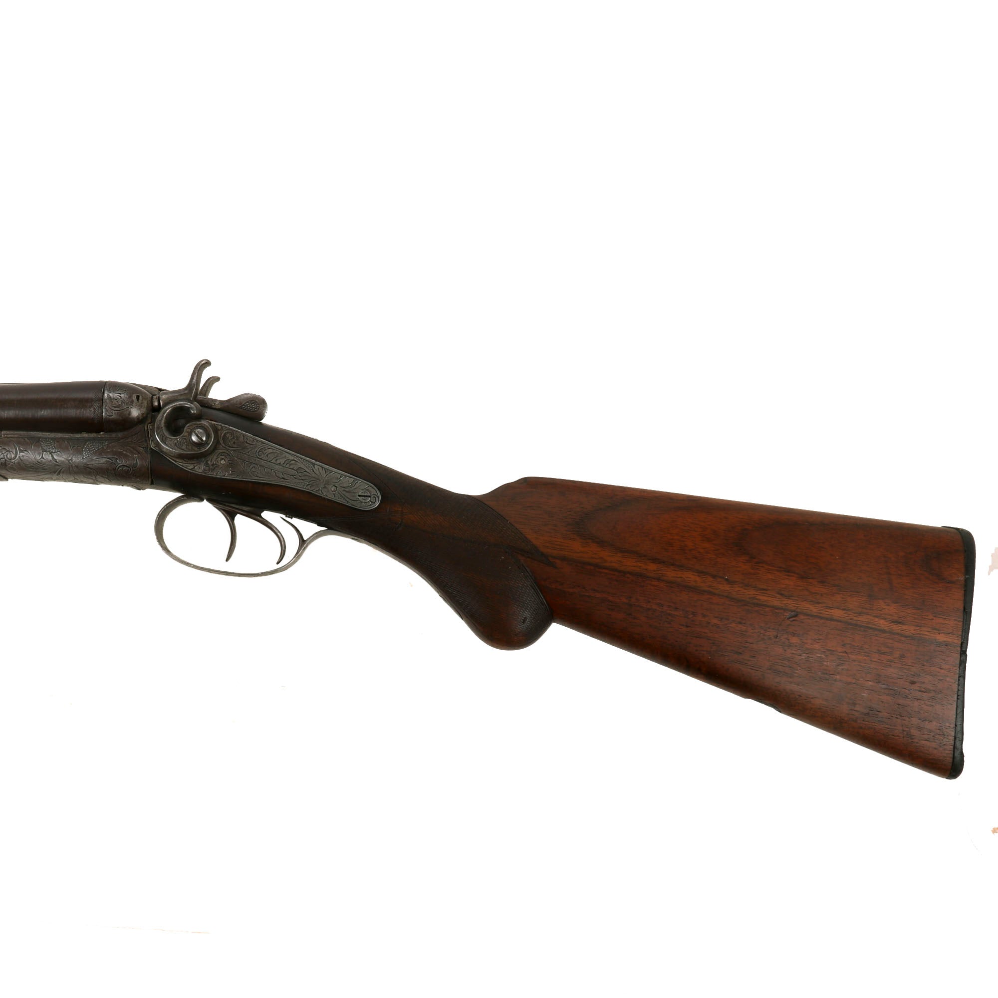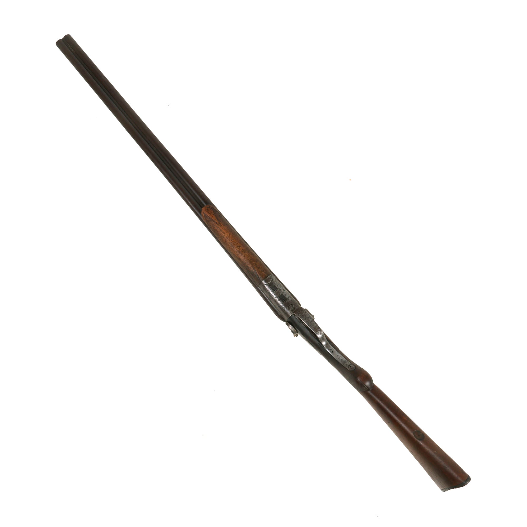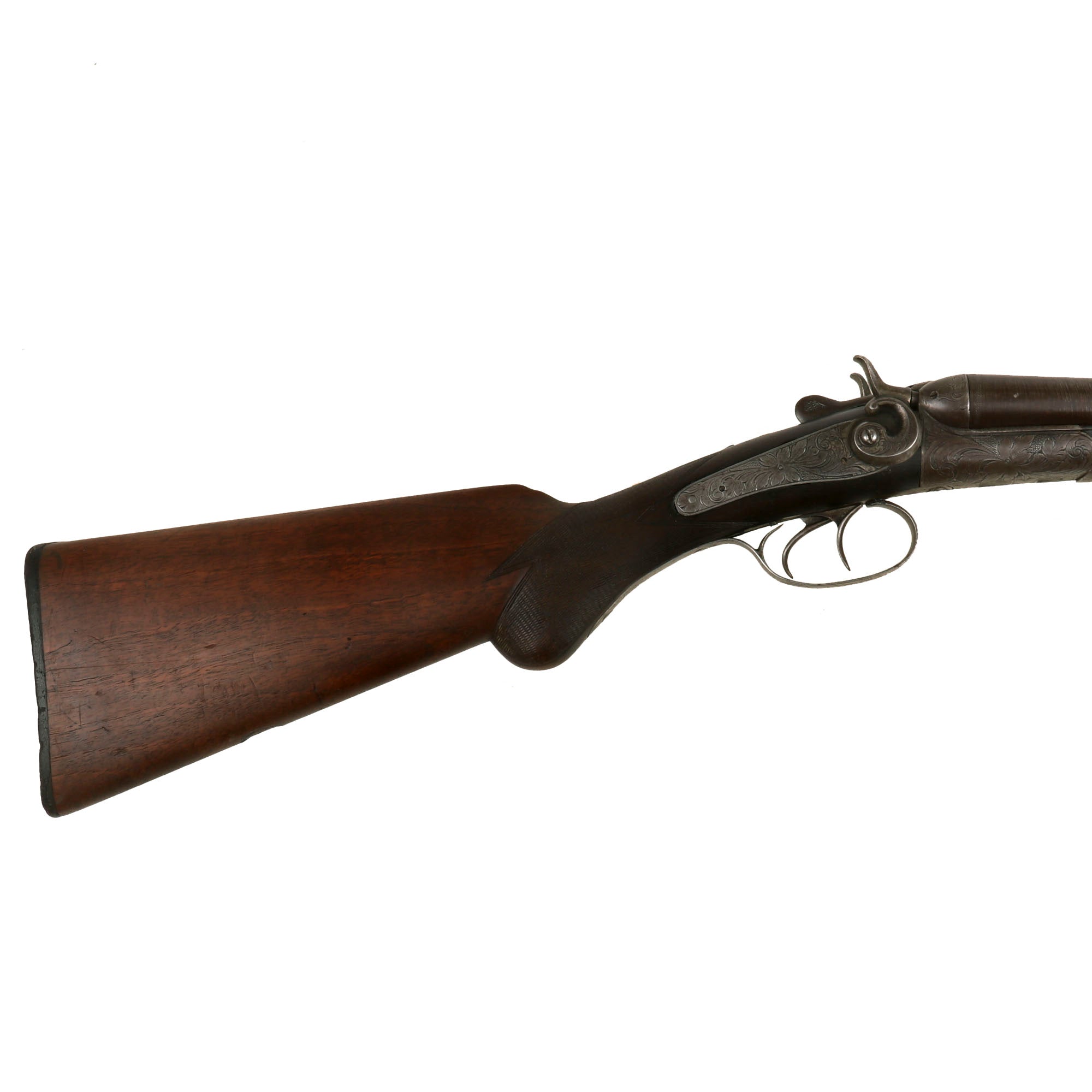We believe that this somewhat upmarket example was most likely made around 1890, when the import market was booming. It features a lovely "pistol grip" rear stock and fore stock, both of which have some lovely checkering in the grip area. It also has some lovely floral engraving on all of the metal fittings, which is still very well retained. It is still marked on the matte rib between the barrels with: