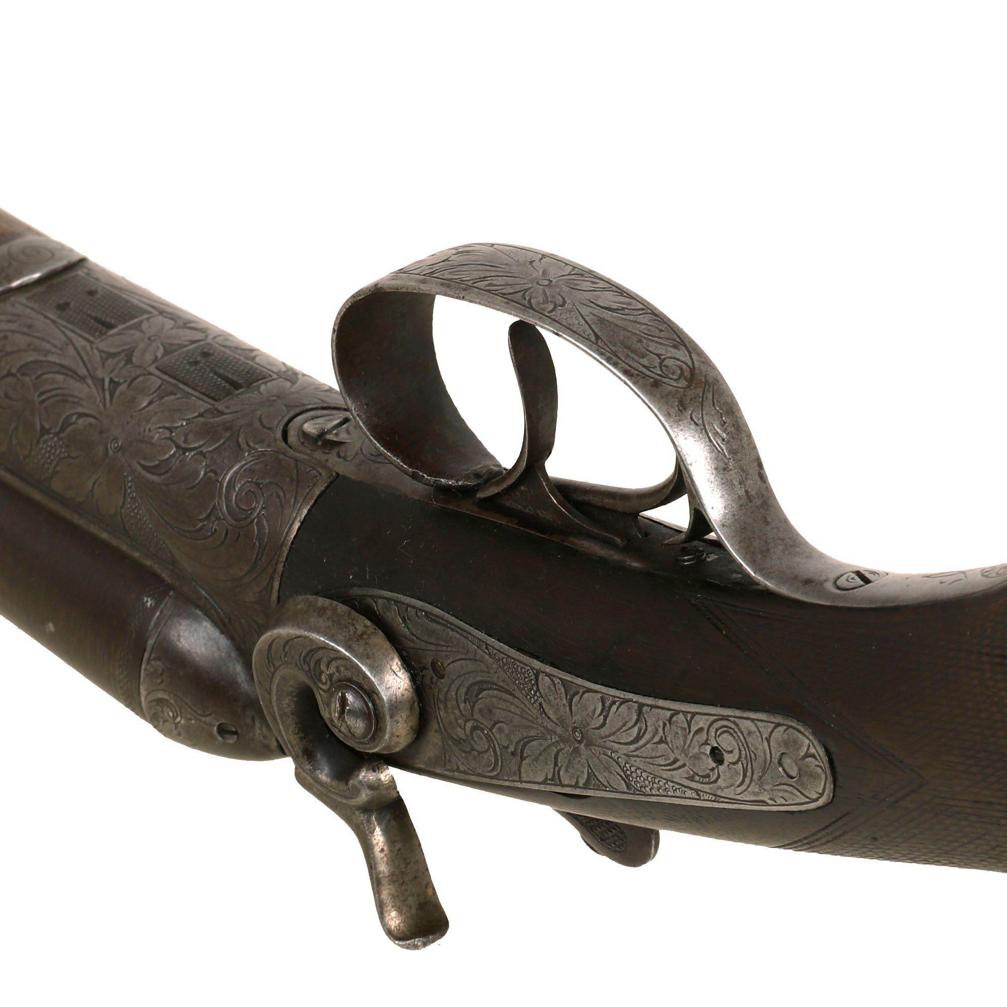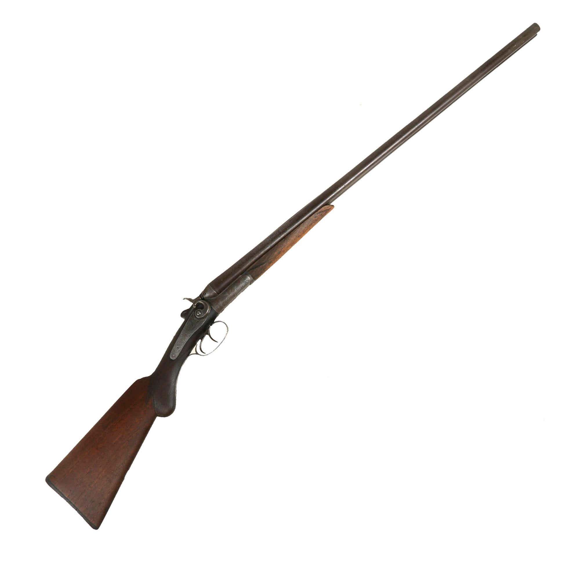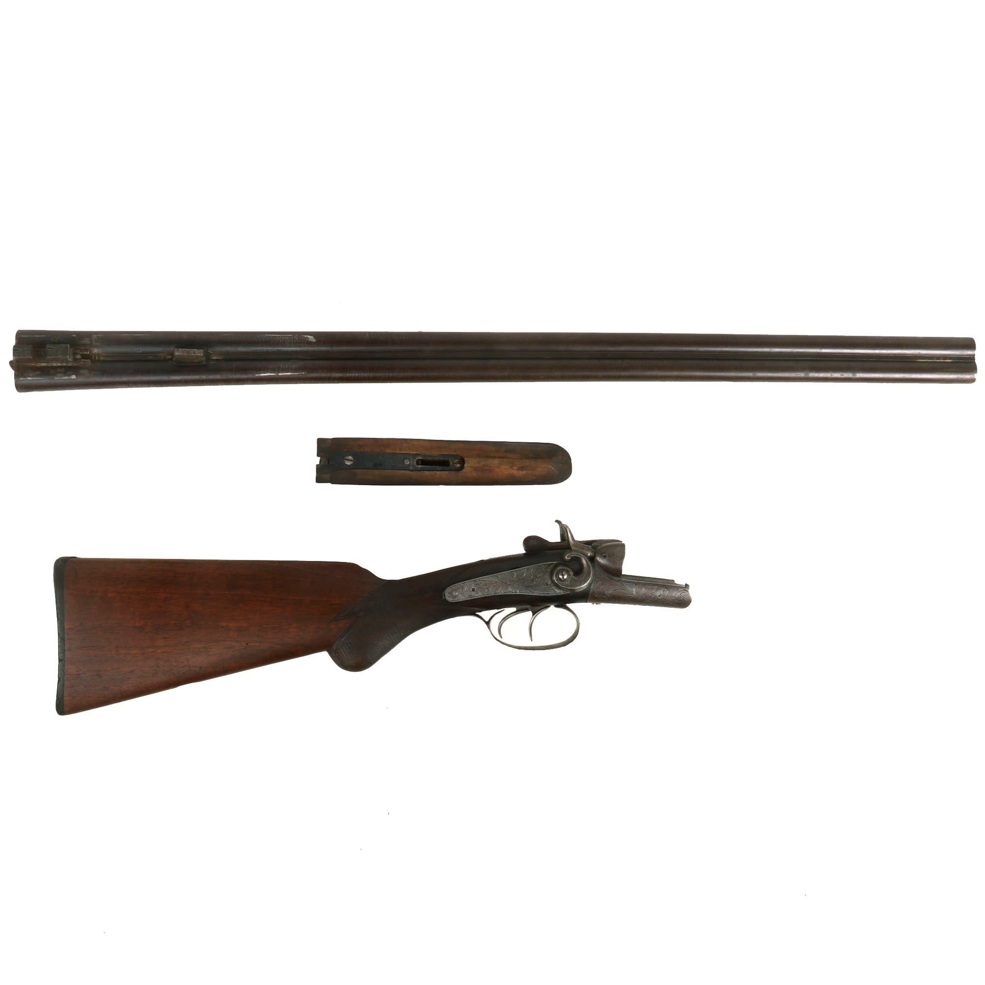 We believe that this somewhat upmarket example was most likely made around 1890, when the import market was booming. It features a lovely "pistol grip" rear stock and fore stock, both of which have some lovely checkering in the grip area. It also has some lovely floral engraving on all of the metal fittings, which is still very well retained. It is still marked on the matte rib between the barrels with: